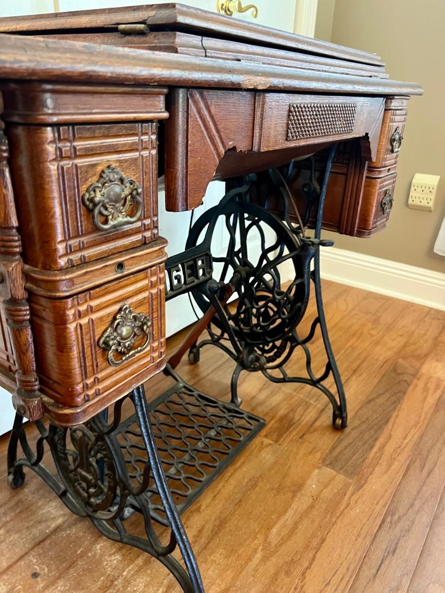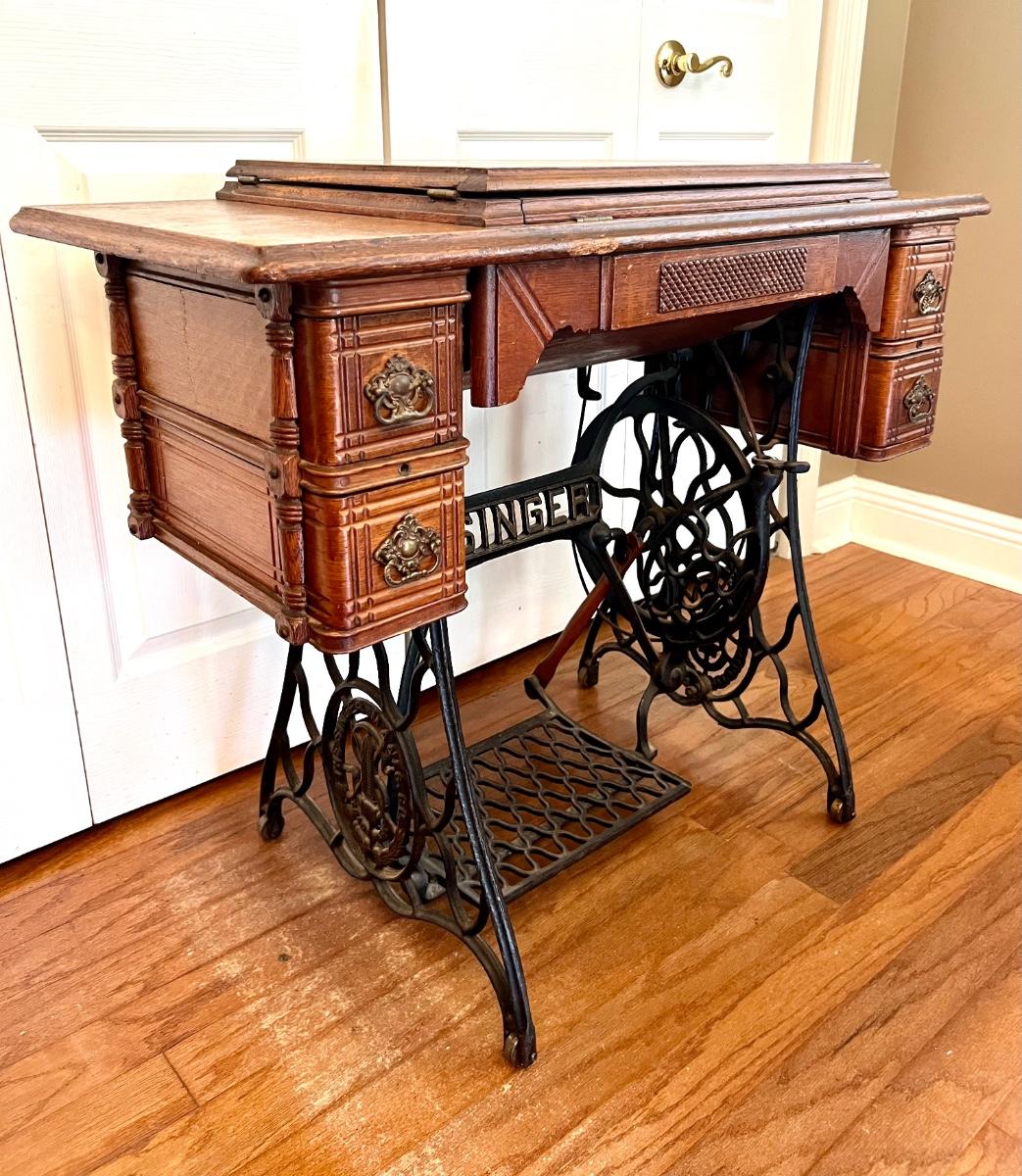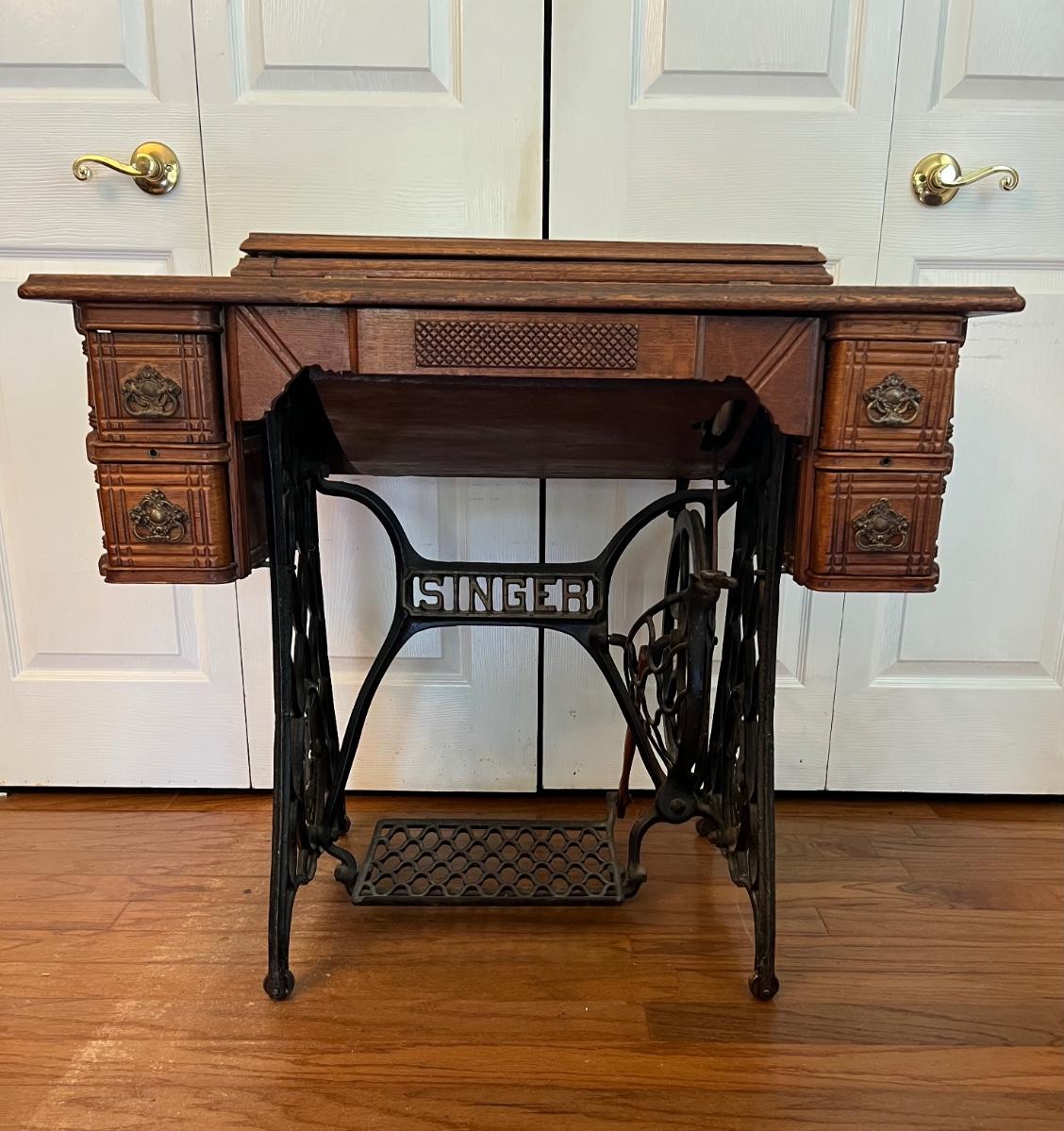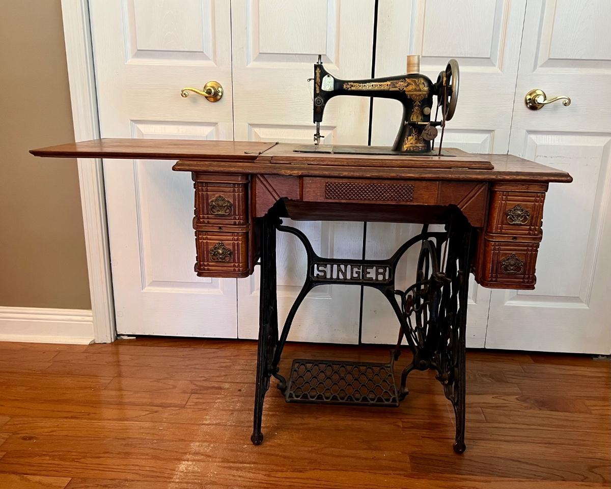 ANTIQUE SINGER SEWING MACHINE. Beautifully detailed. Measures 31 inches tall, 36 inches long and 18 inches deep. 50 inches wide when opened. Not tested.