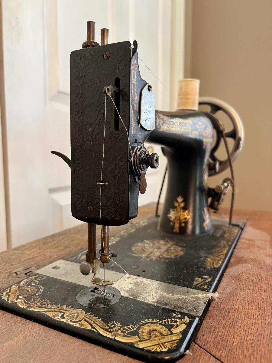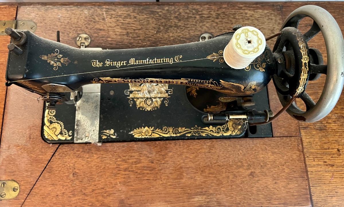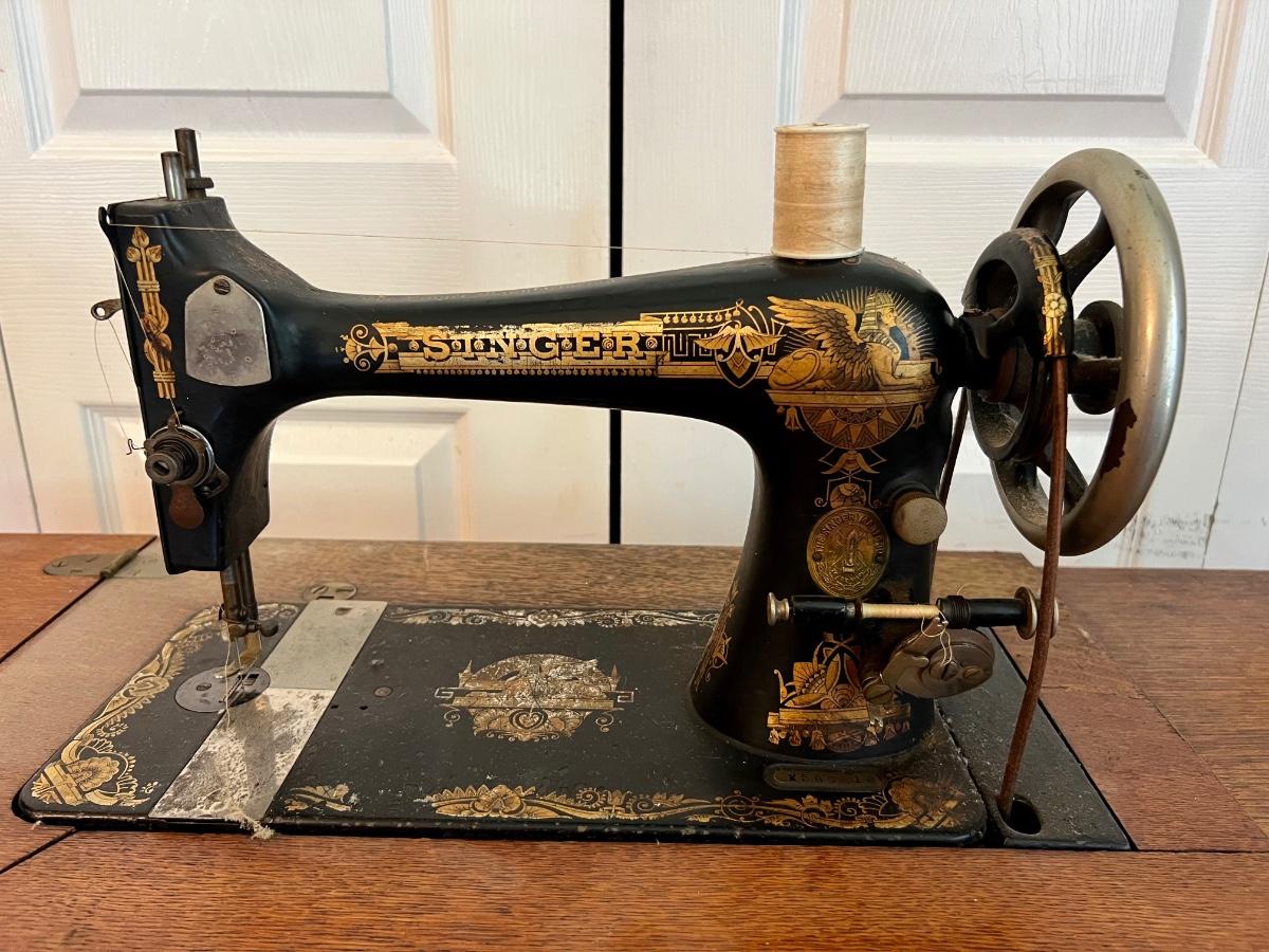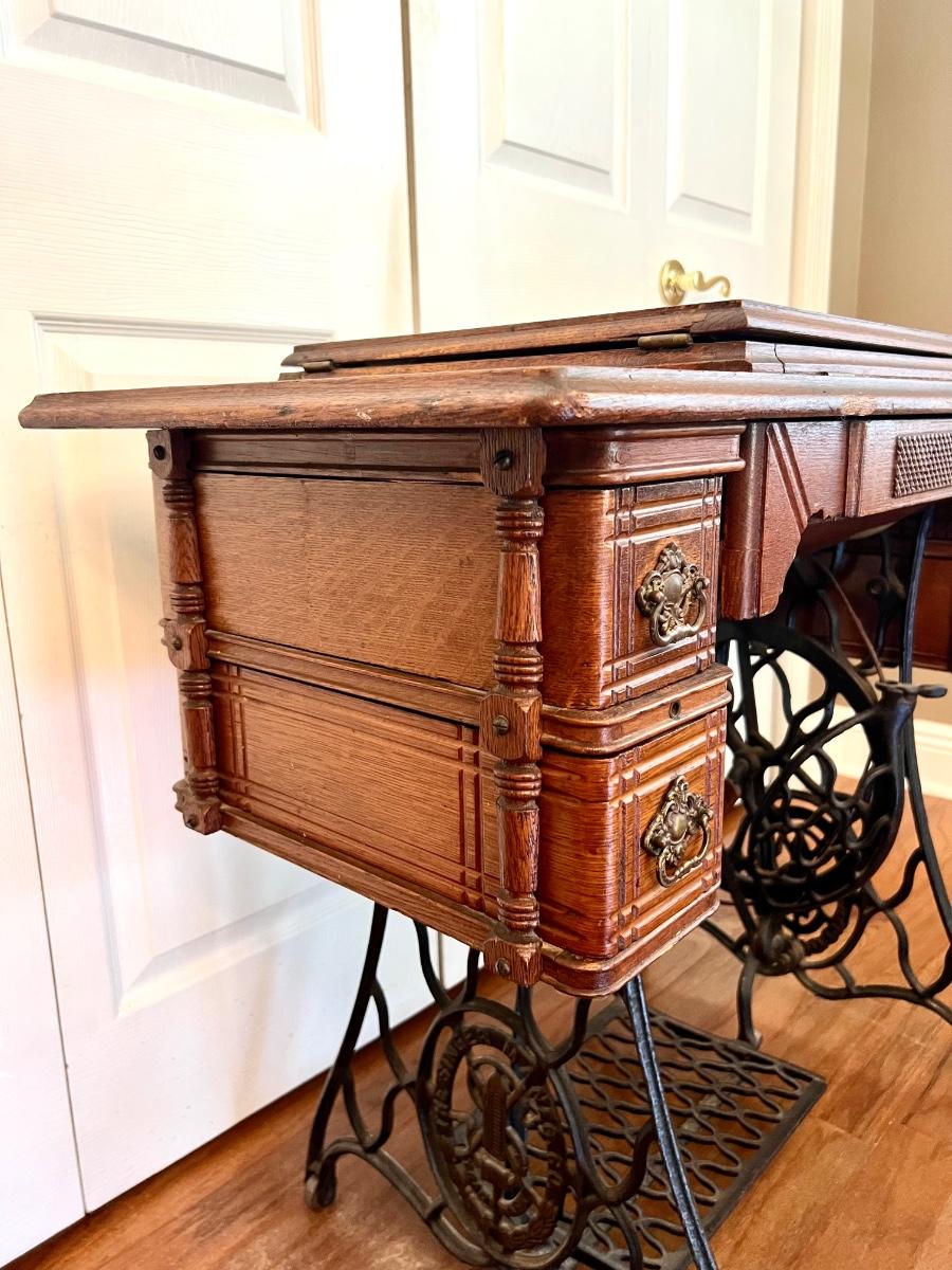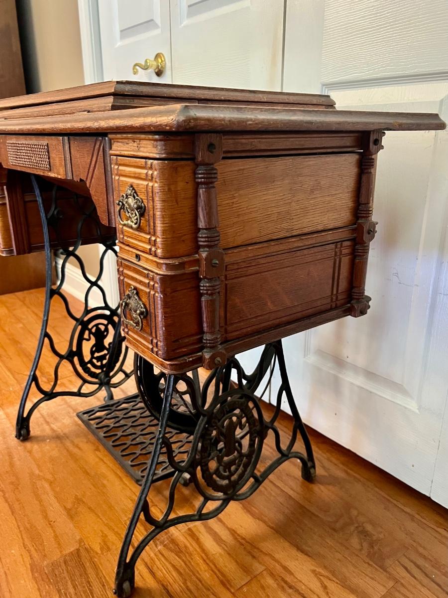 ANTIQUE SINGER SEWING MACHINE. Beautifully detailed. Measures 31 inches tall, 36 inches long and 18 inches deep. 50 inches wide when opened. Not tested.