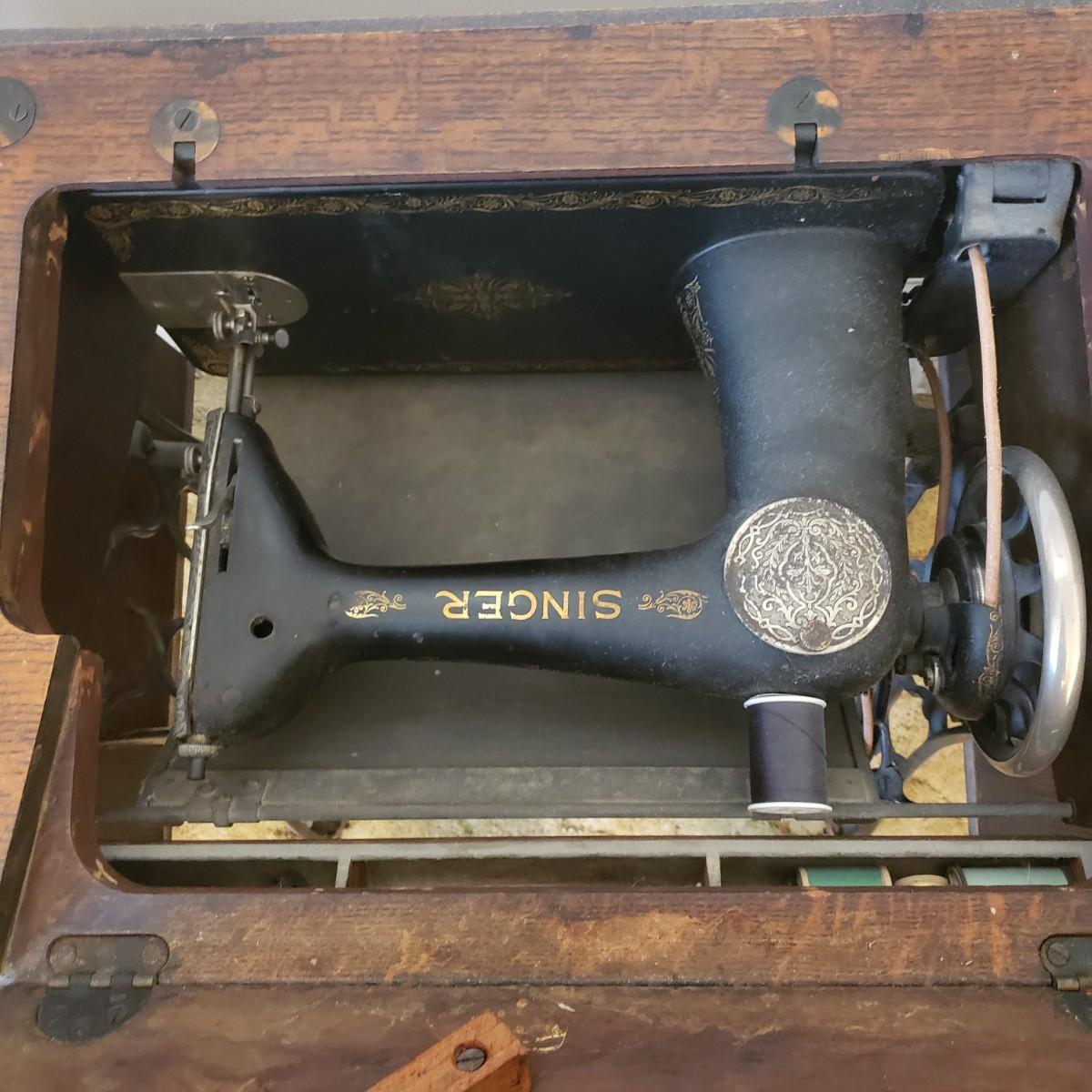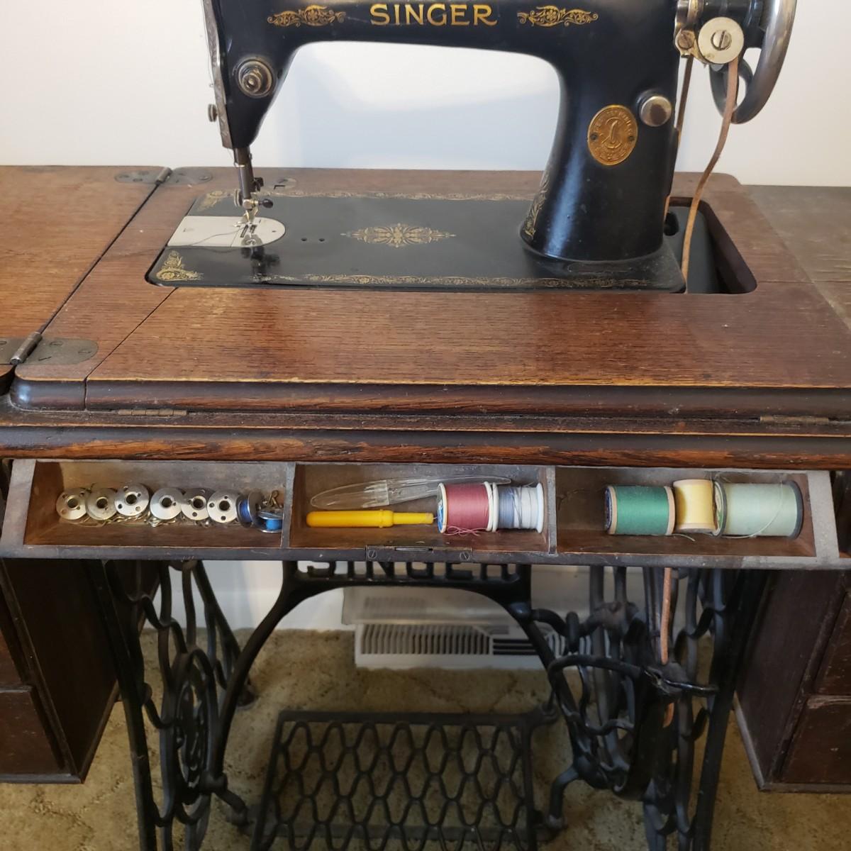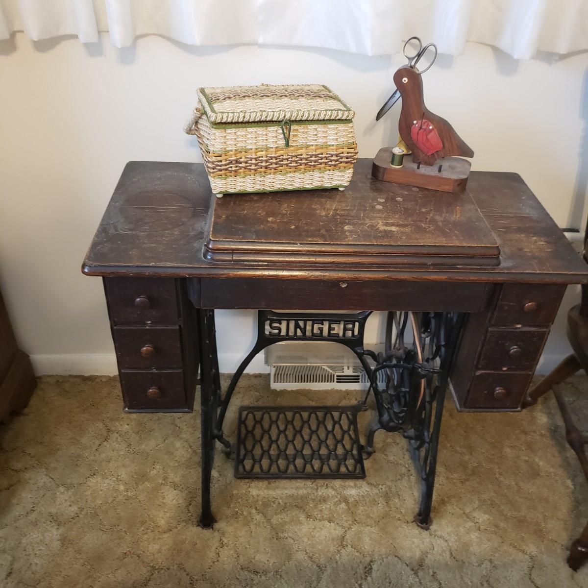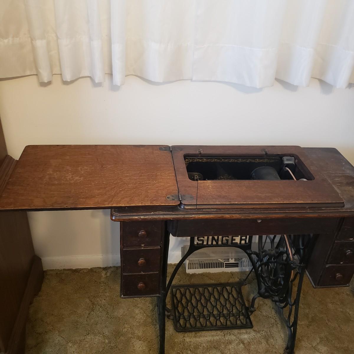 This is a Singer sewing machine in cabinet. The machine started moving when tested. The base is cast iron and the wood finish shows wear, yet has many years left! The cabinet has seven drawers with sewing supplies, see pictures. Table comes with a sewing basket and wooden bird sewing helper. Table measures 34" x 16" x 30"H. When the table is unfolded the top measures 46". At 99 years old, this machine is one year short of an antique!