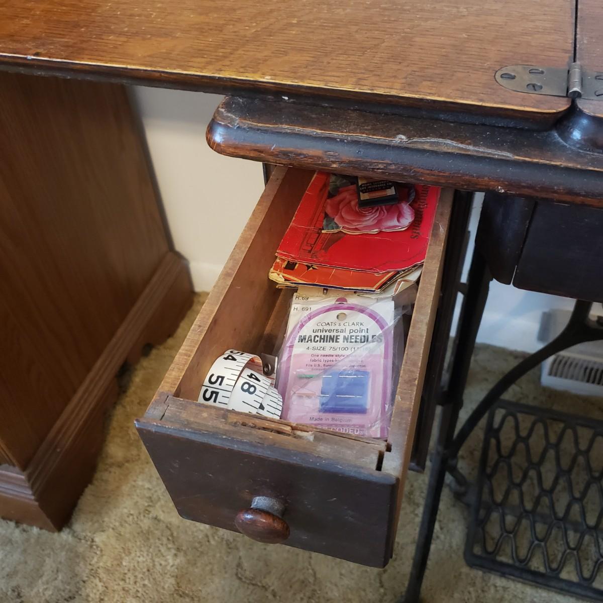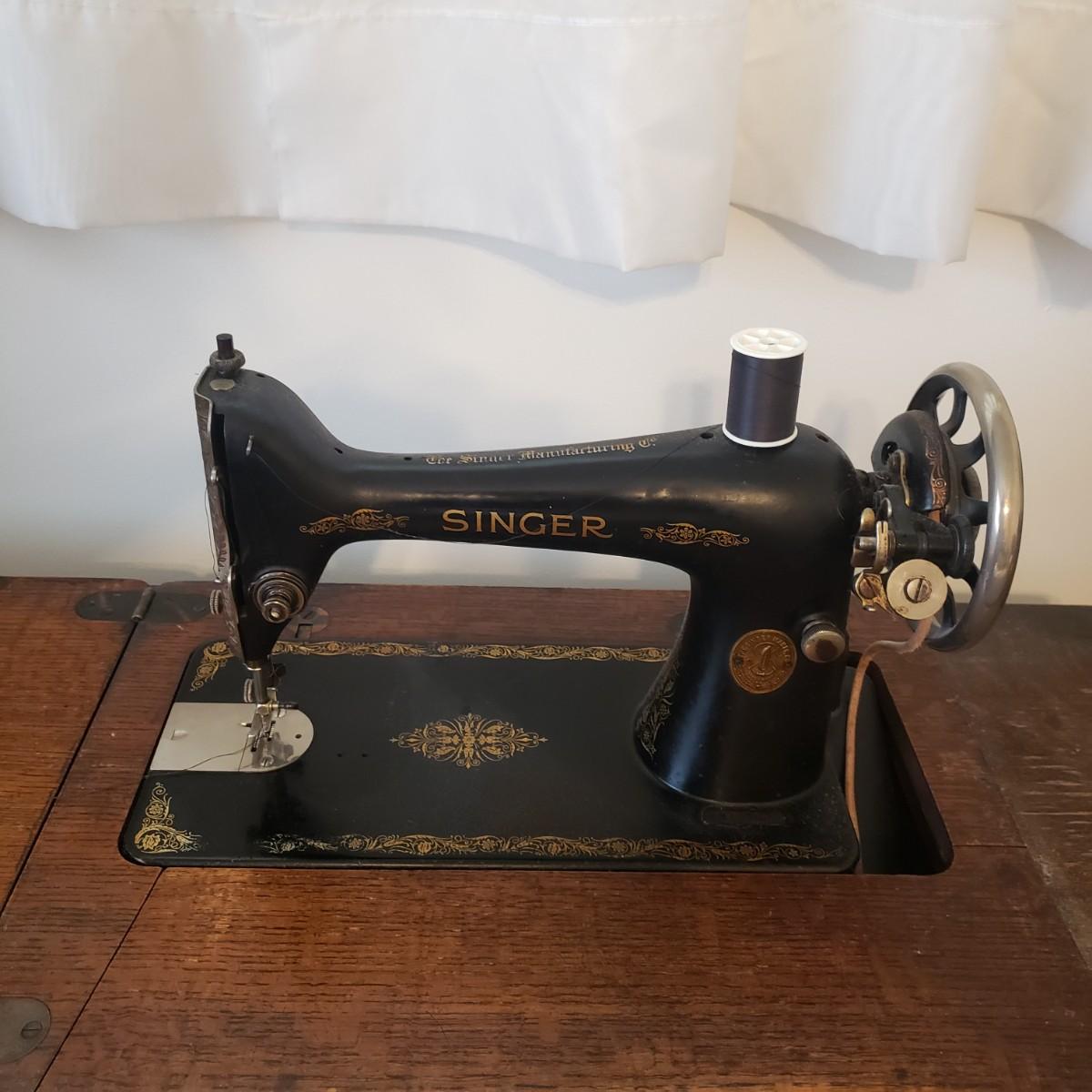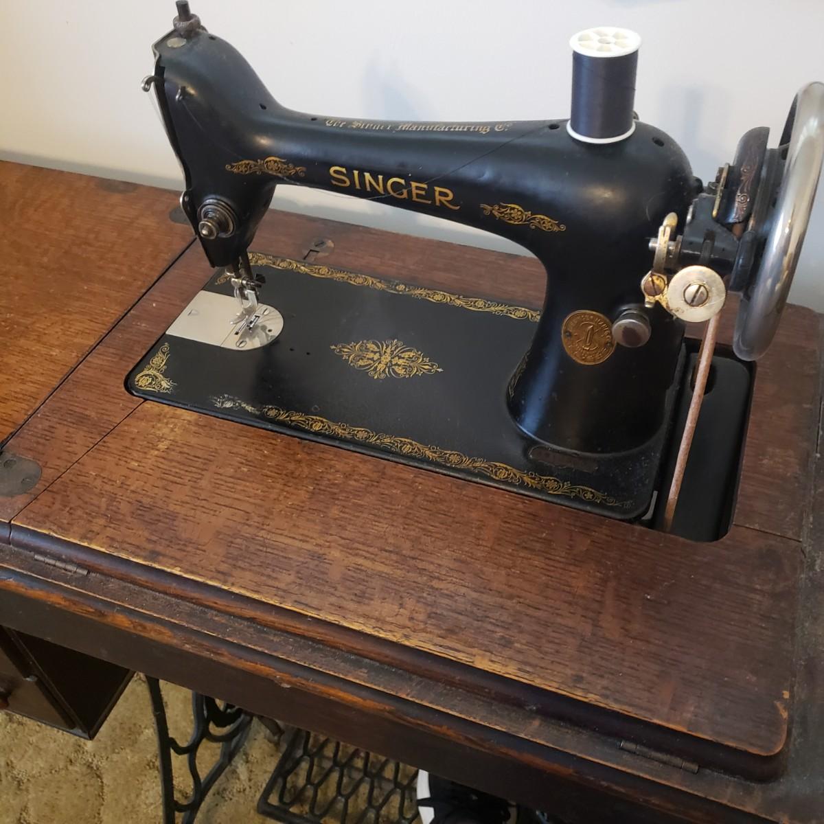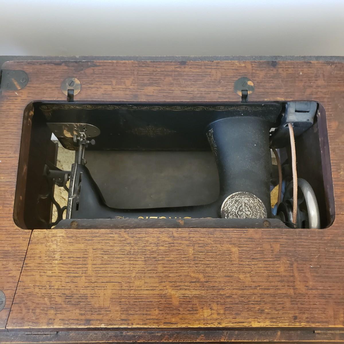 This is a Singer sewing machine in cabinet. The machine started moving when tested. The base is cast iron and the wood finish shows wear, yet has many years left! The cabinet has seven drawers with sewing supplies, see pictures. Table comes with a sewing basket and wooden bird sewing helper. Table measures 34" x 16" x 30"H. When the table is unfolded the top measures 46". At 99 years old, this machine is one year short of an antique!