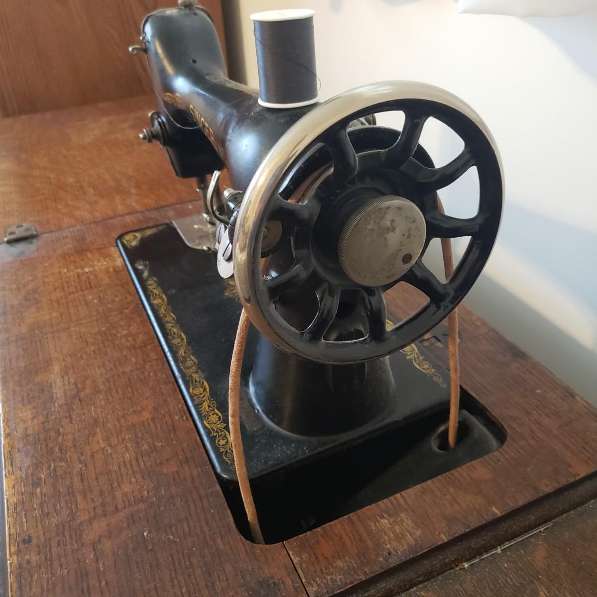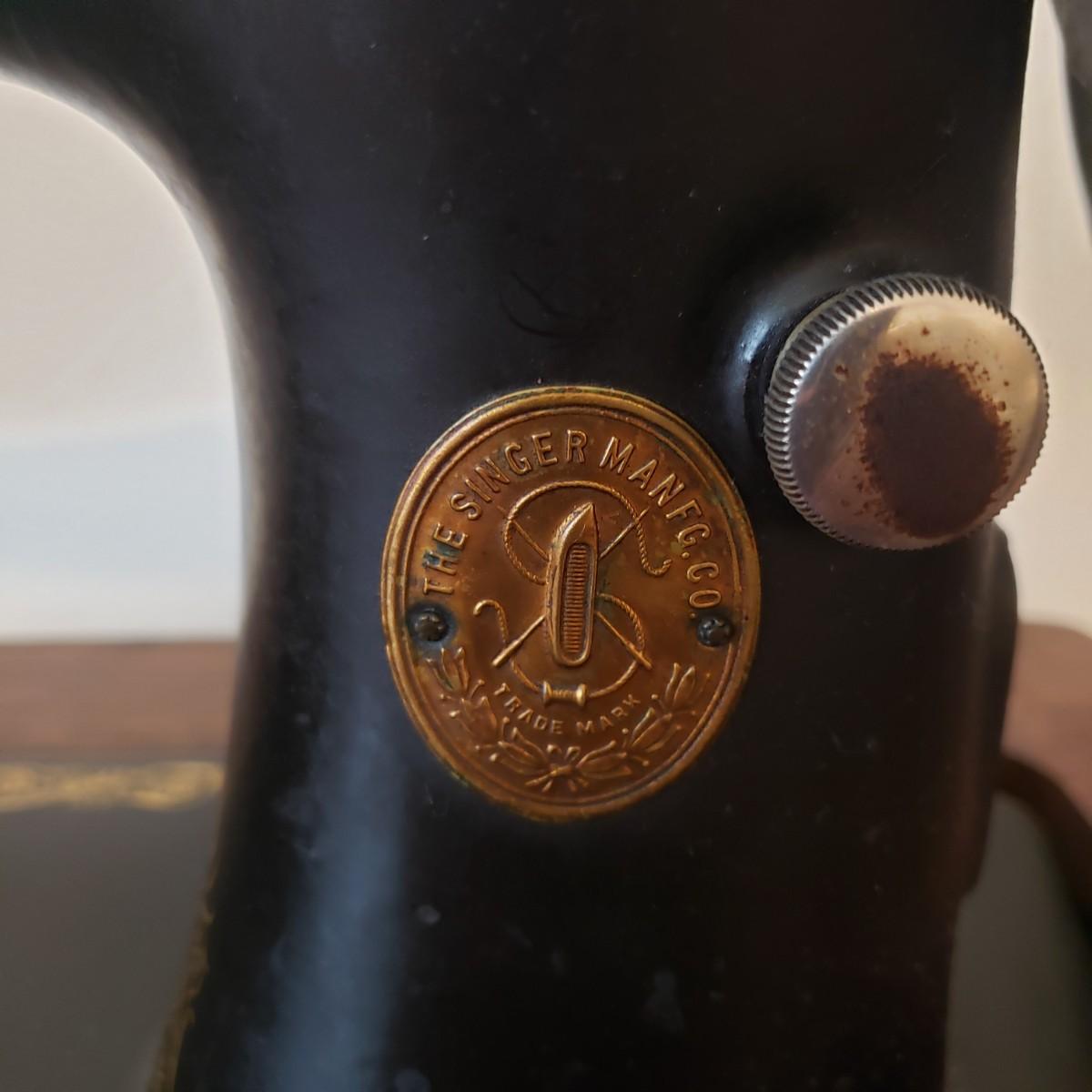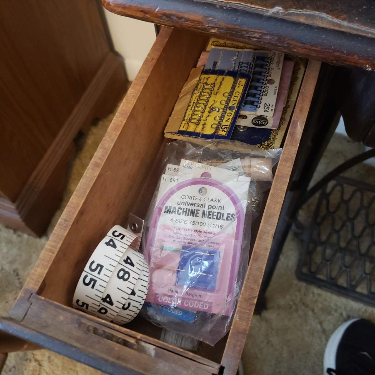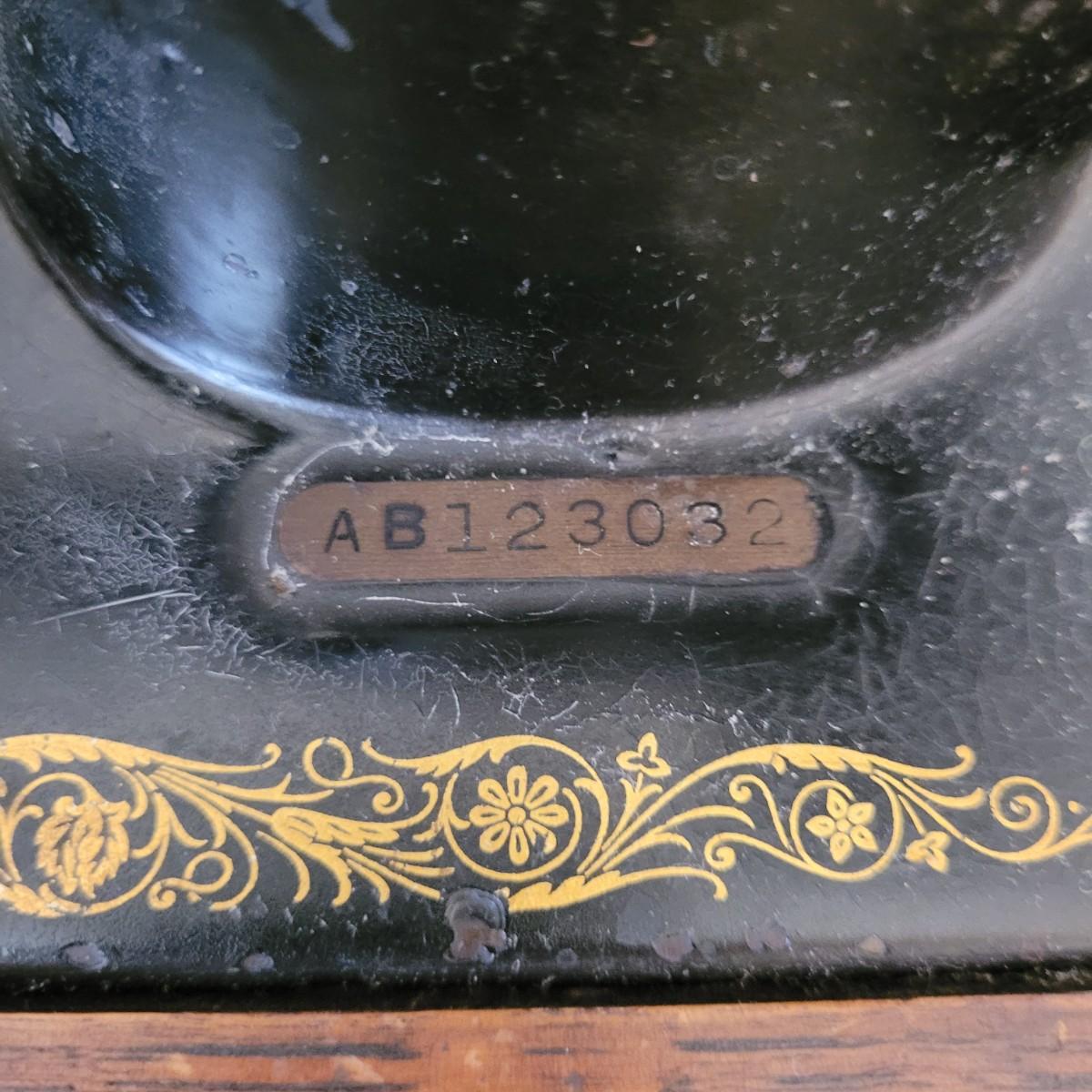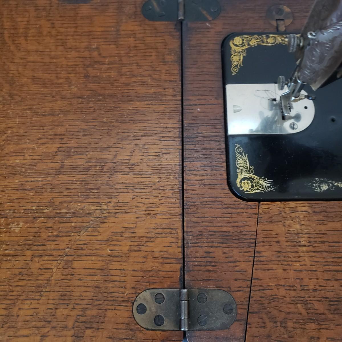 This is a Singer sewing machine in cabinet. The machine started moving when tested. The base is cast iron and the wood finish shows wear, yet has many years left! The cabinet has seven drawers with sewing supplies, see pictures. Table comes with a sewing basket and wooden bird sewing helper. Table measures 34" x 16" x 30"H. When the table is unfolded the top measures 46". At 99 years old, this machine is one year short of an antique!