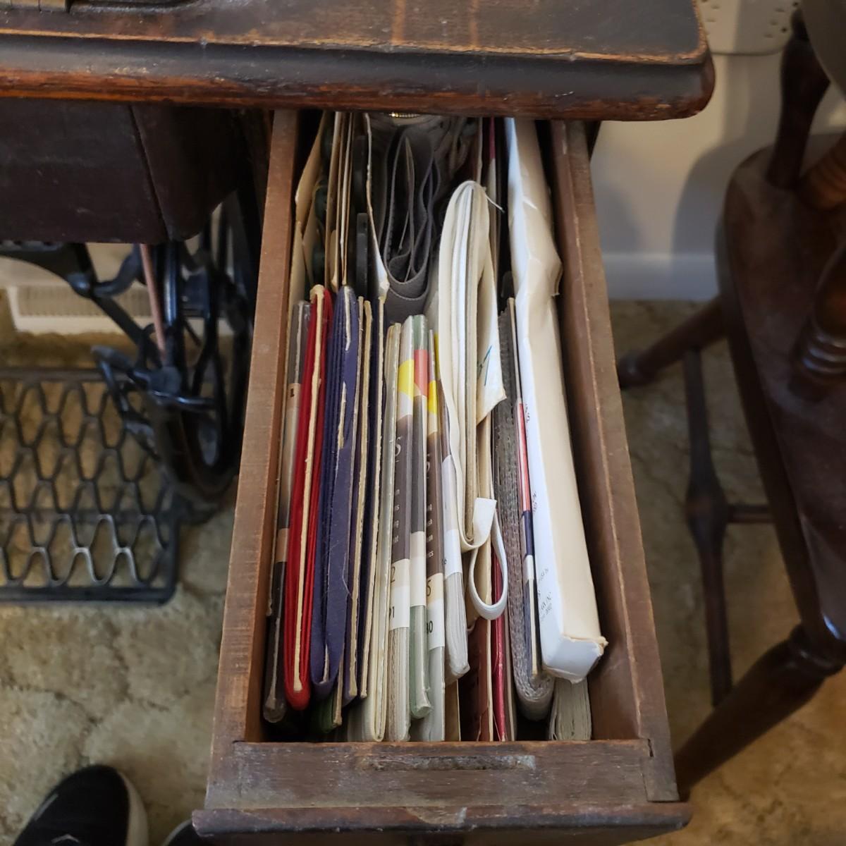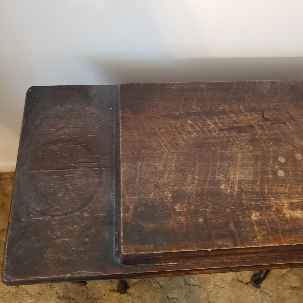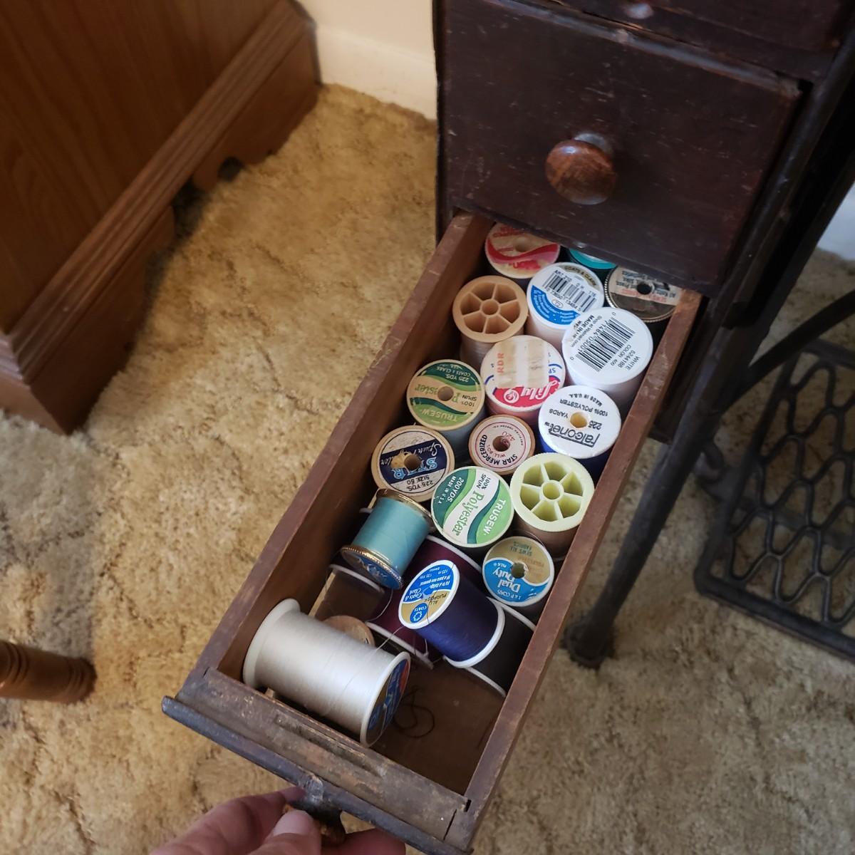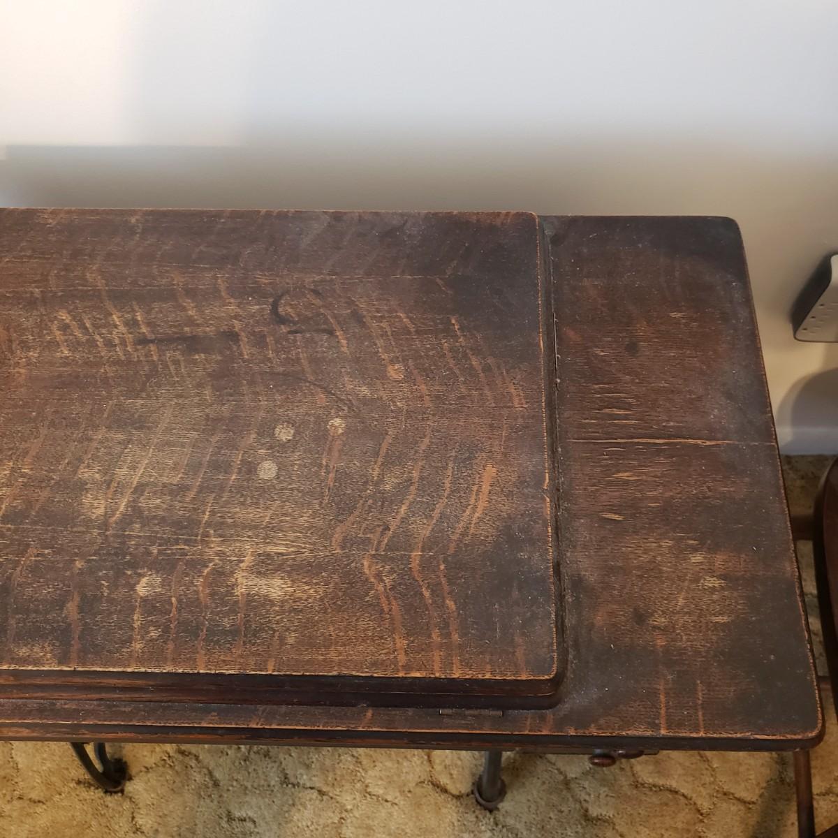 This is a Singer sewing machine in cabinet. The machine started moving when tested. The base is cast iron and the wood finish shows wear, yet has many years left! The cabinet has seven drawers with sewing supplies, see pictures. Table comes with a sewing basket and wooden bird sewing helper. Table measures 34" x 16" x 30"H. When the table is unfolded the top measures 46". At 99 years old, this machine is one year short of an antique!