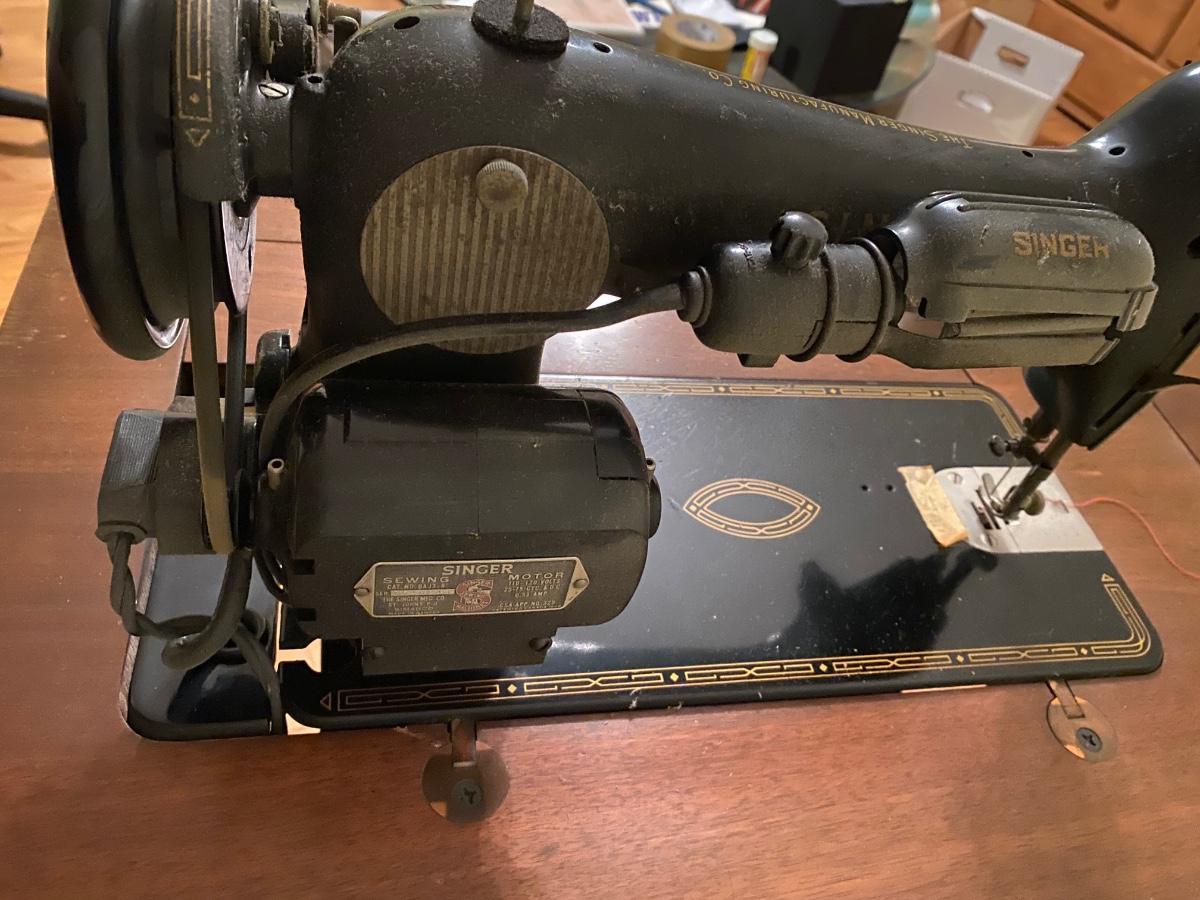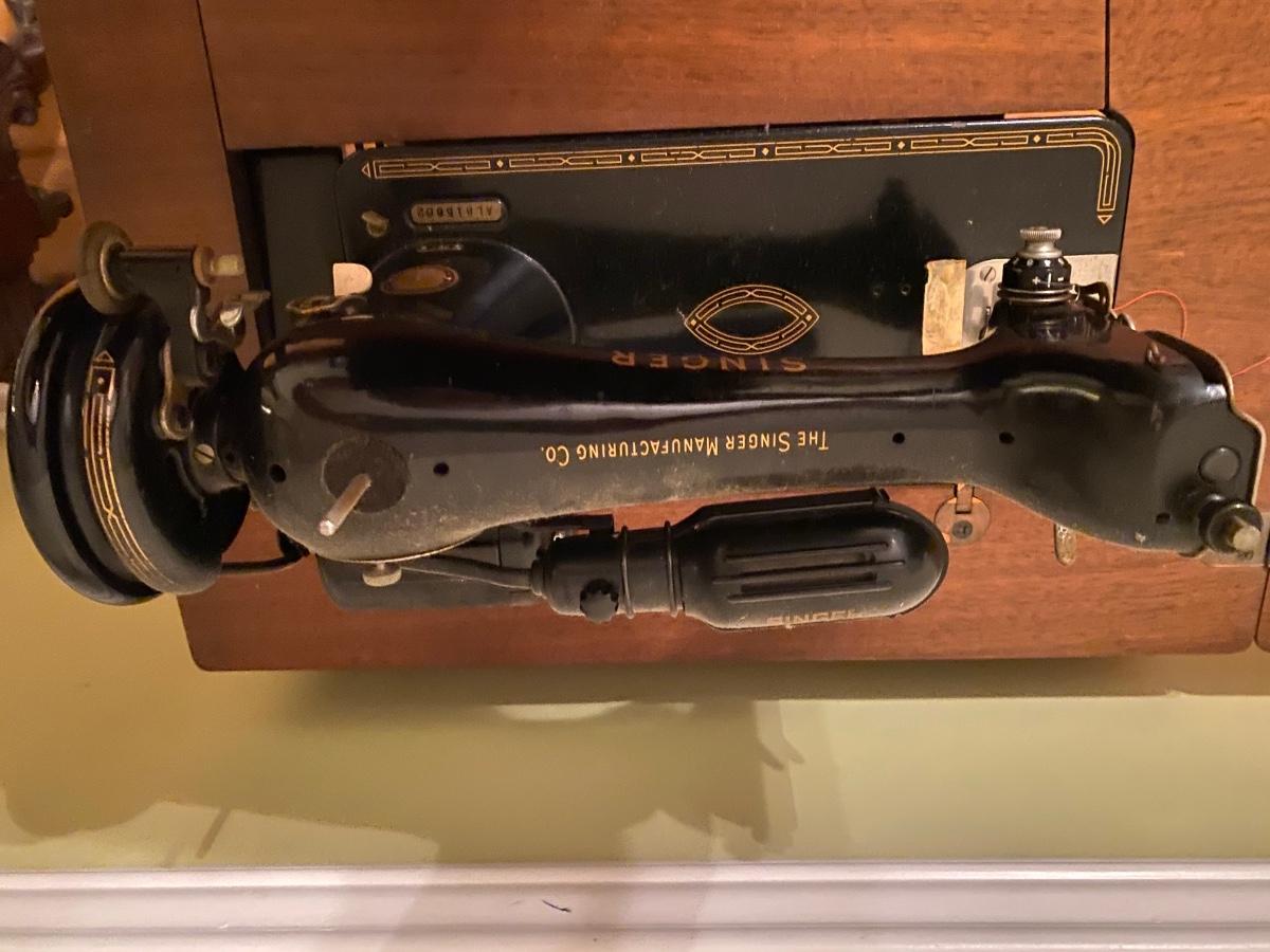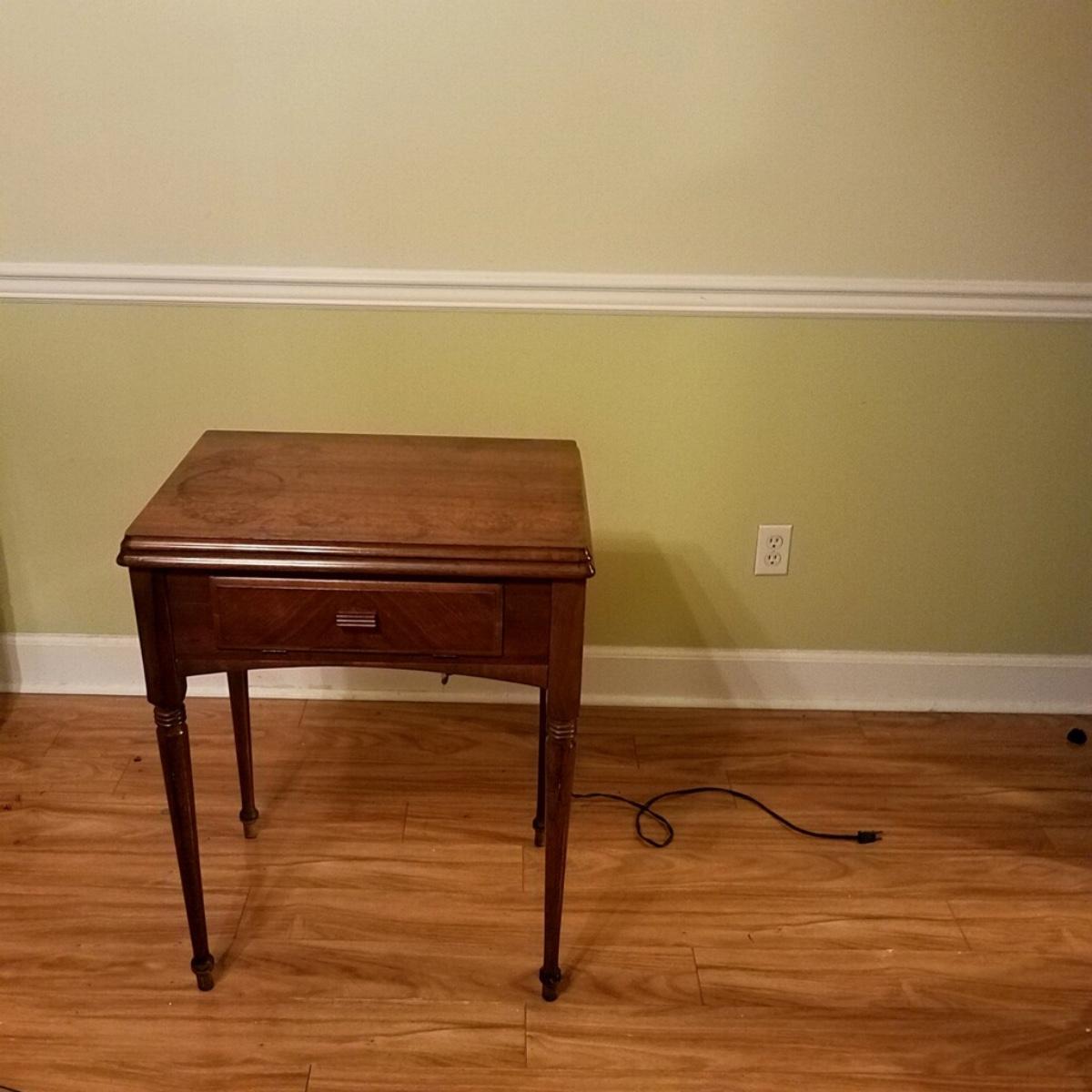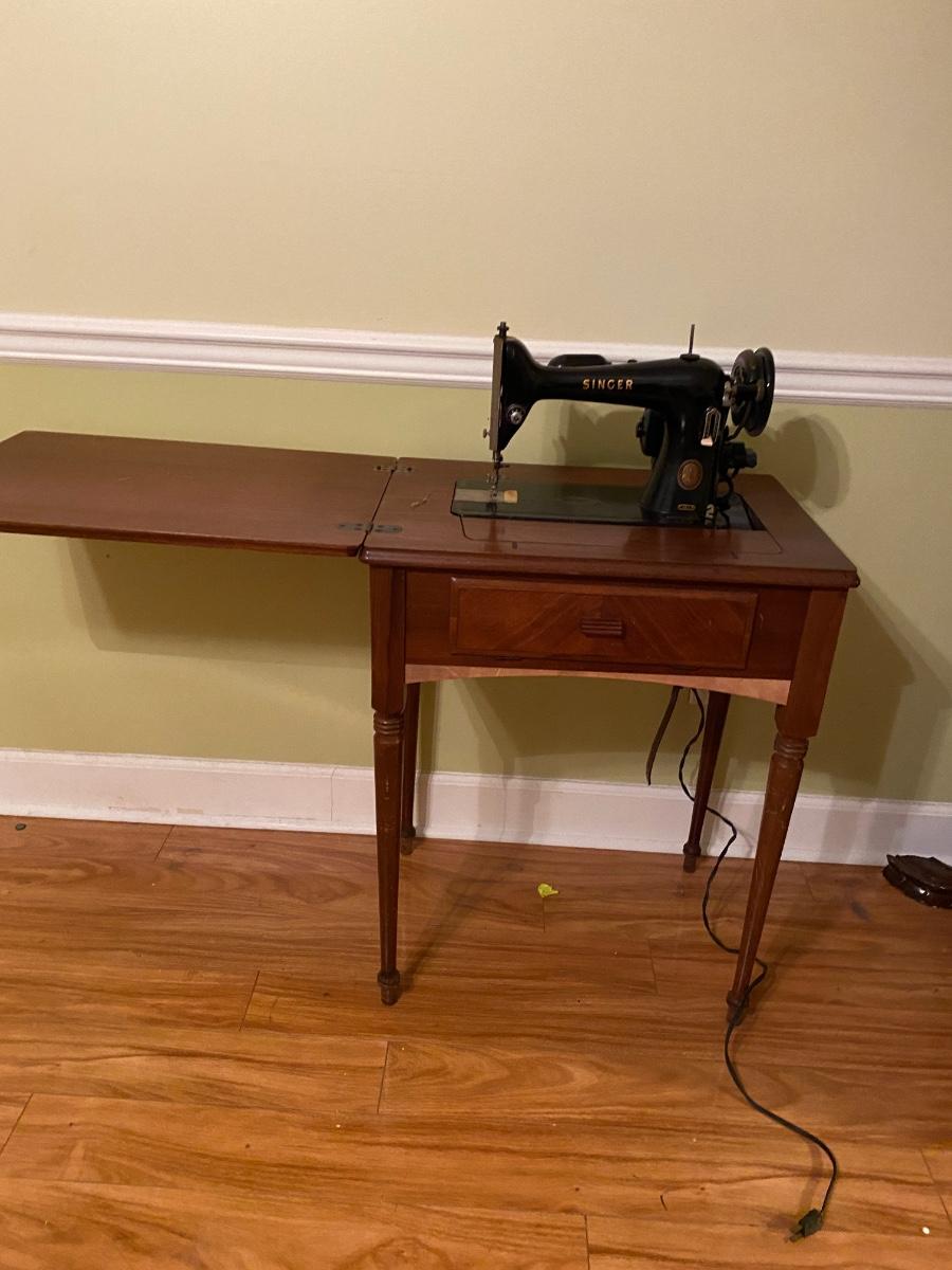Antique Singer sewing machine in cabinet. It works; I’m sure I could use a tune-up. Top of the cabinet has some scratches and veneer loss bottom front (see pics)
