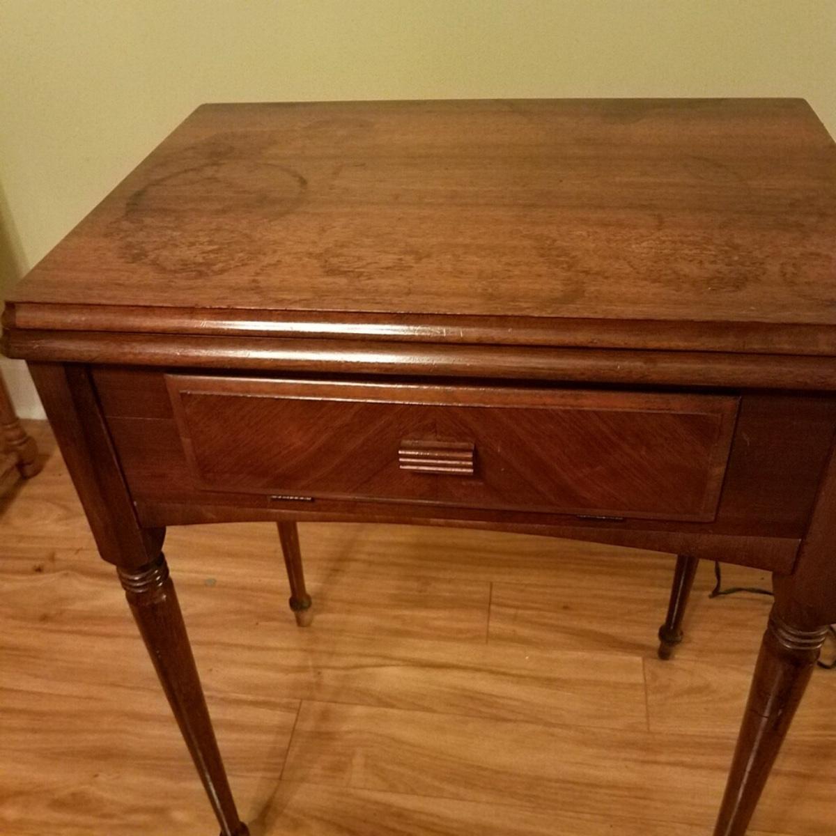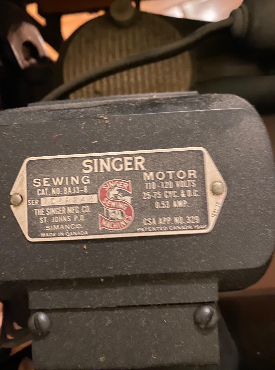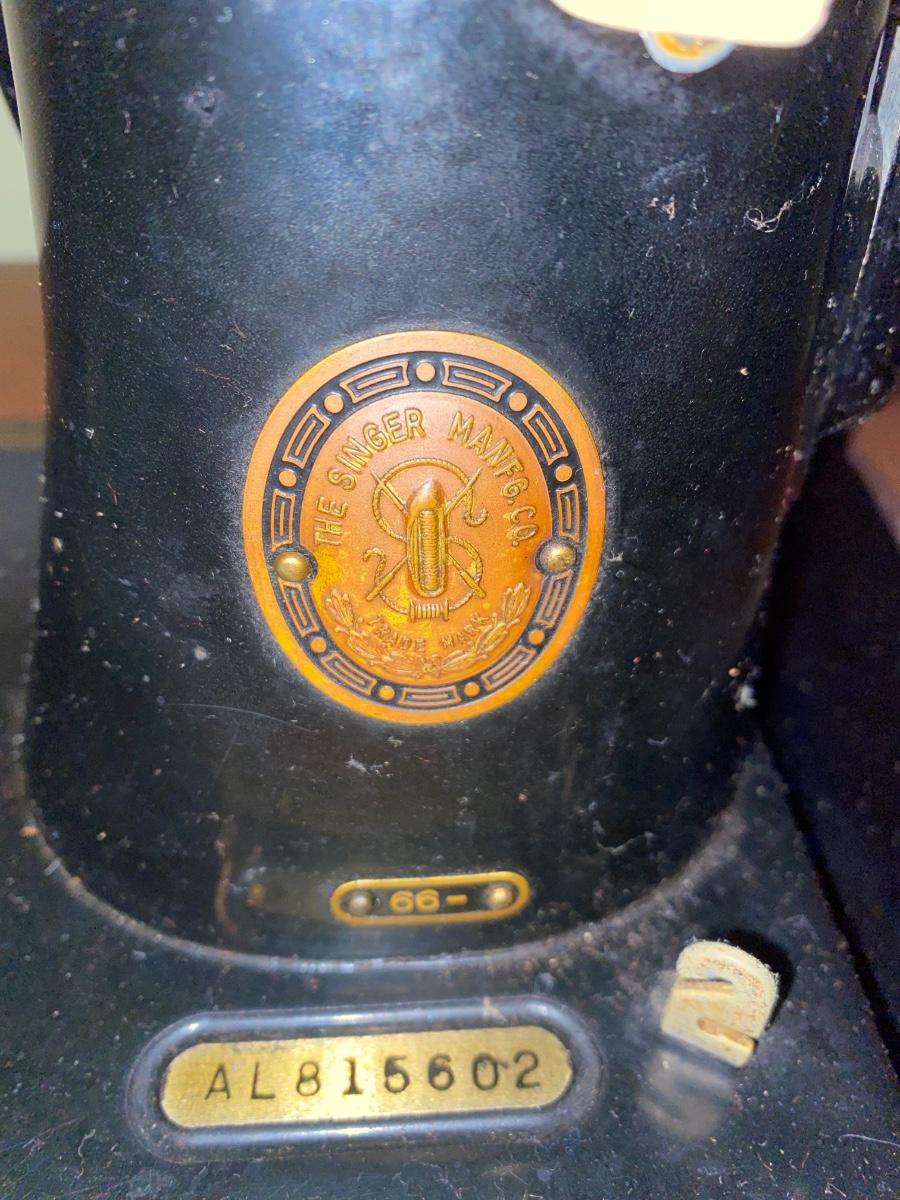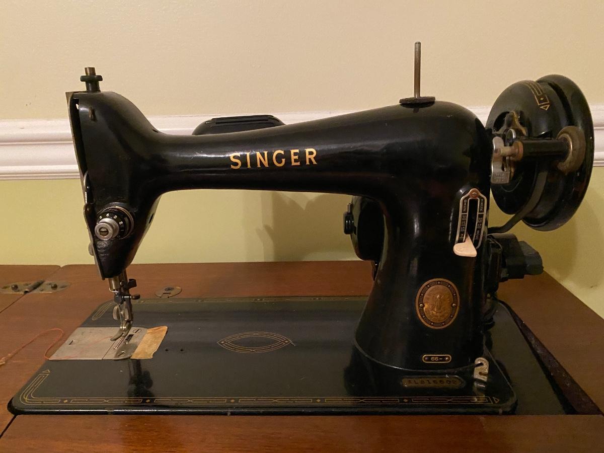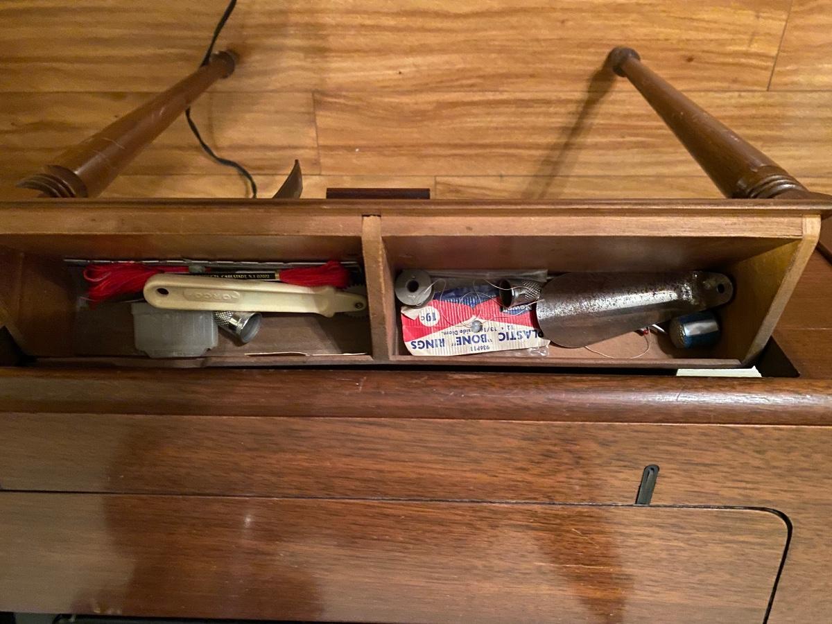 Antique Singer sewing machine in cabinet. It works; I’m sure I could use a tune-up. Top of the cabinet has some scratches and veneer loss bottom front (see pics)