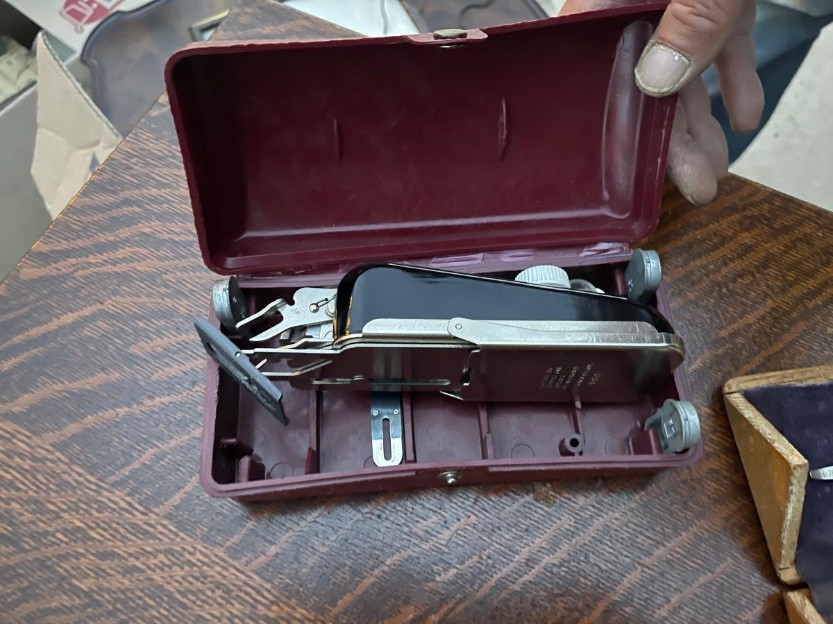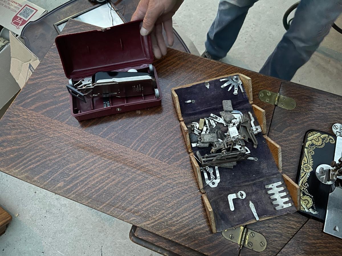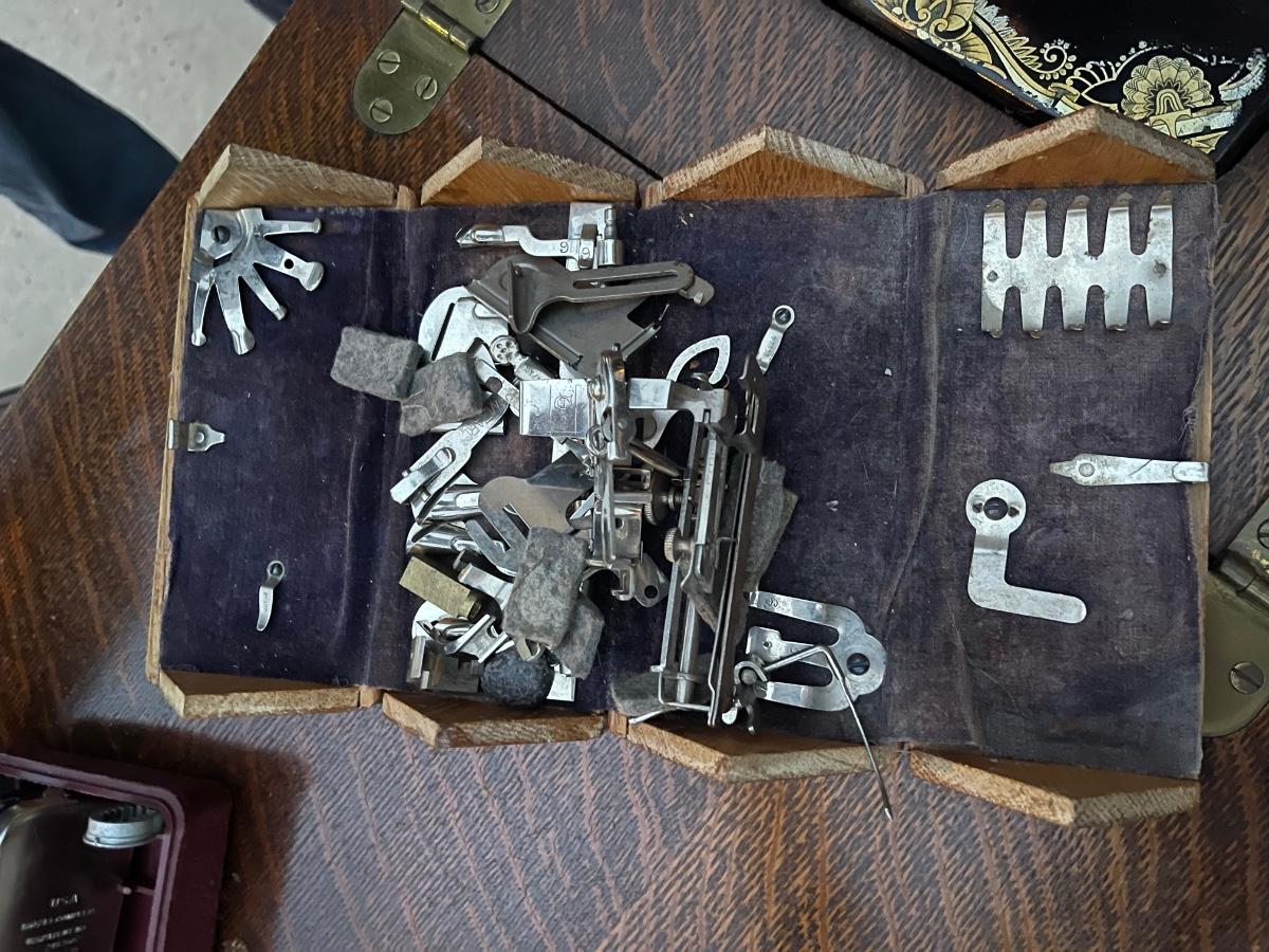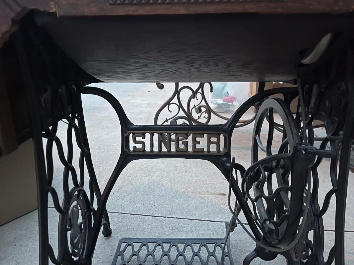 Antique Singer Sewing Machine Table Plus Sewing Accoutrements (Lot of 4). Sewing machine with original table and foot pedal, cast iron and wood details. Also includes folding wooden box of different sewing feet, Singer buttonhole making foot, and pin cushion.