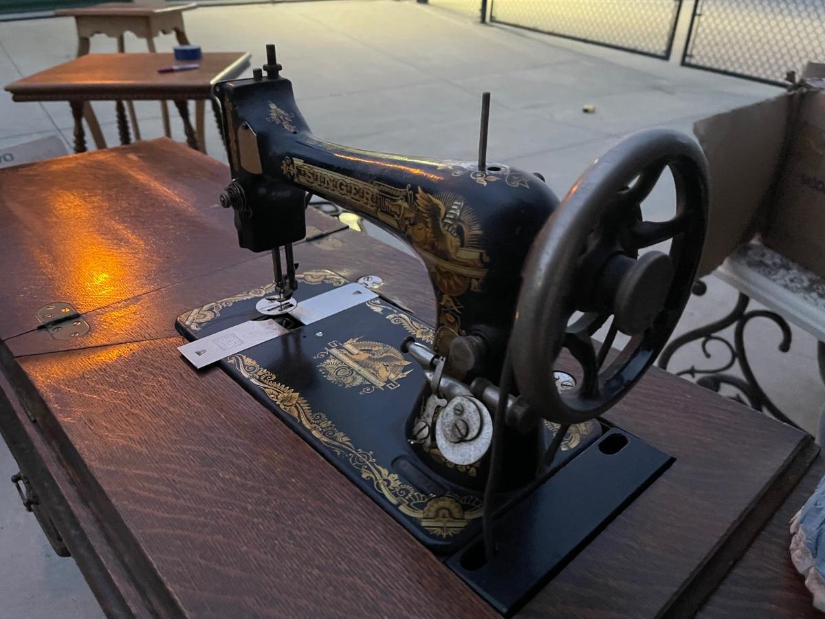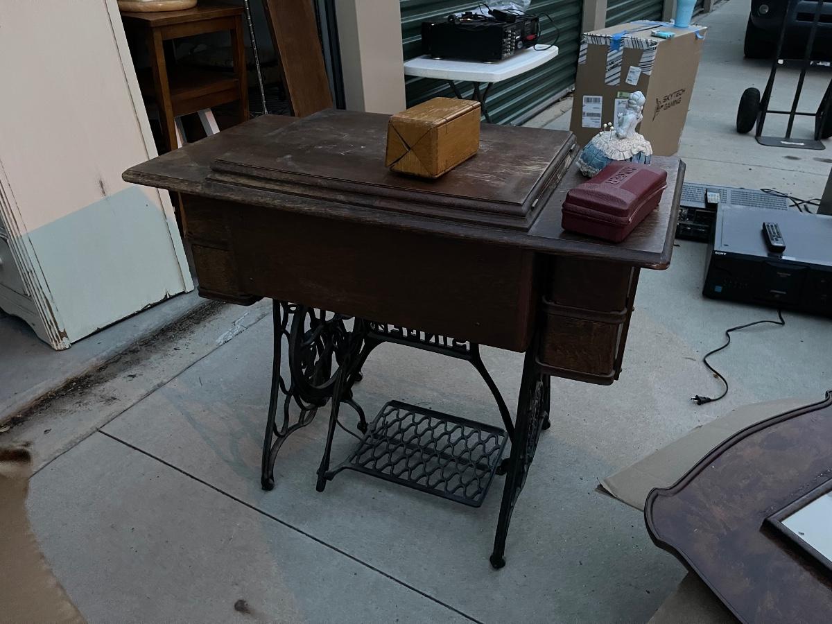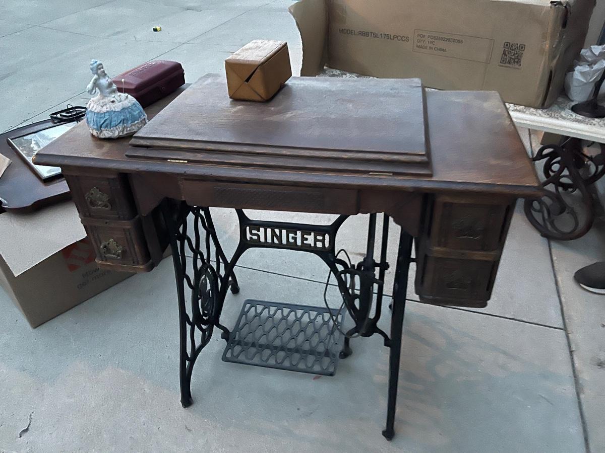 Antique Singer Sewing Machine Table Plus Sewing Accoutrements (Lot of 4)