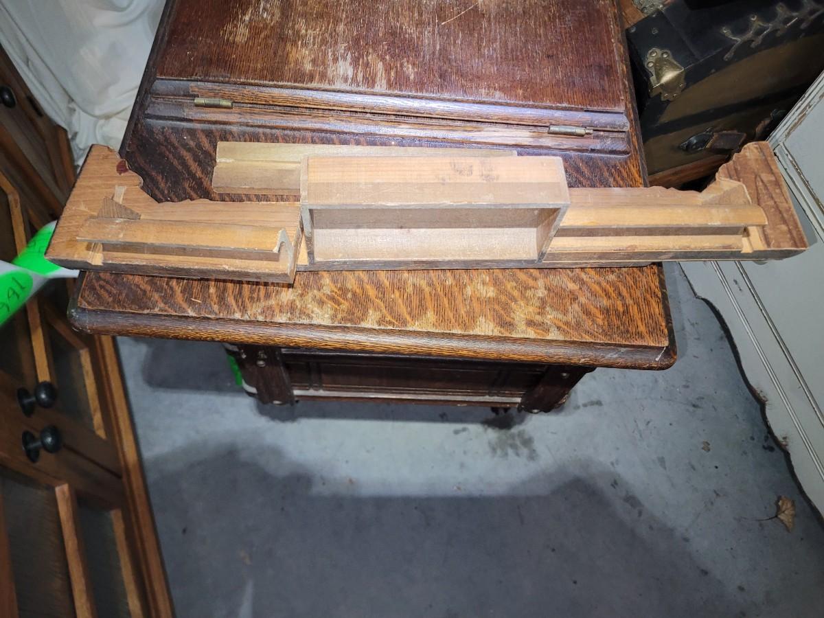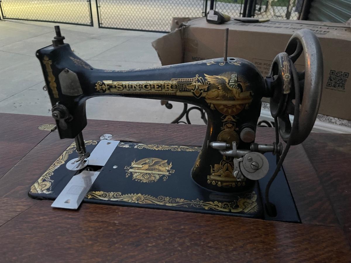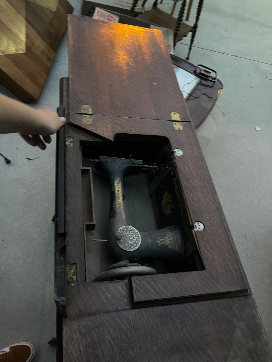 Antique Singer Sewing Machine Table Plus Sewing Accoutrements (Lot of 4)