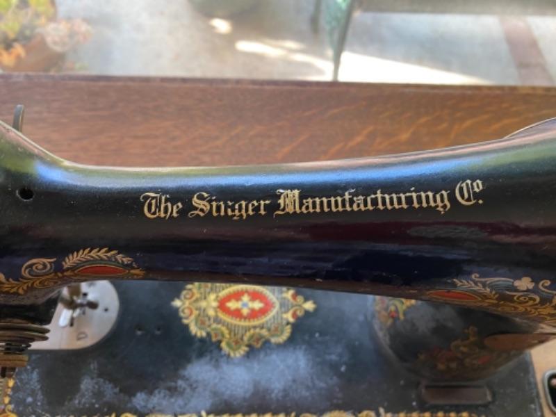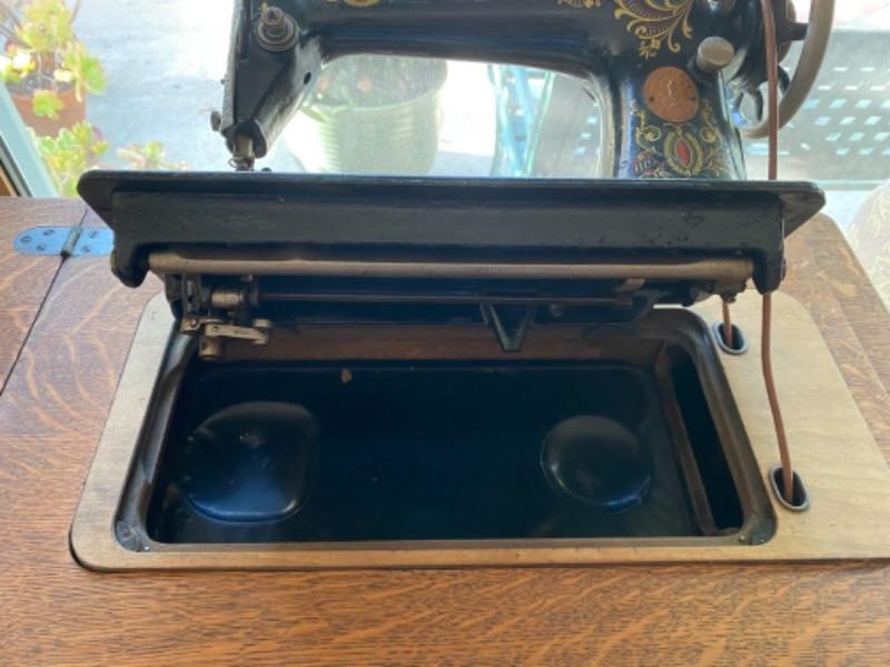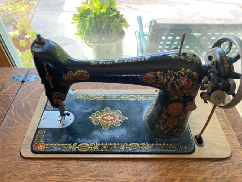 Antique Singer sewing machine with fully enclosed treadle cabinet. This style of cabinet was considered top of line for it's time, all components were fully enclosed when not in use. Push button mechanism for raising and lowering the machine. Doors open up to expose treadle, sewing notion drawers, and spinning pulleys. In very good condition. Machine turns/moves freely. Paint is still bright.
