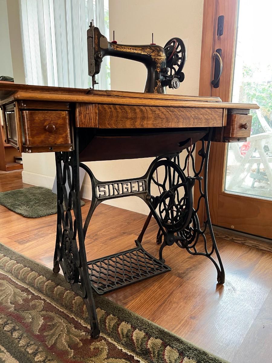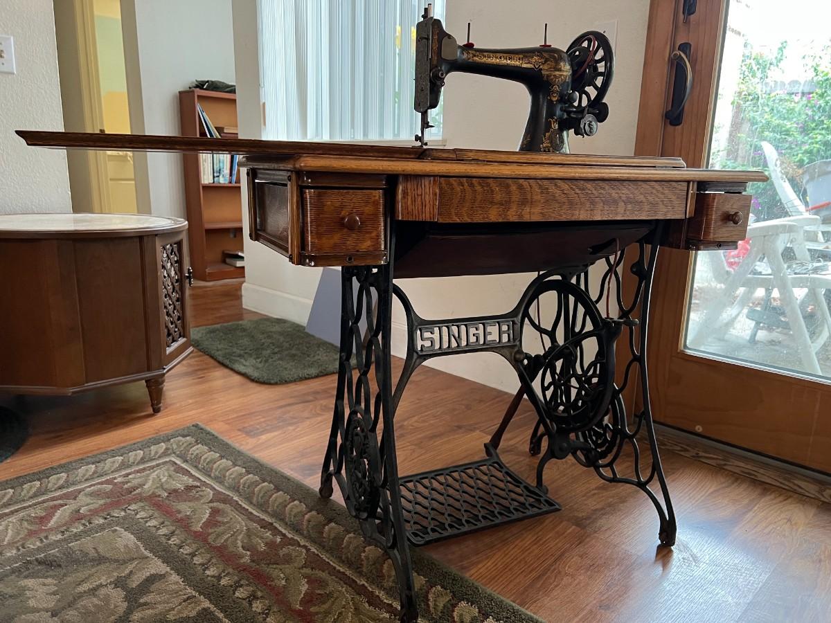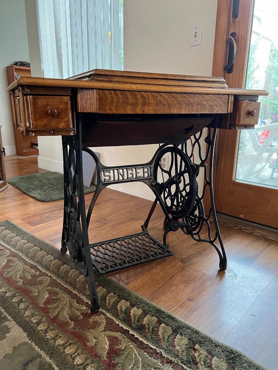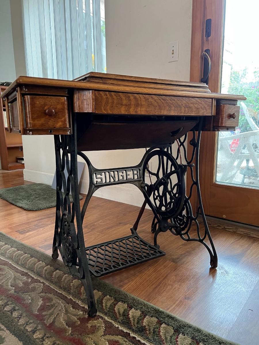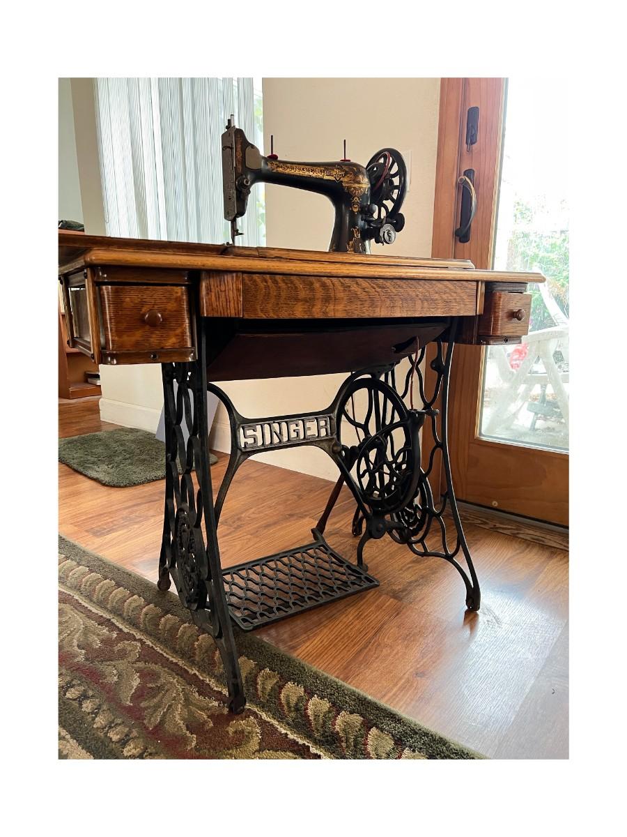 Antique Singer sewing machine with table. Foot treadle powered machine. In good antique condition. Comes with a copy of original manual. Machine number on manual puts this Singer at very early 1900s. Displays nicely, not sure on working condition, may need to be serviced due to age. ITEM LOCATED IN ORANGE; pickup will be coordinated within two weeks of auction close, no date set for pickup.
