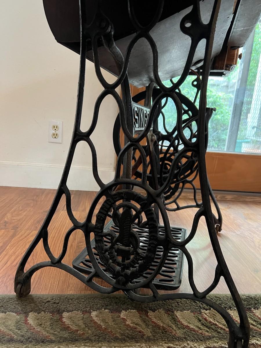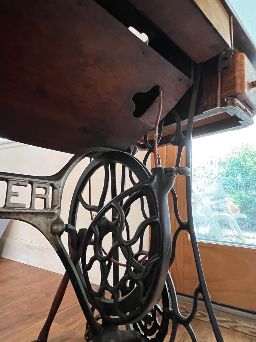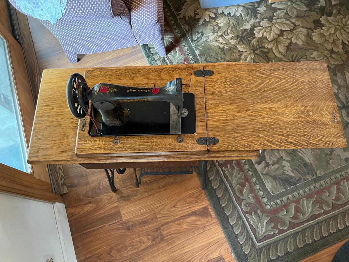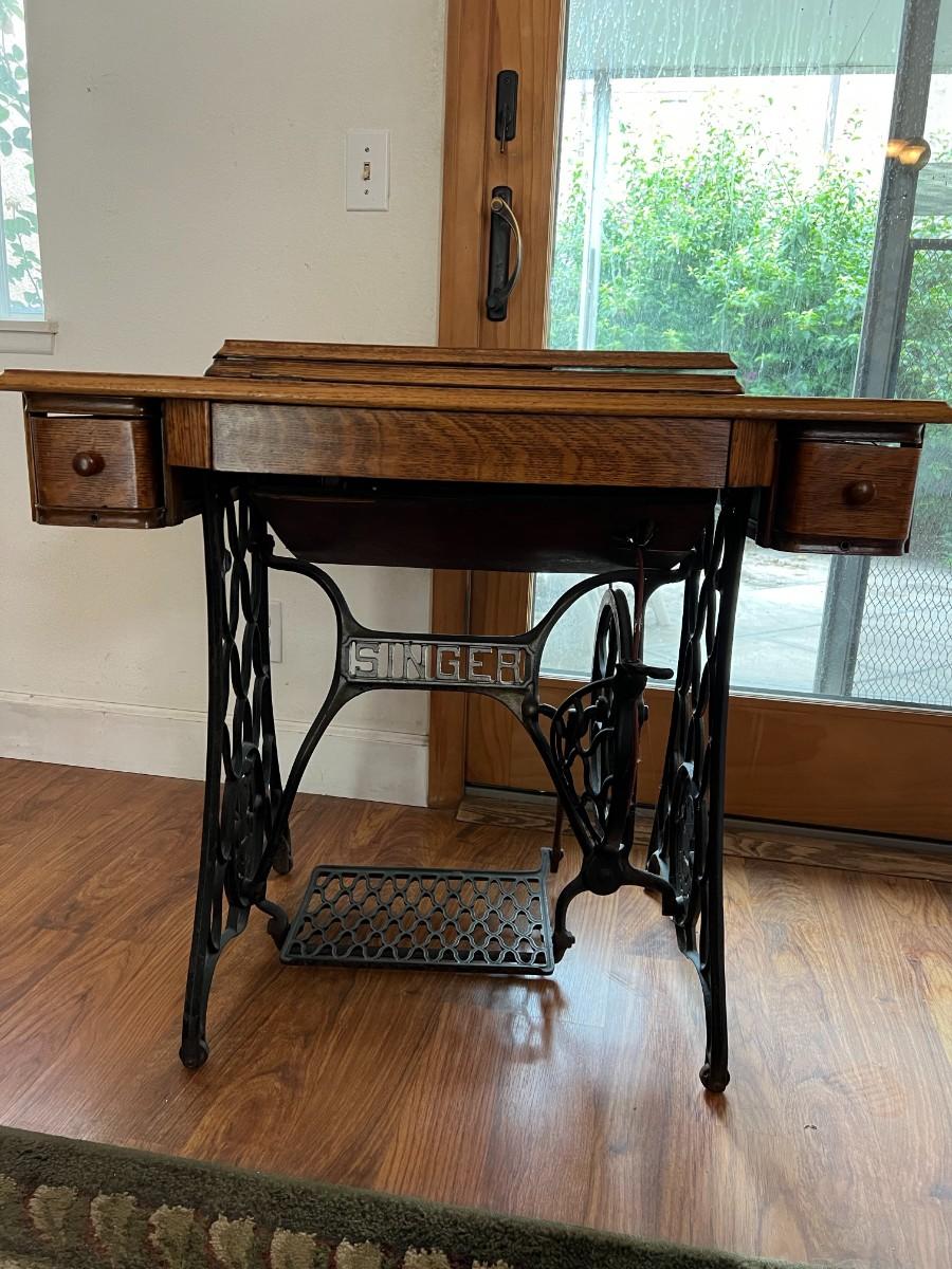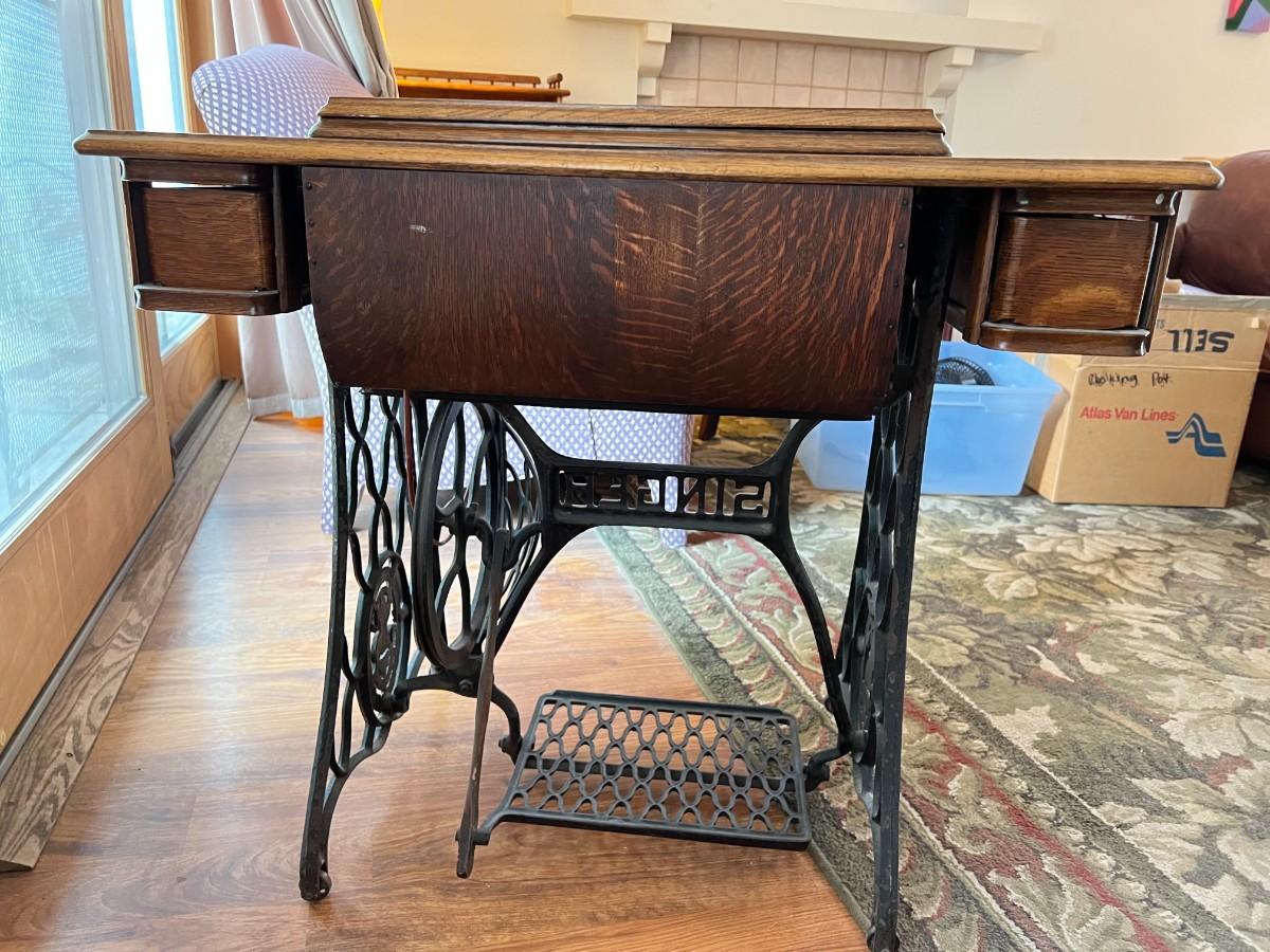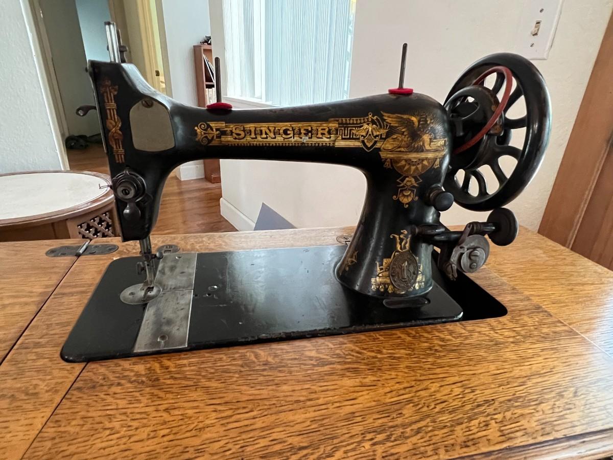 Antique Singer sewing machine with table. Foot treadle powered machine. In good antique condition. Comes with a copy of original manual. Machine number on manual puts this Singer at very early 1900s. Displays nicely, not sure on working condition, may need to be serviced due to age. ITEM LOCATED IN ORANGE; pickup will be coordinated within two weeks of auction close, no date set for pickup.