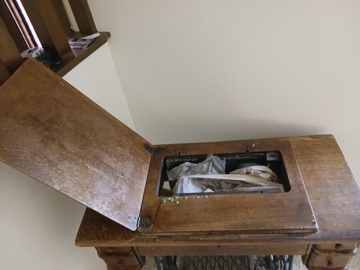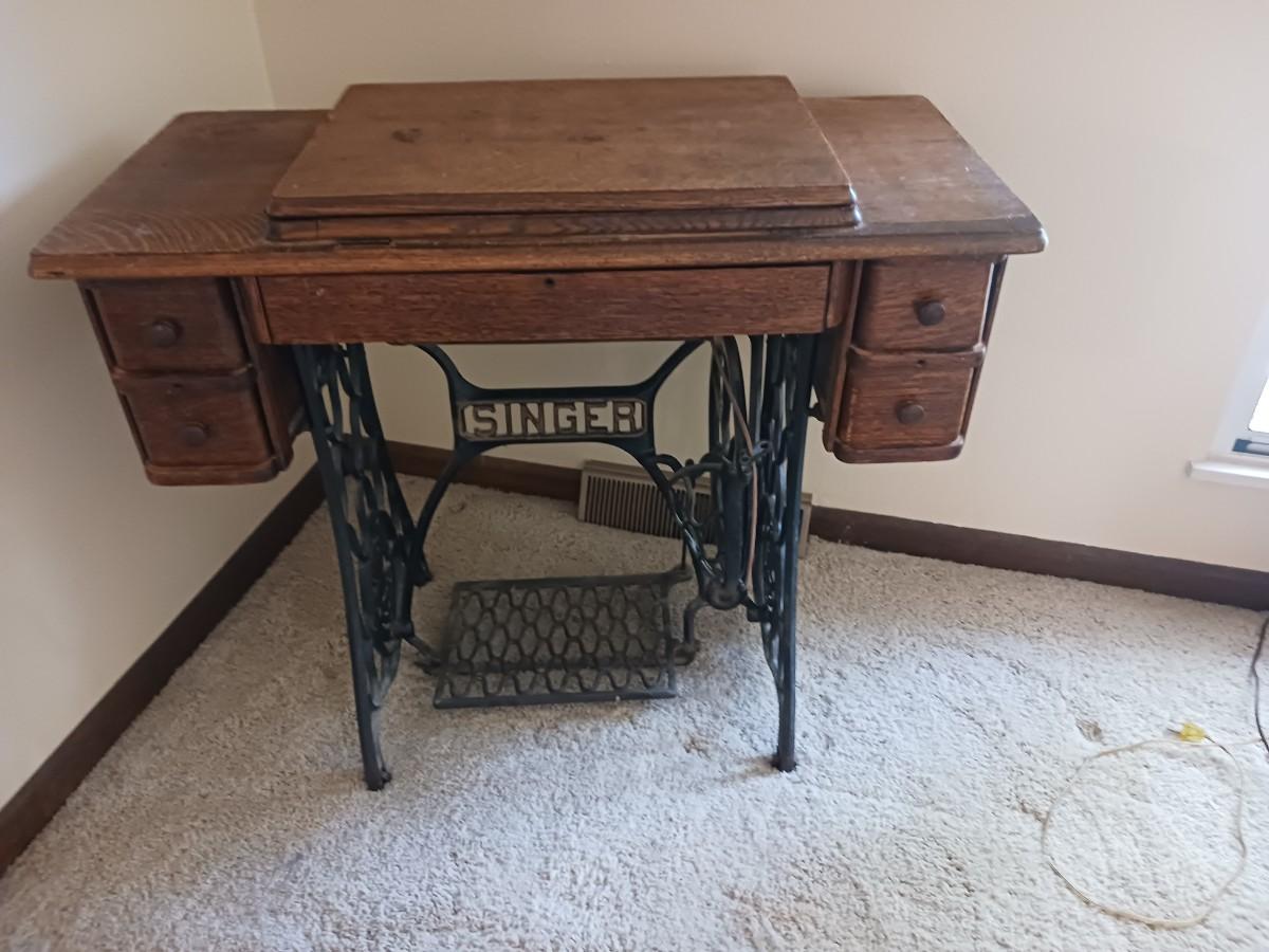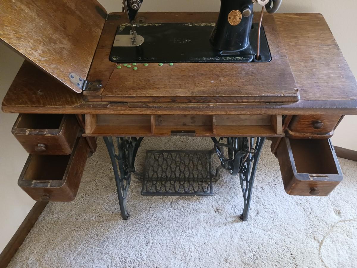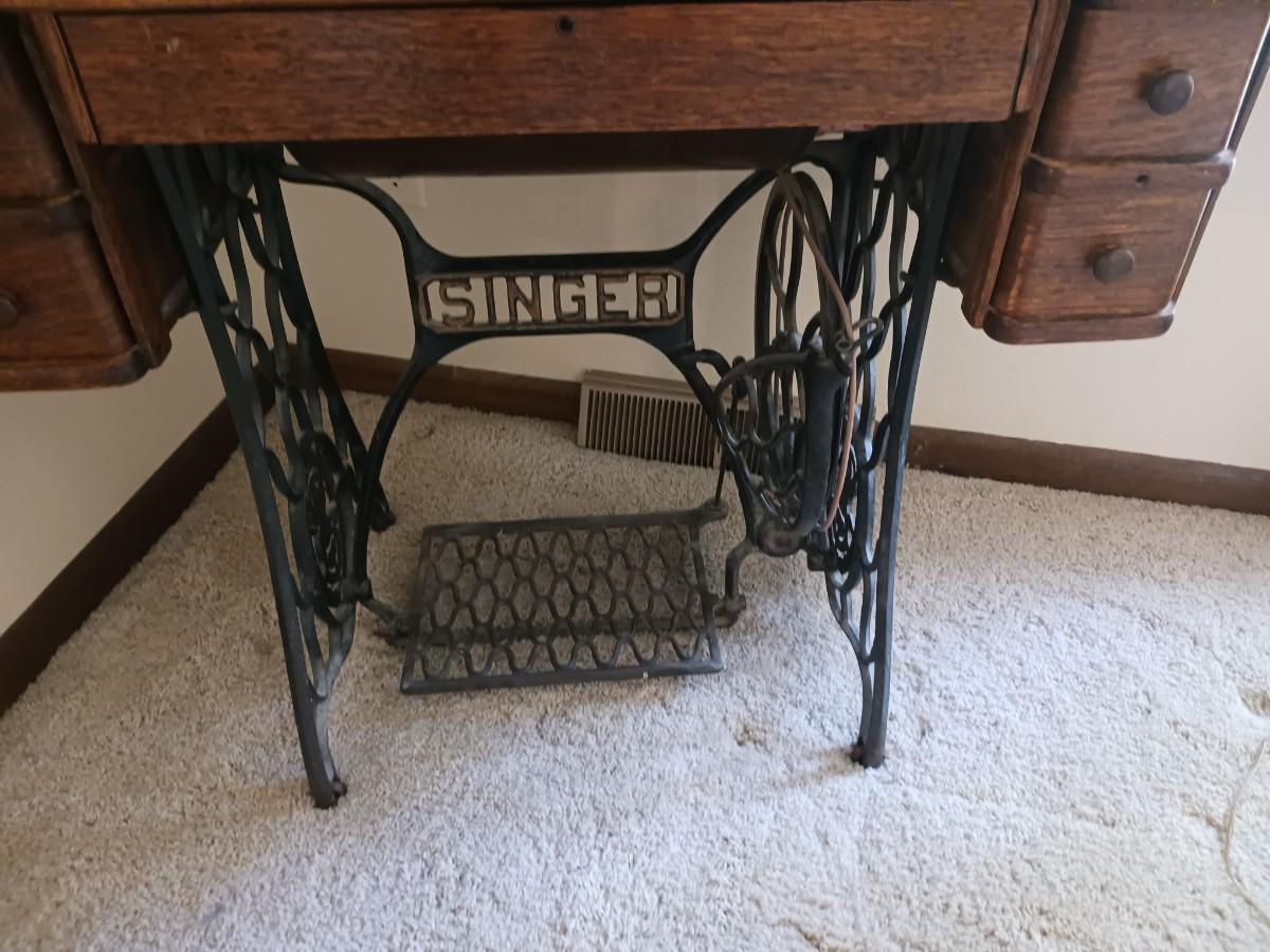 ANTIQUE SINGER TREADLE SEWING MACHINE IN A CABINET