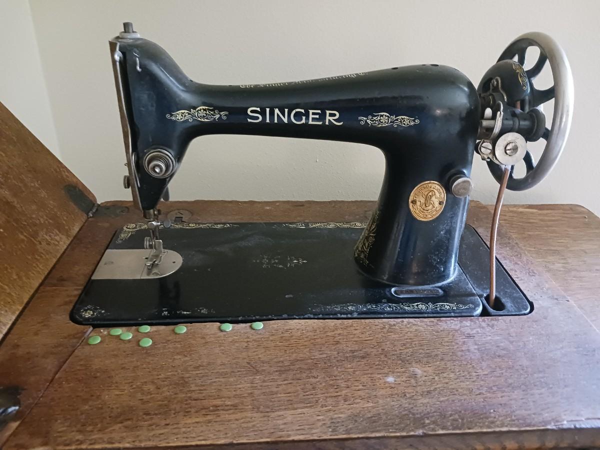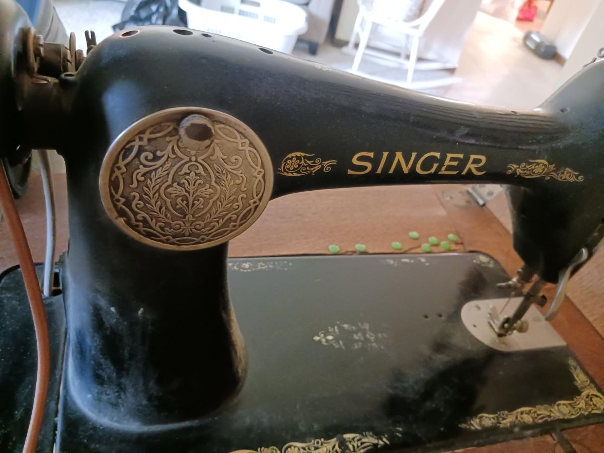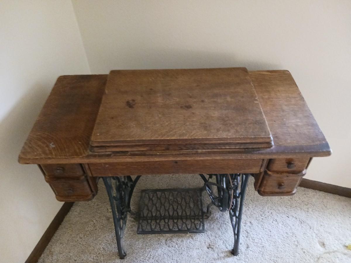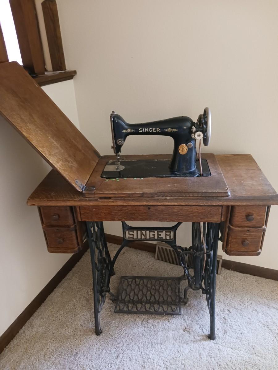 ANTIQUE SINGER TREADLE SEWING MACHINE IN A CABINET