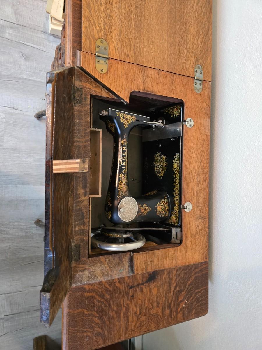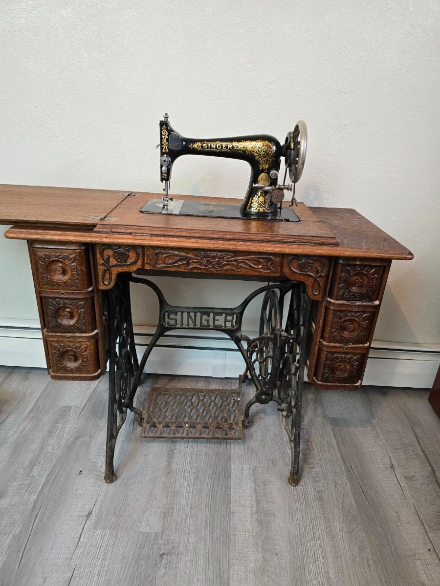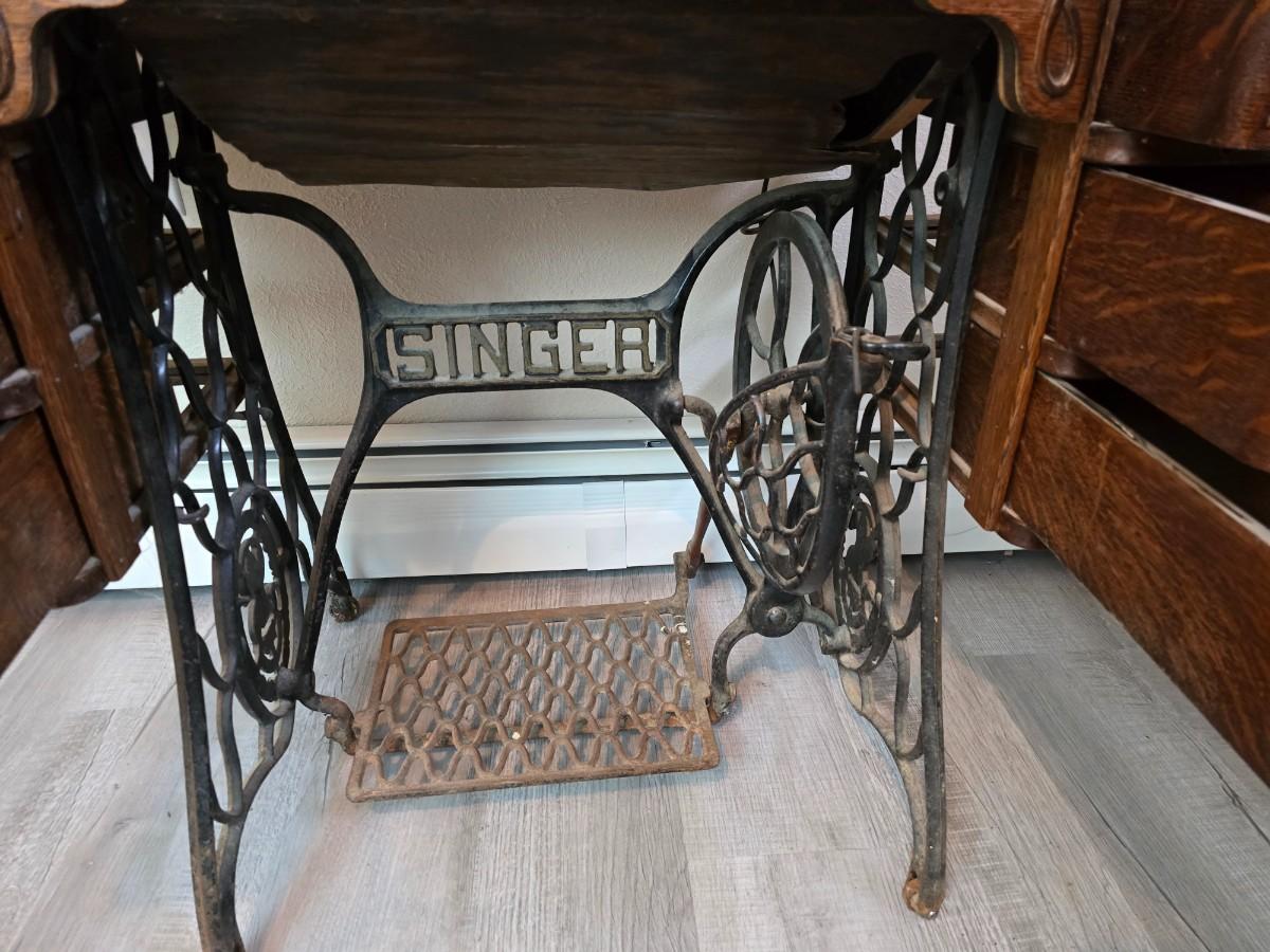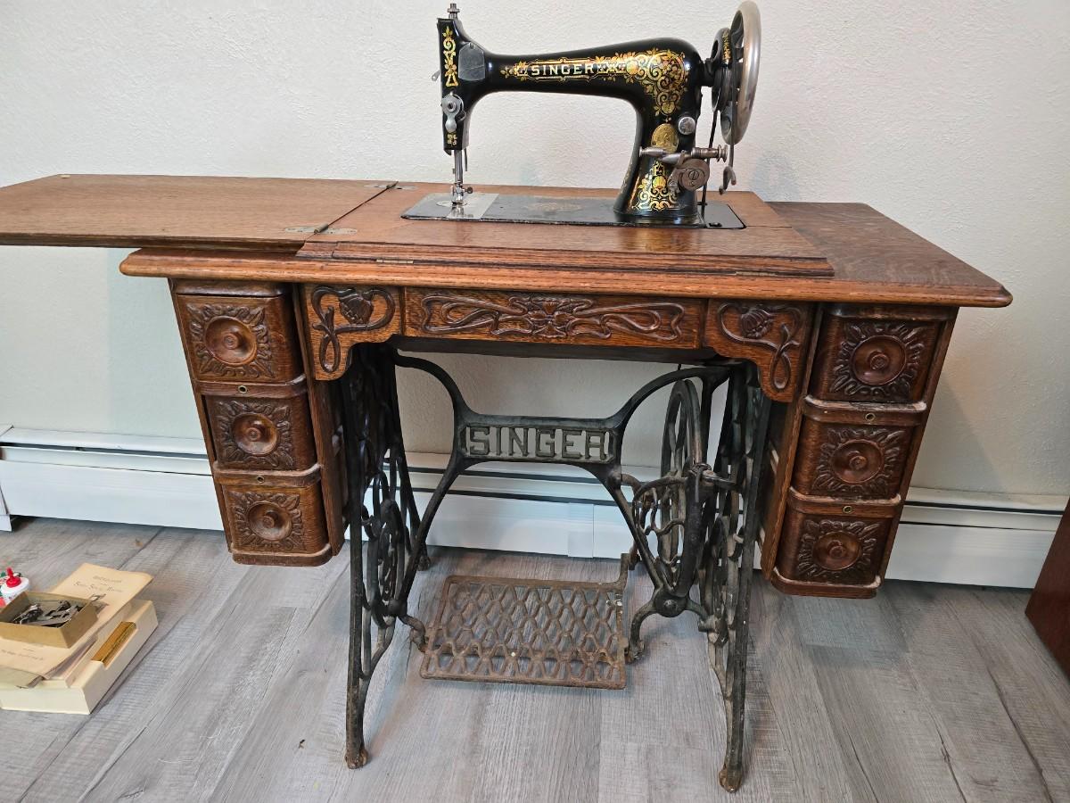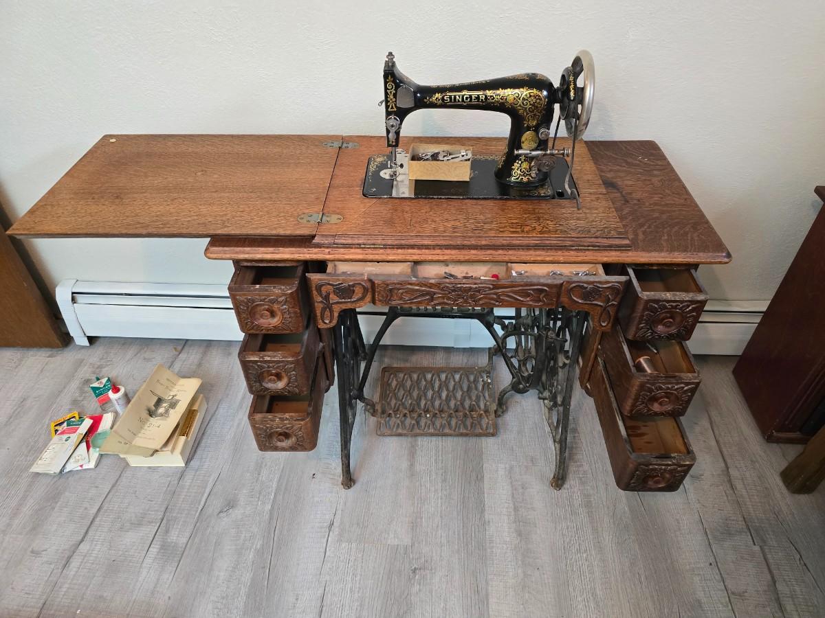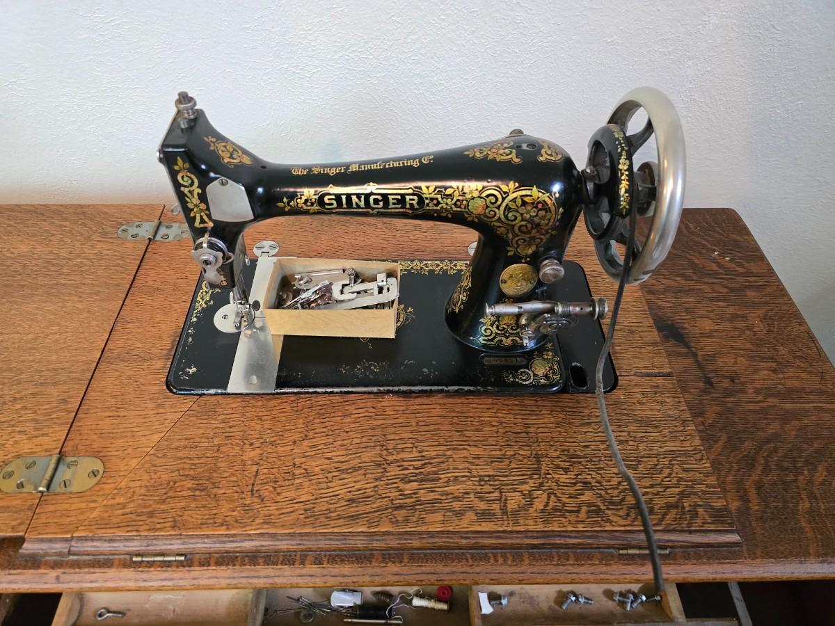 antique Singer treadle sewing machine with a wooden cabinet Complete with accessories and original manual