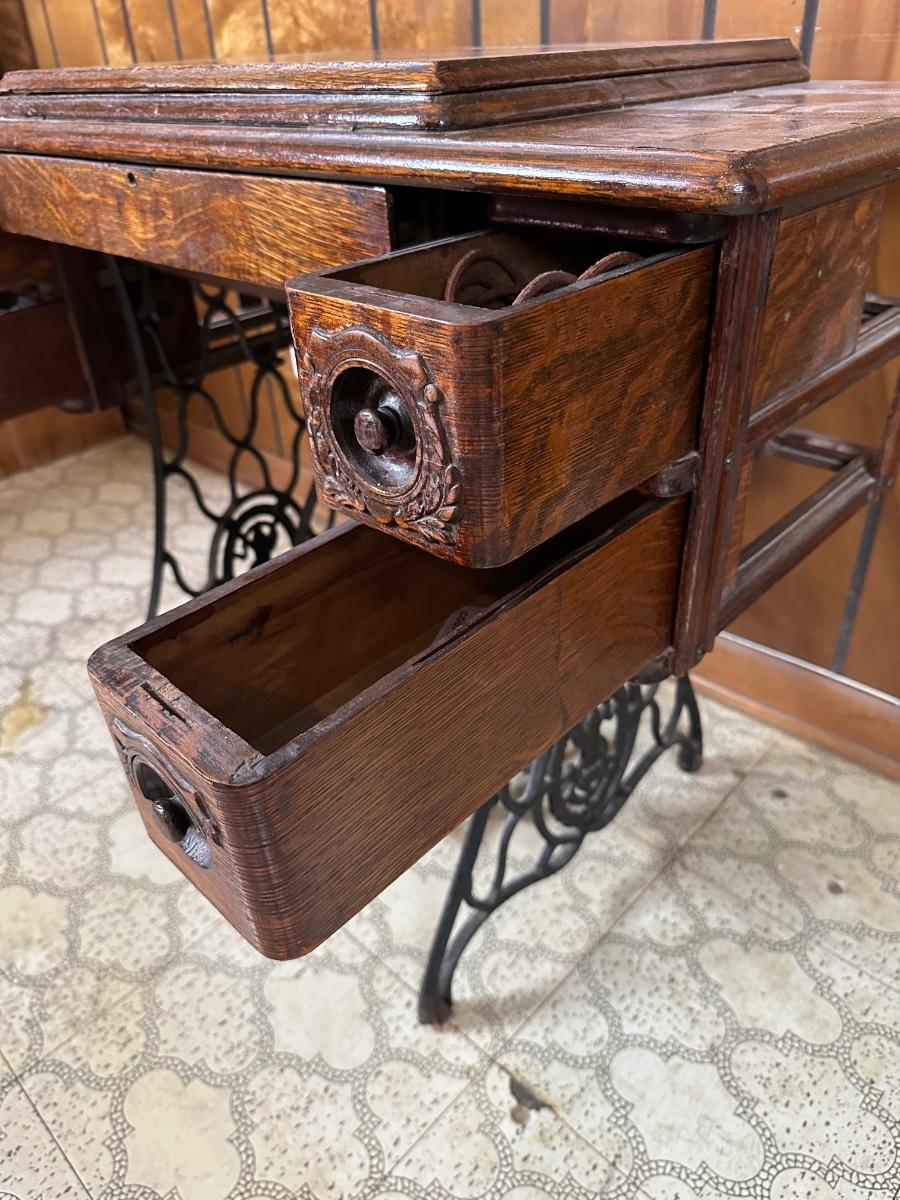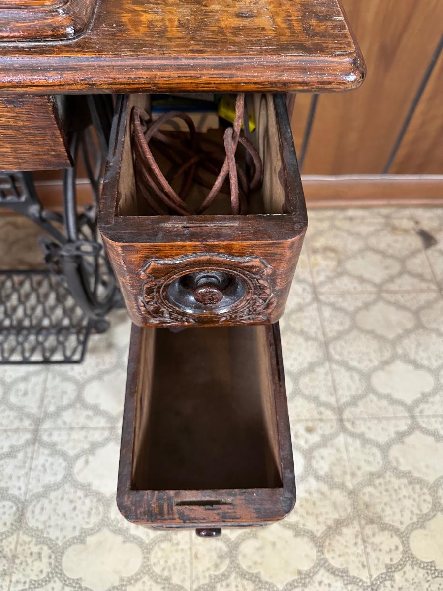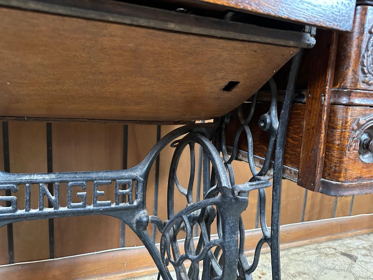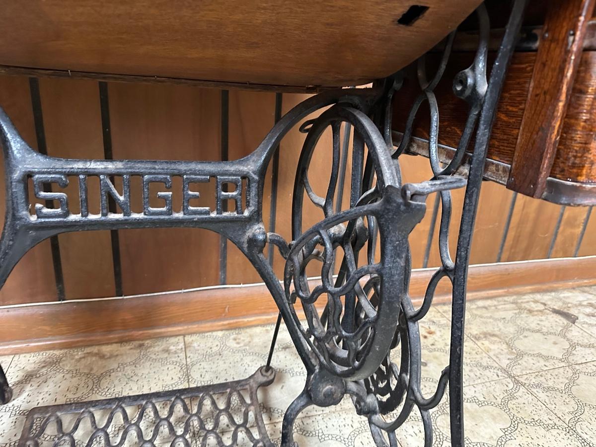 Antique Singer treadle sewing machine set in an original oak cabinet with cast iron base. Classic black Singer head with gold decals, drawers intact, and treadle mechanism present. All mechanical parts move and function, but belt is missing and will need replacement to operate. Excellent display or restoration piece.