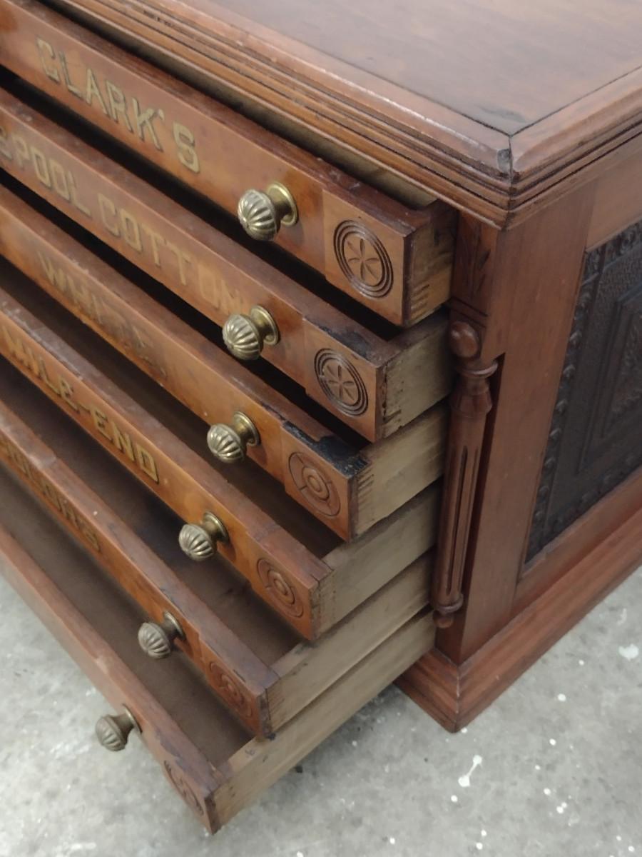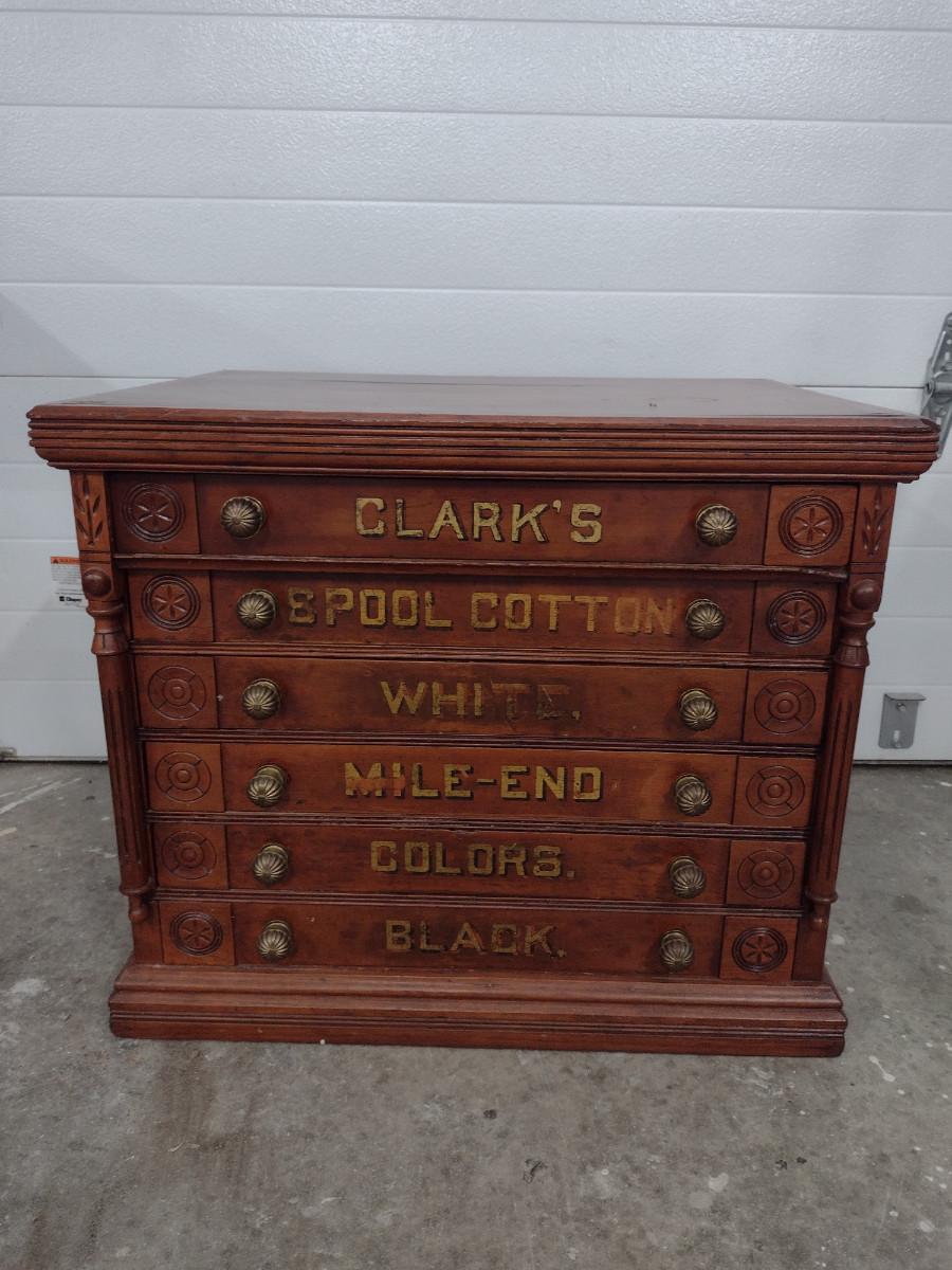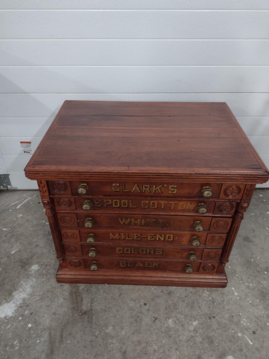 Antique Six Drawer Clark's Spool Cabinet. Item has damage to back panel, crack across top, and one corner. Please review all pictures for condition.
