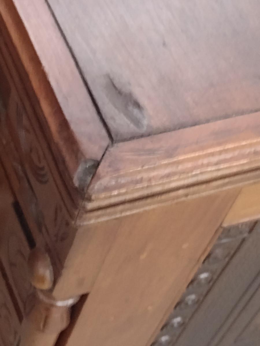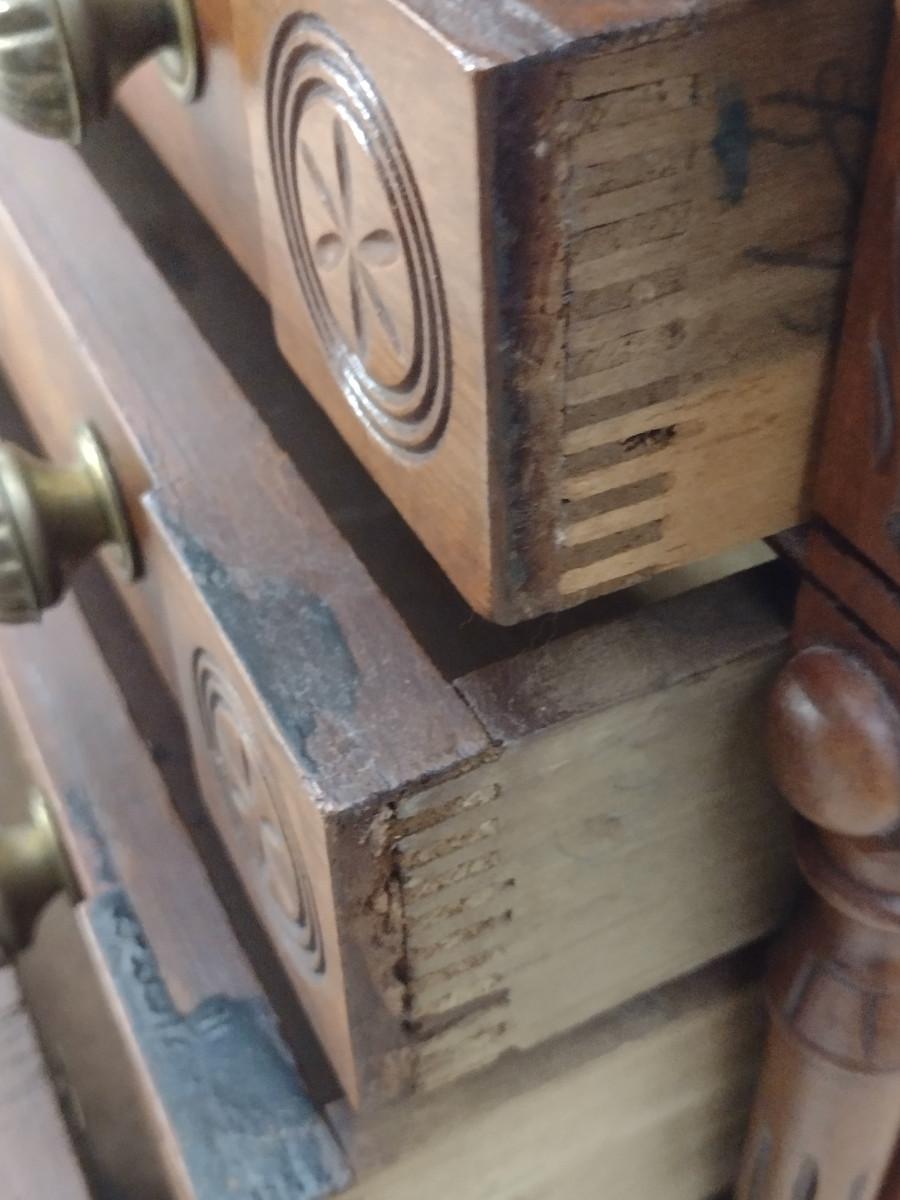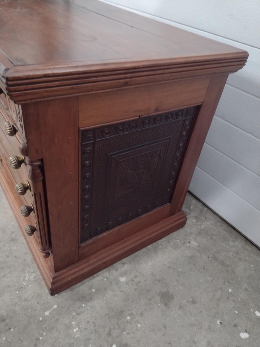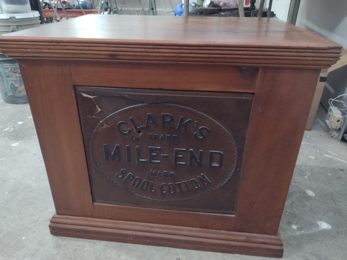 Antique Six Drawer Clark's Spool Cabinet. Item has damage to back panel, crack across top, and one corner. Please review all pictures for condition.