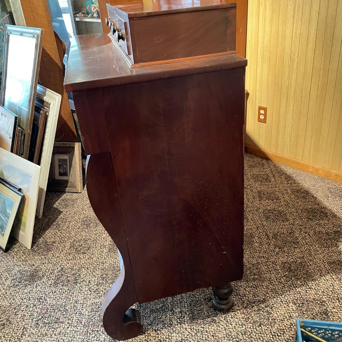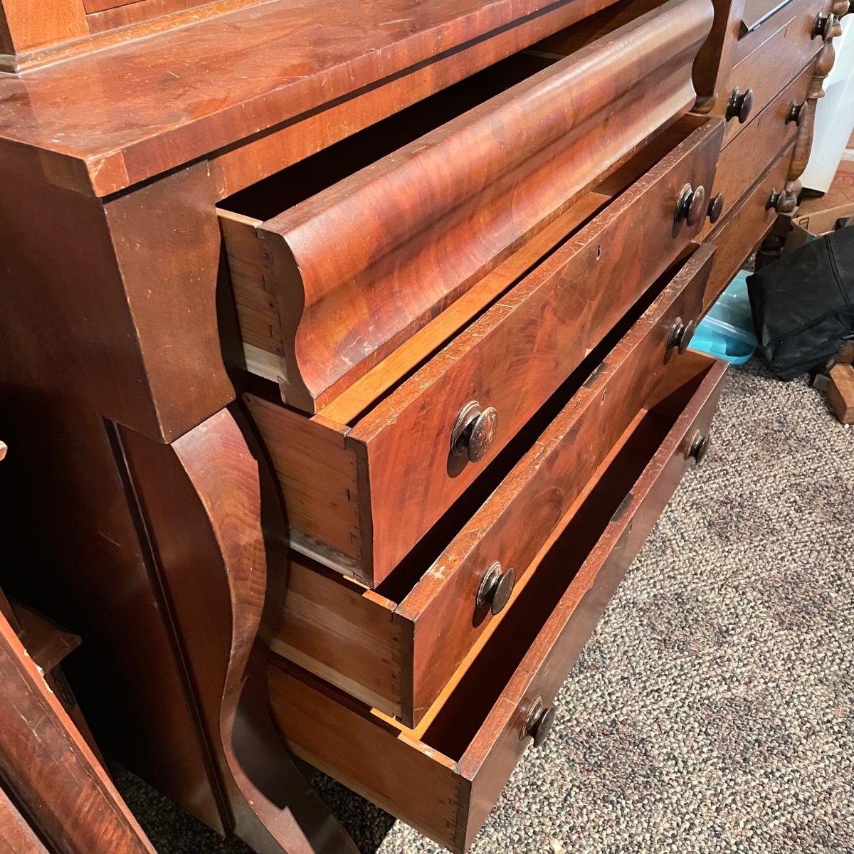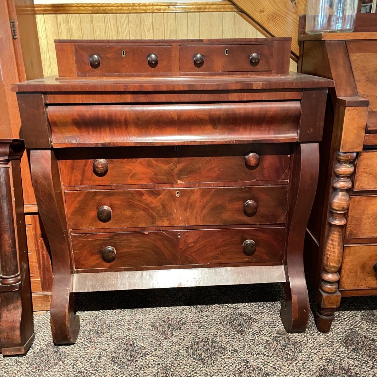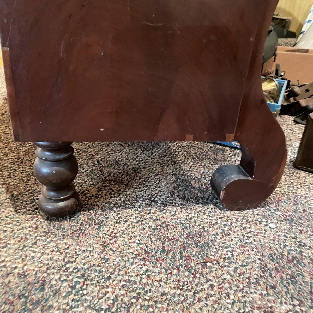 Antique dresser with six dovetail drawers. Five of the six drawers have wooden pulls and key holes, but no keys. Piece is in amazing condition for its age with some minor superficial scratches and some chips in the veneer. It appears to be solid wood with uniquely carved legs. Piece measures approximately 40.5” x 19” x 44.5”. Please bring help to load. Local pick up only.