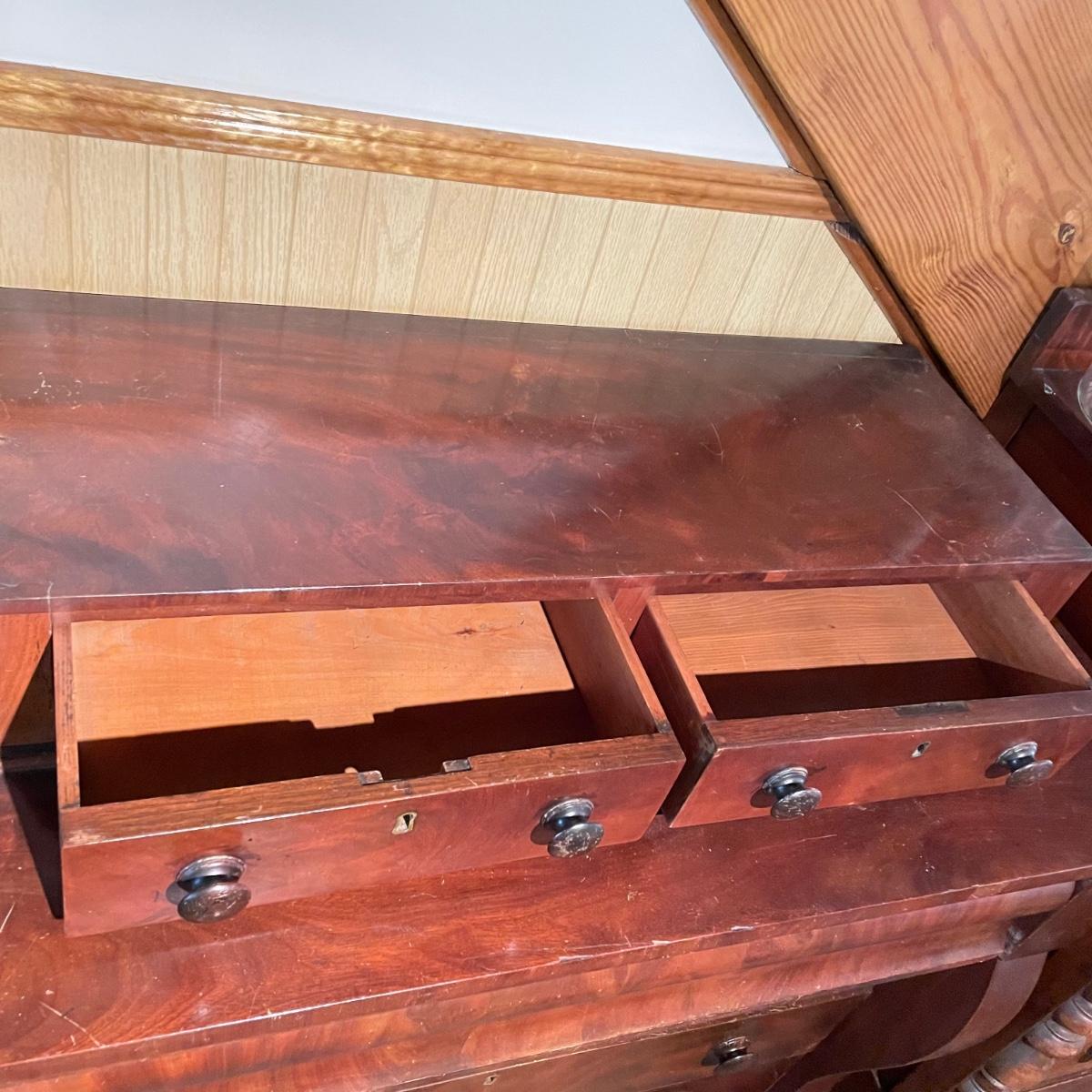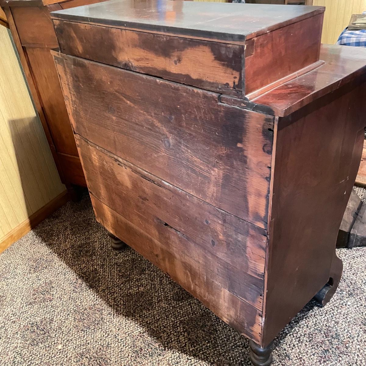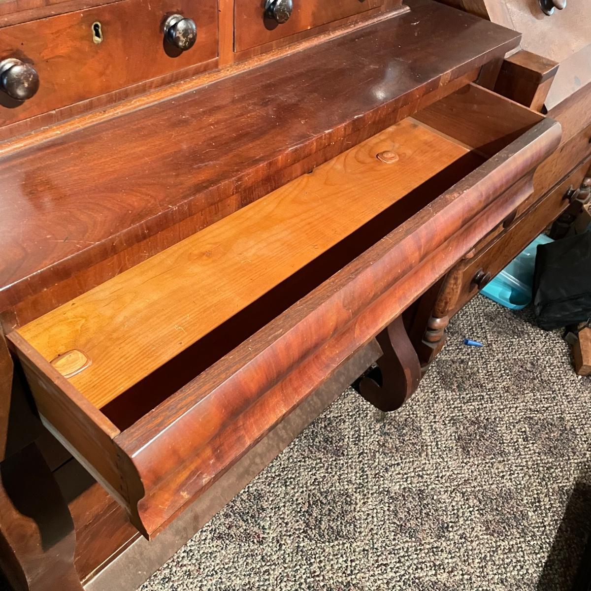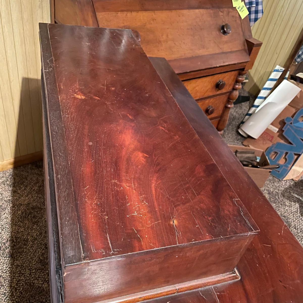Antique dresser with six dovetail drawers. Five of the six drawers have wooden pulls and key holes, but no keys. Piece is in amazing condition for its age with some minor superficial scratches and some chips in the veneer. It appears to be solid wood with uniquely carved legs. Piece measures approximately 40.5” x 19” x 44.5”. Please bring help to load. Local pick up only.