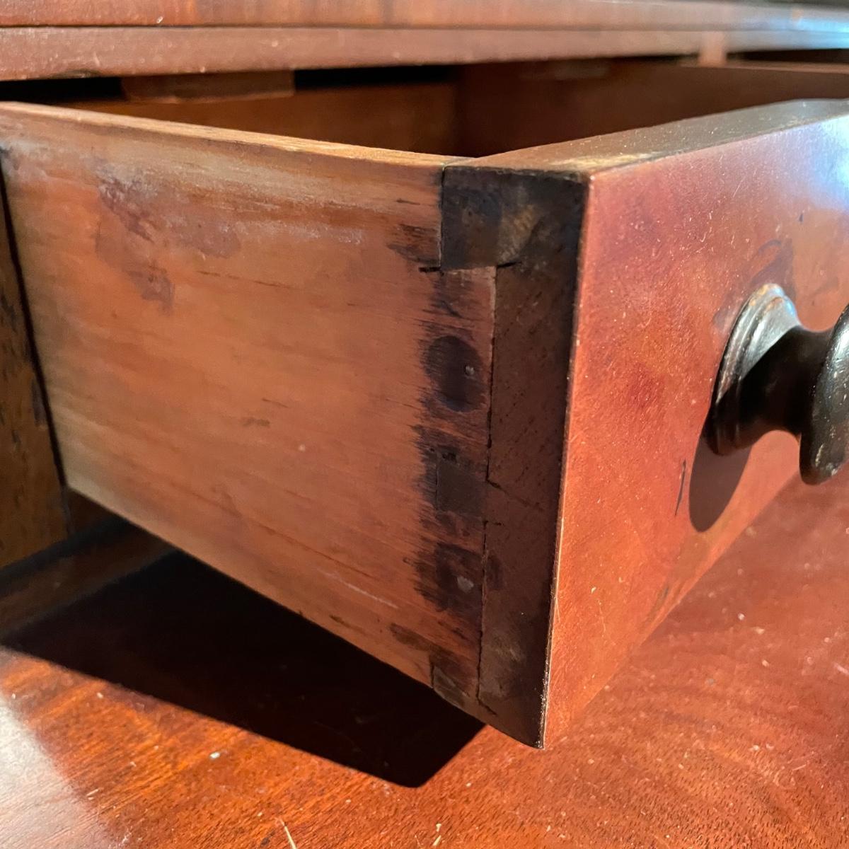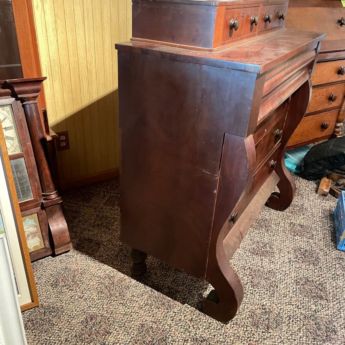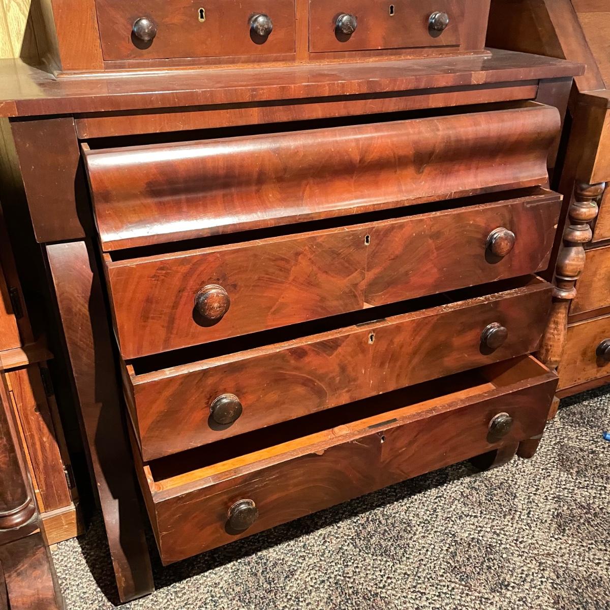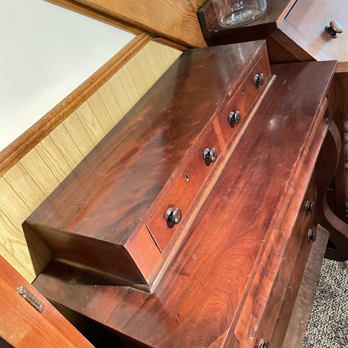 Antique dresser with six dovetail drawers. Five of the six drawers have wooden pulls and key holes, but no keys. Piece is in amazing condition for its age with some minor superficial scratches and some chips in the veneer. It appears to be solid wood with uniquely carved legs. Piece measures approximately 40.5” x 19” x 44.5”. Please bring help to load. Local pick up only.