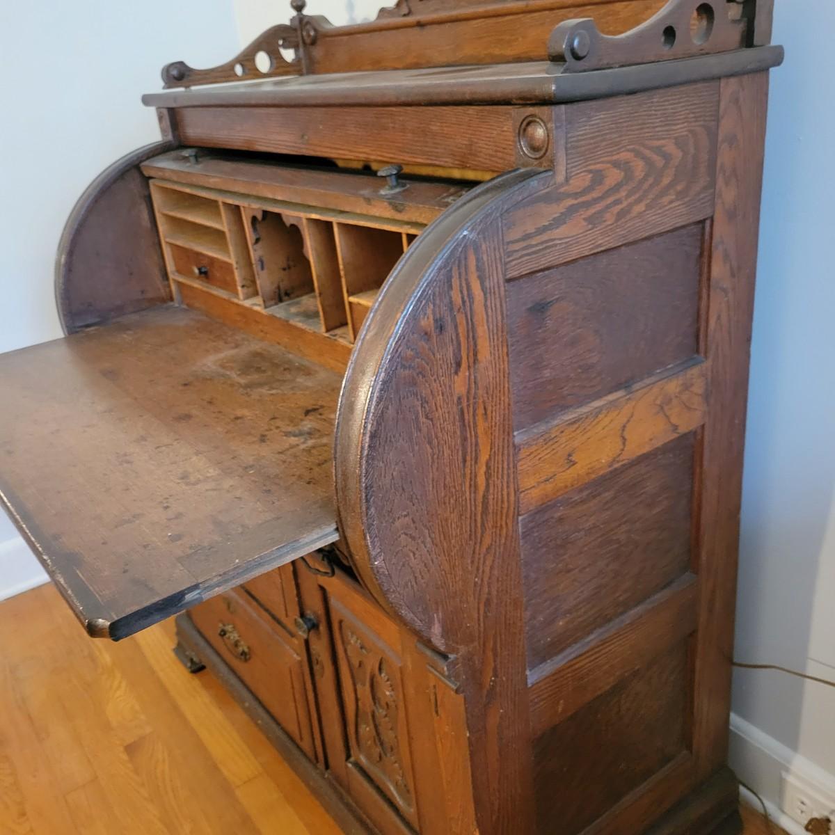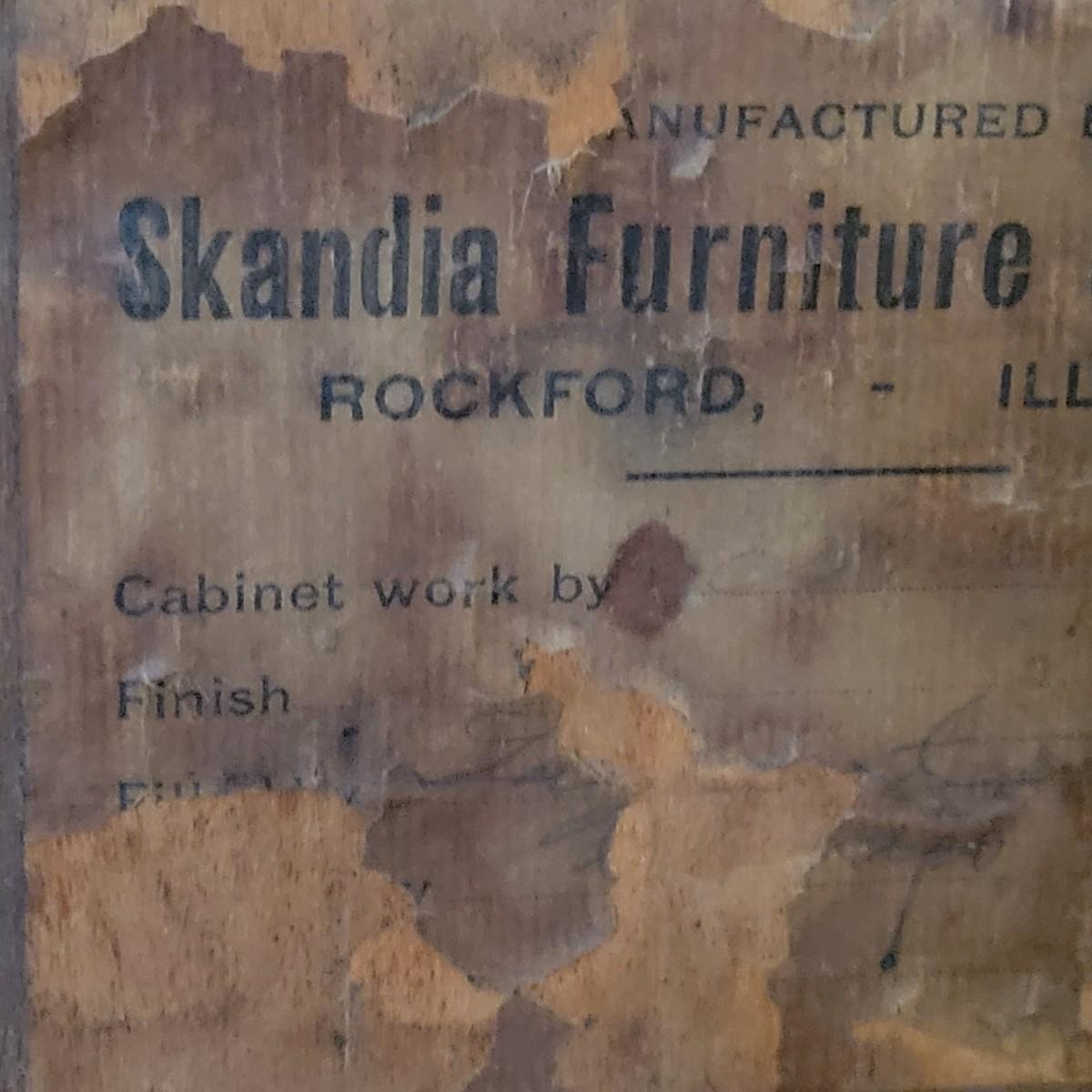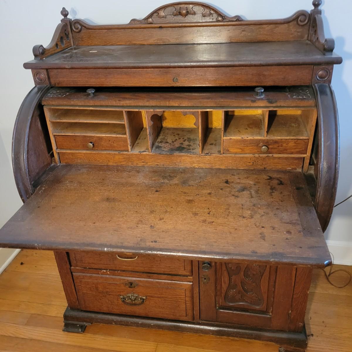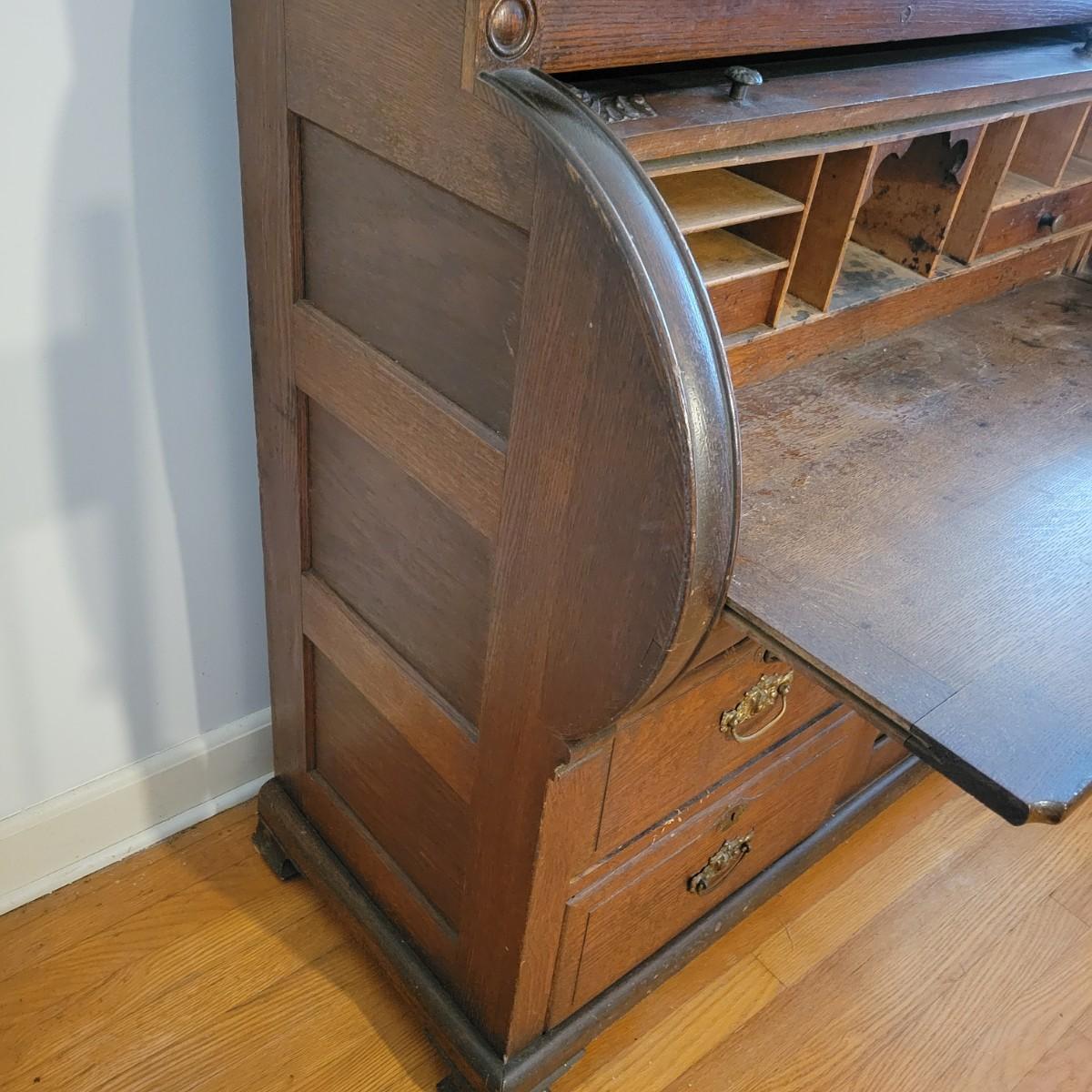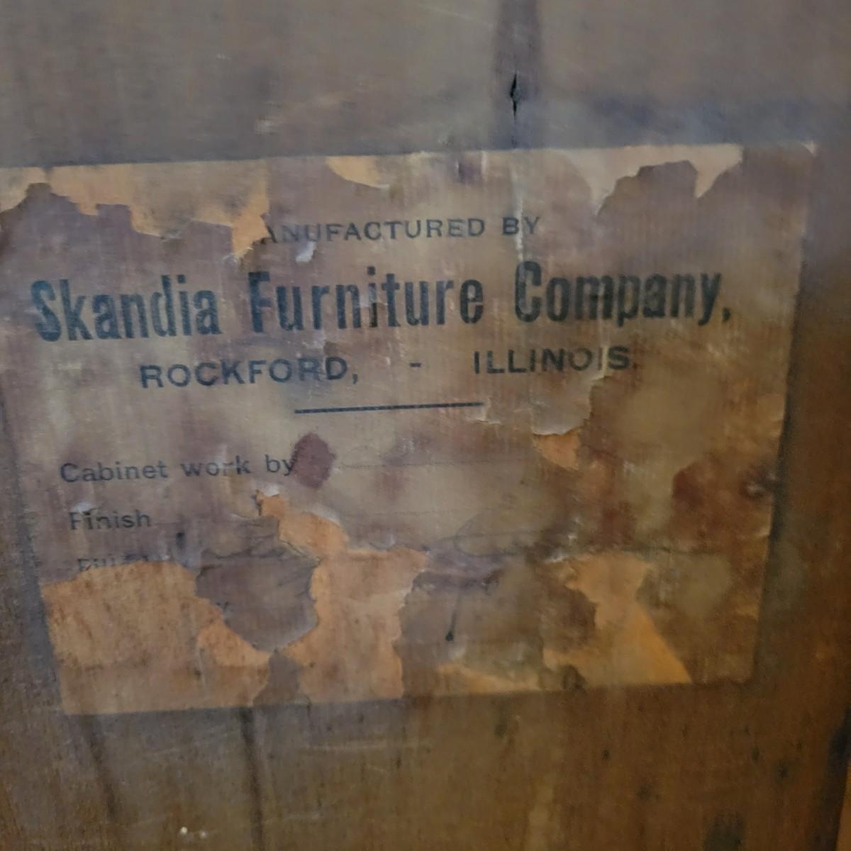 An exquisite antique wooden roll top secretary manufactured by Skandia Furniture Co. Secretary is in good condition but does show some wear from use. All drawers have mortised corners and all open. There is a some difference in the metal hardware for the large top drawer and smaller drawers and there is a small white spot in the stain on top of the secretary. Roll top operates smoothly and writing surface pulls out. Included is an antique chair with a woven cane seat and cushion. Chair is in excellent condition. Secretary measures approximately 38" x 22" x 47". Chair measures approximately 18" x 16" x 40" and the seat height is approximately 17". Local pickup only.