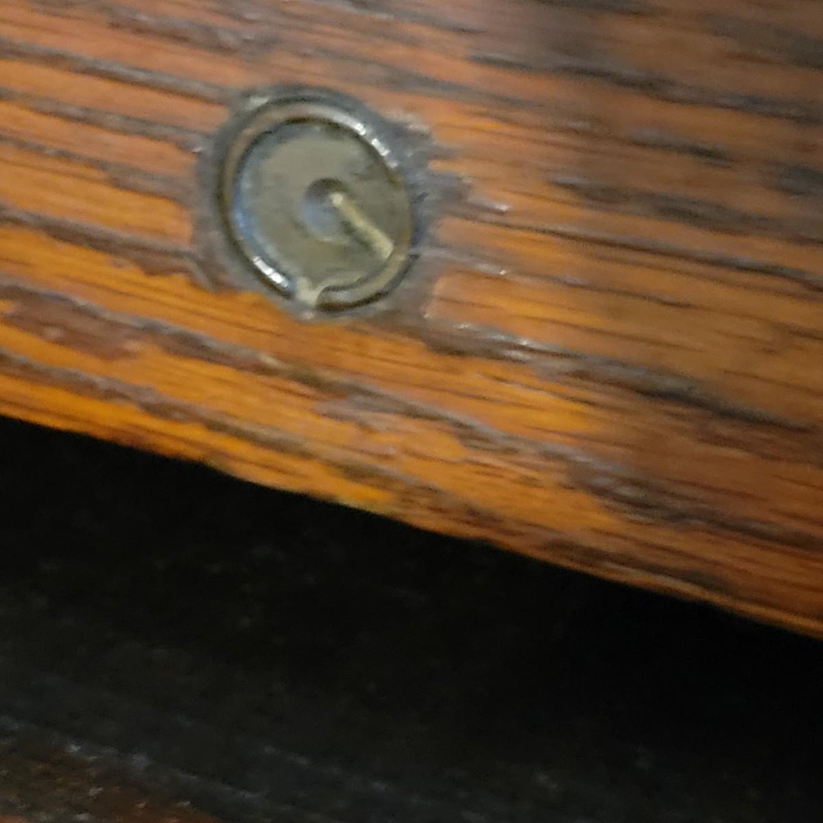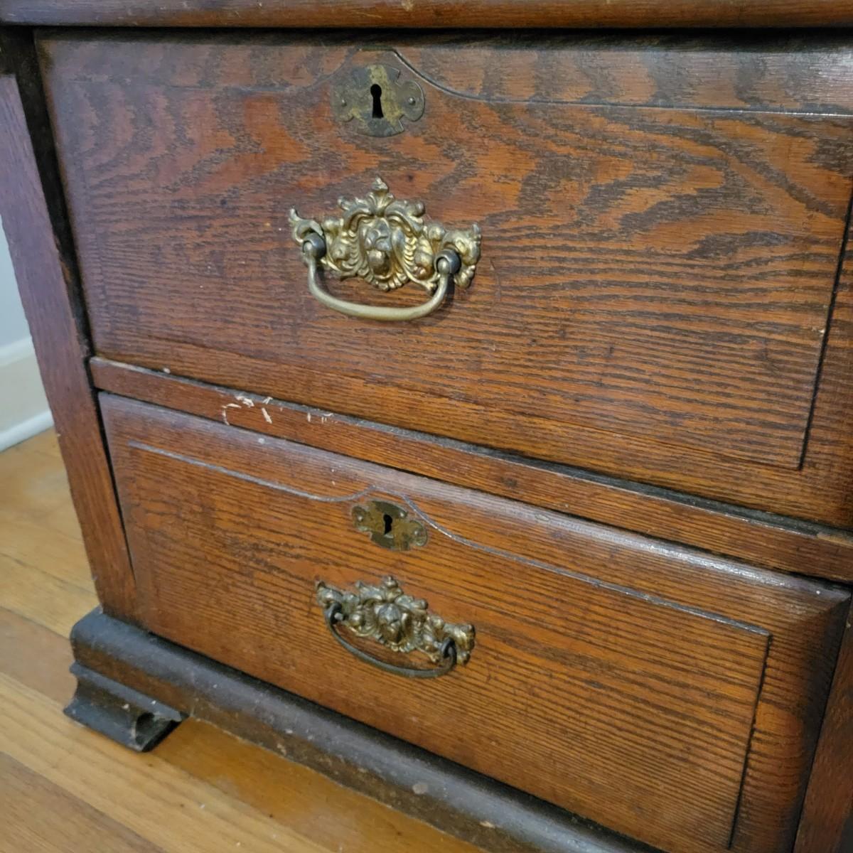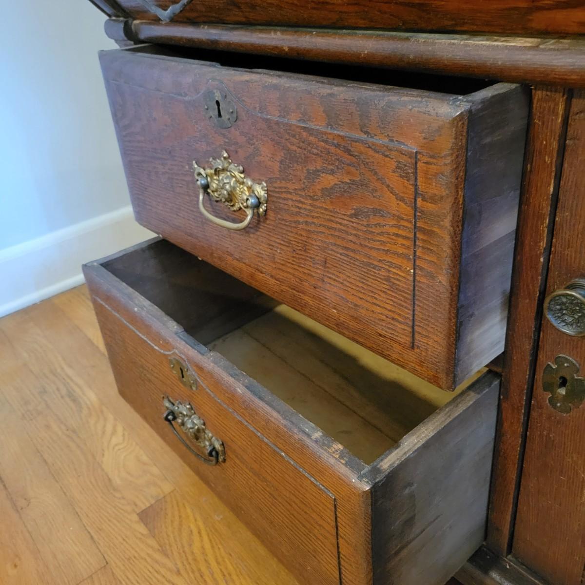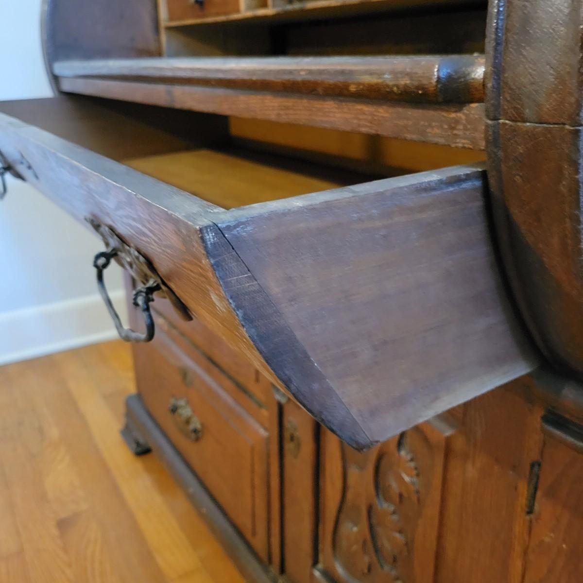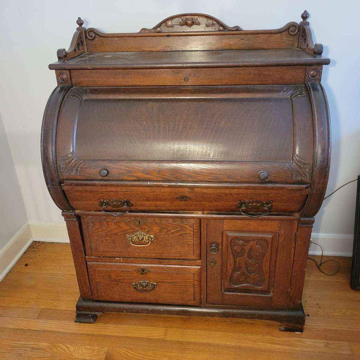 An exquisite antique wooden roll top secretary manufactured by Skandia Furniture Co. Secretary is in good condition but does show some wear from use. All drawers have mortised corners and all open. There is a some difference in the metal hardware for the large top drawer and smaller drawers and there is a small white spot in the stain on top of the secretary. Roll top operates smoothly and writing surface pulls out. Included is an antique chair with a woven cane seat and cushion. Chair is in excellent condition. Secretary measures approximately 38" x 22" x 47". Chair measures approximately 18" x 16" x 40" and the seat height is approximately 17". Local pickup only.
