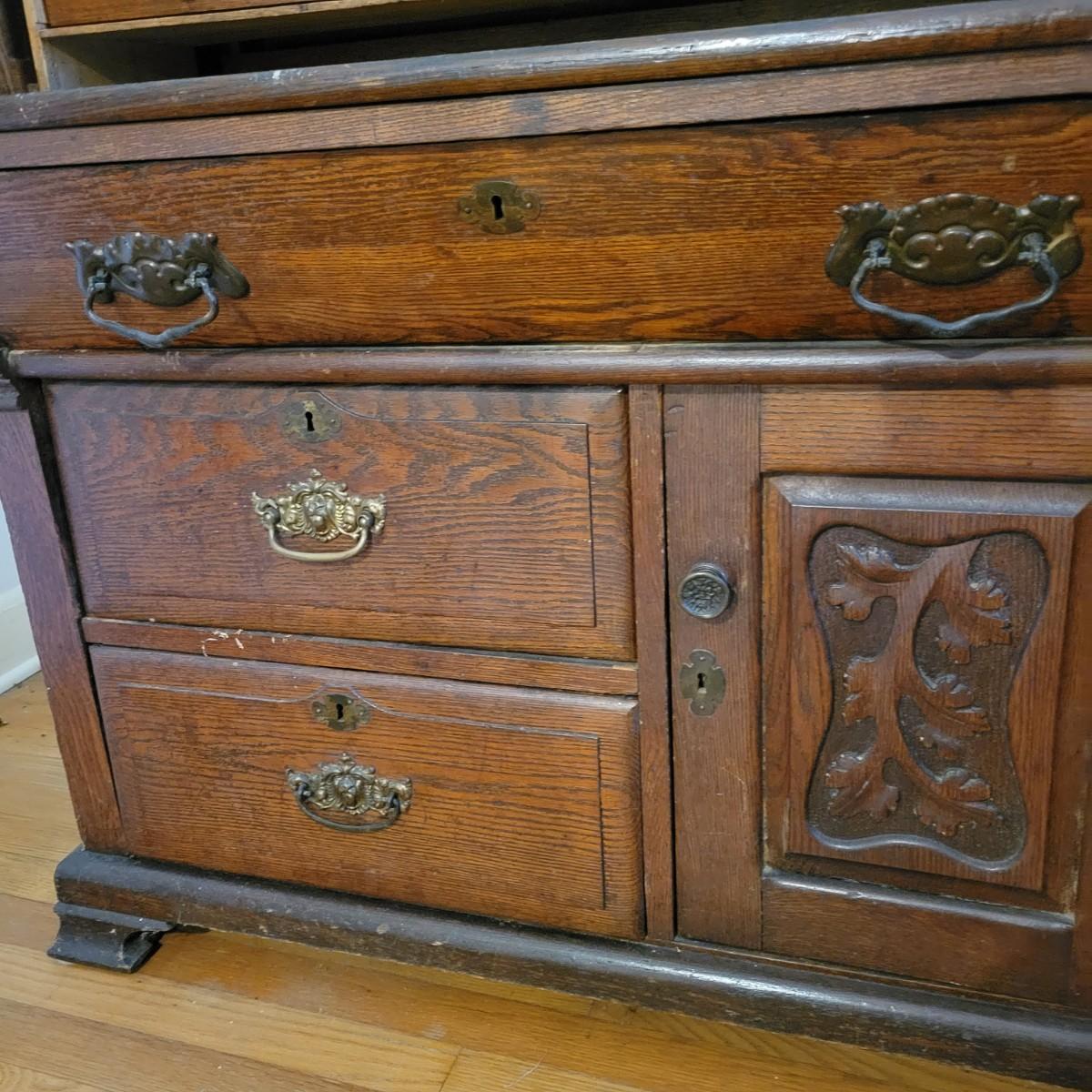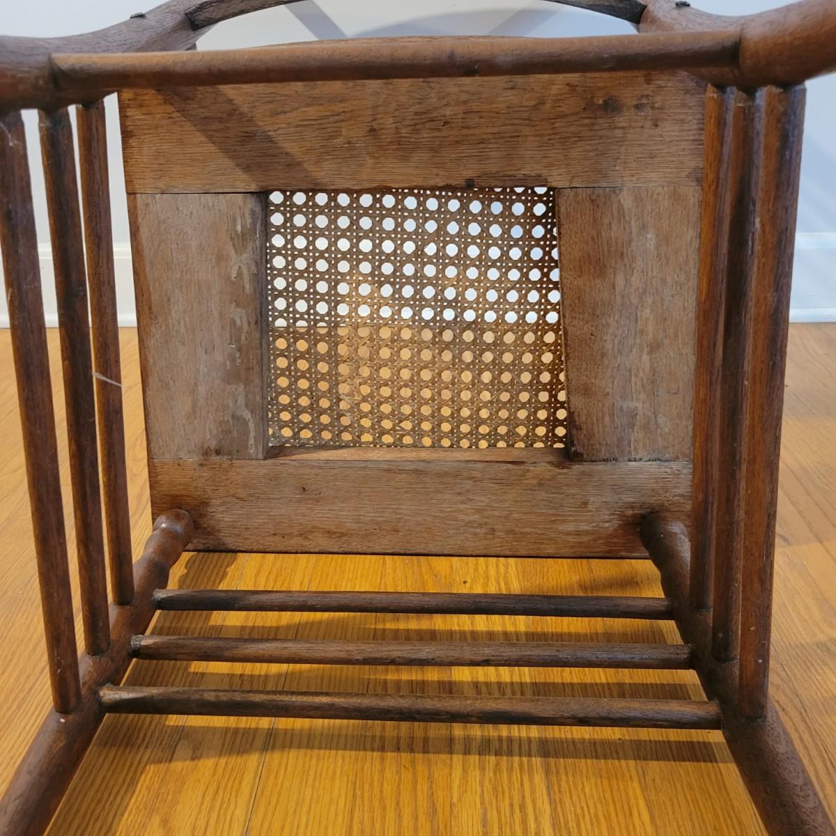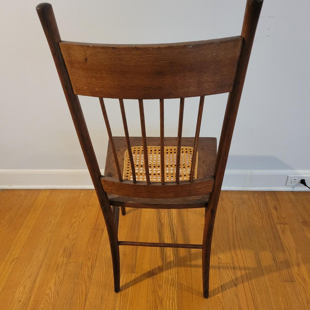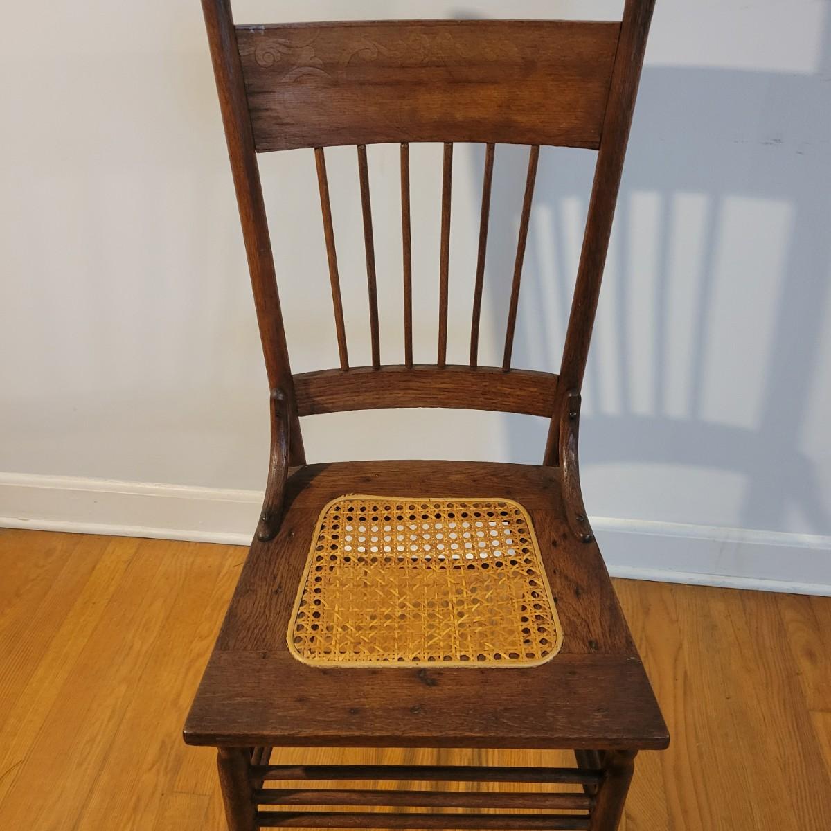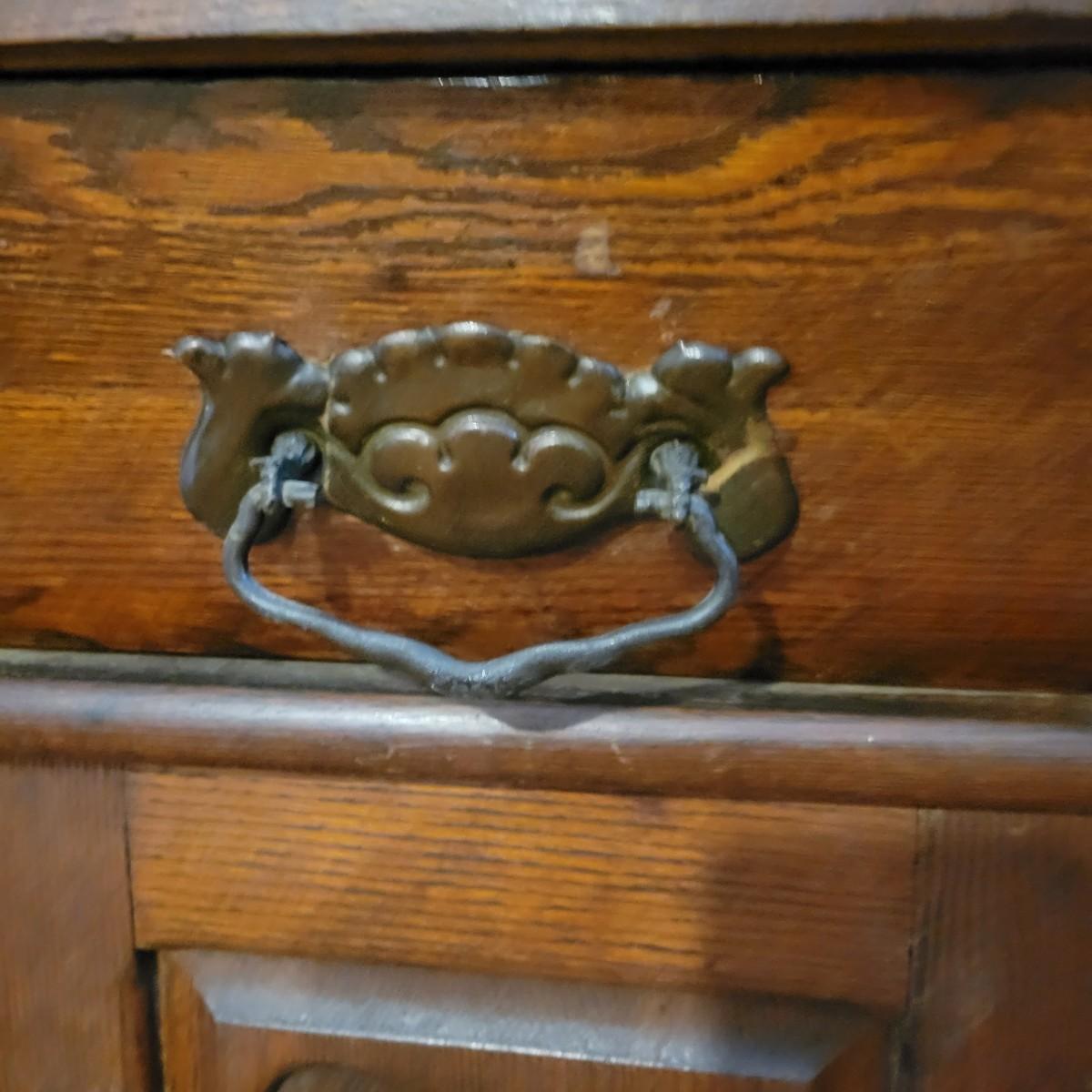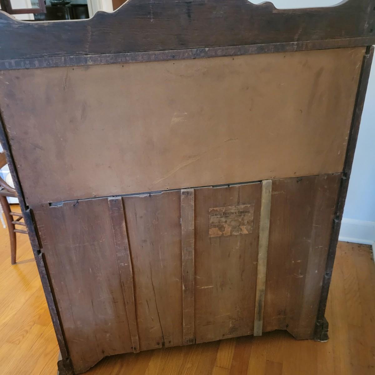 An exquisite antique wooden roll top secretary manufactured by Skandia Furniture Co. Secretary is in good condition but does show some wear from use. All drawers have mortised corners and all open. There is a some difference in the metal hardware for the large top drawer and smaller drawers and there is a small white spot in the stain on top of the secretary. Roll top operates smoothly and writing surface pulls out. Included is an antique chair with a woven cane seat and cushion. Chair is in excellent condition. Secretary measures approximately 38" x 22" x 47". Chair measures approximately 18" x 16" x 40" and the seat height is approximately 17". Local pickup only.