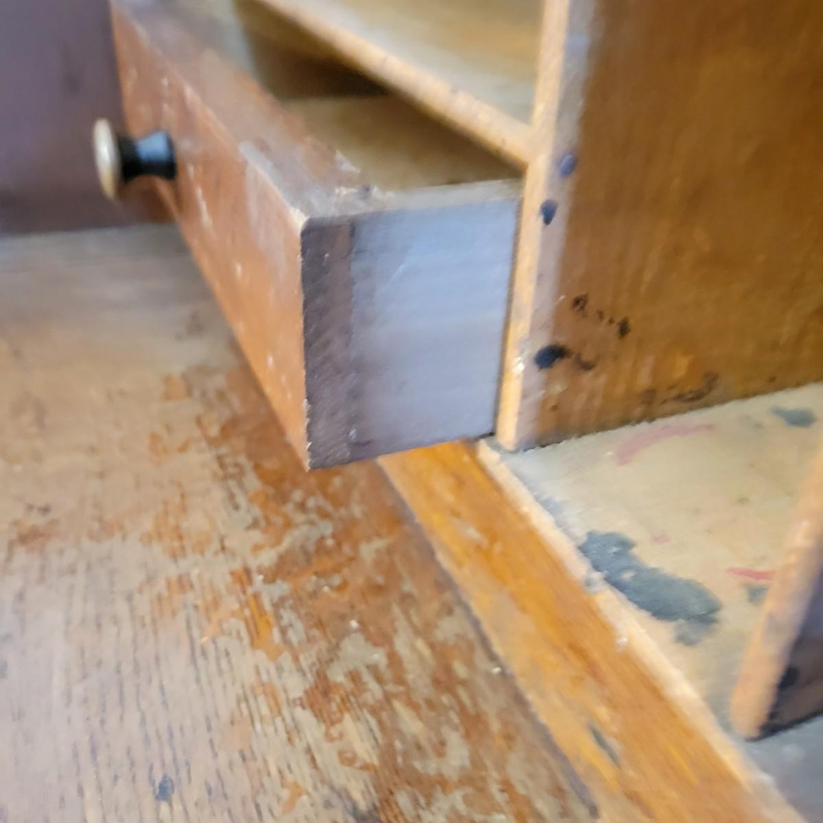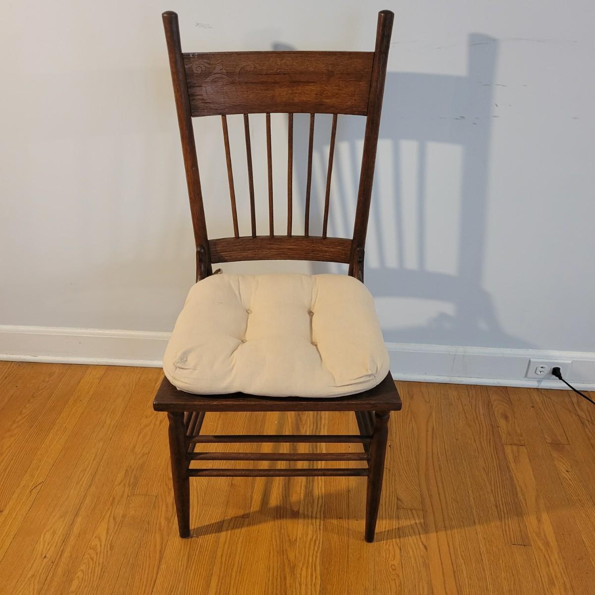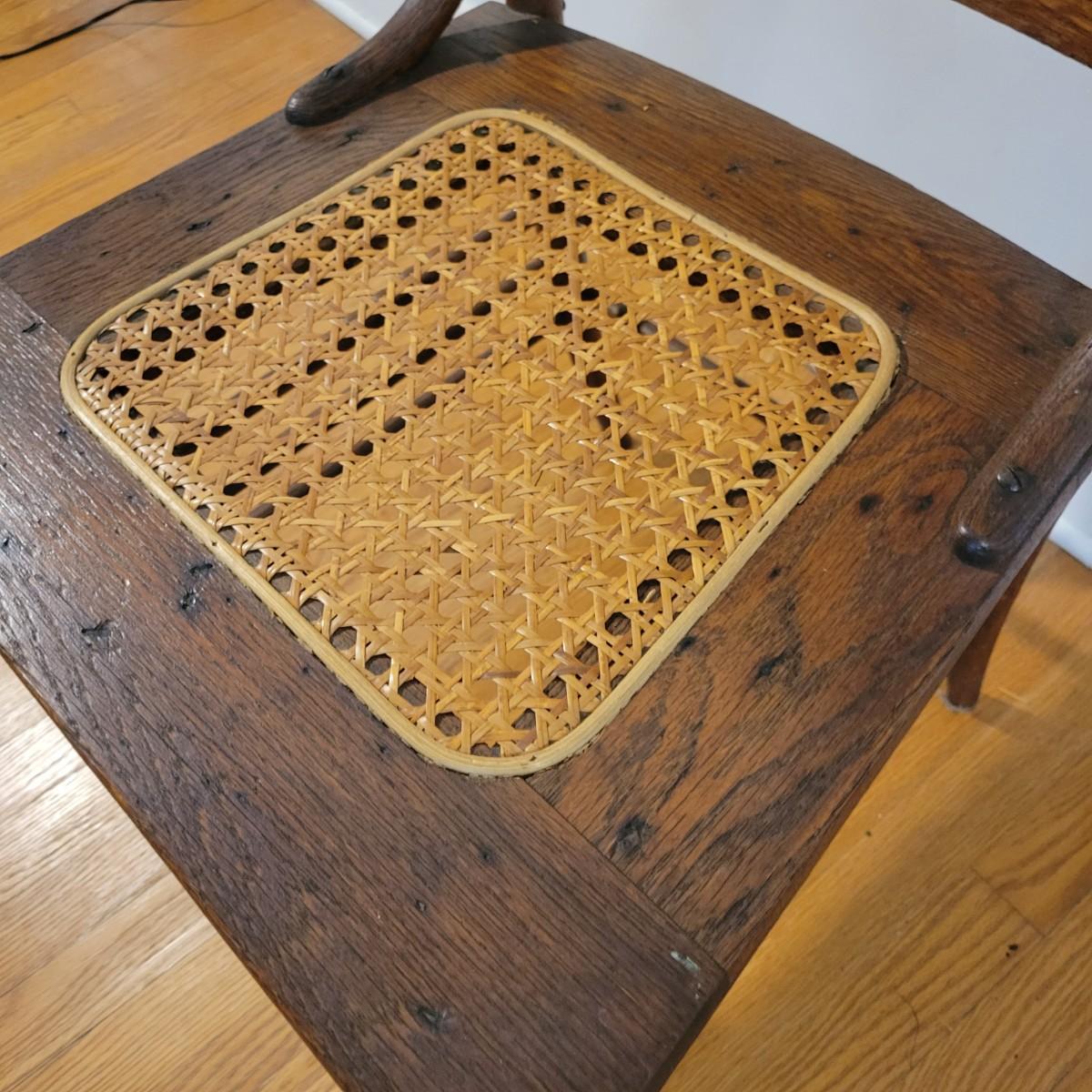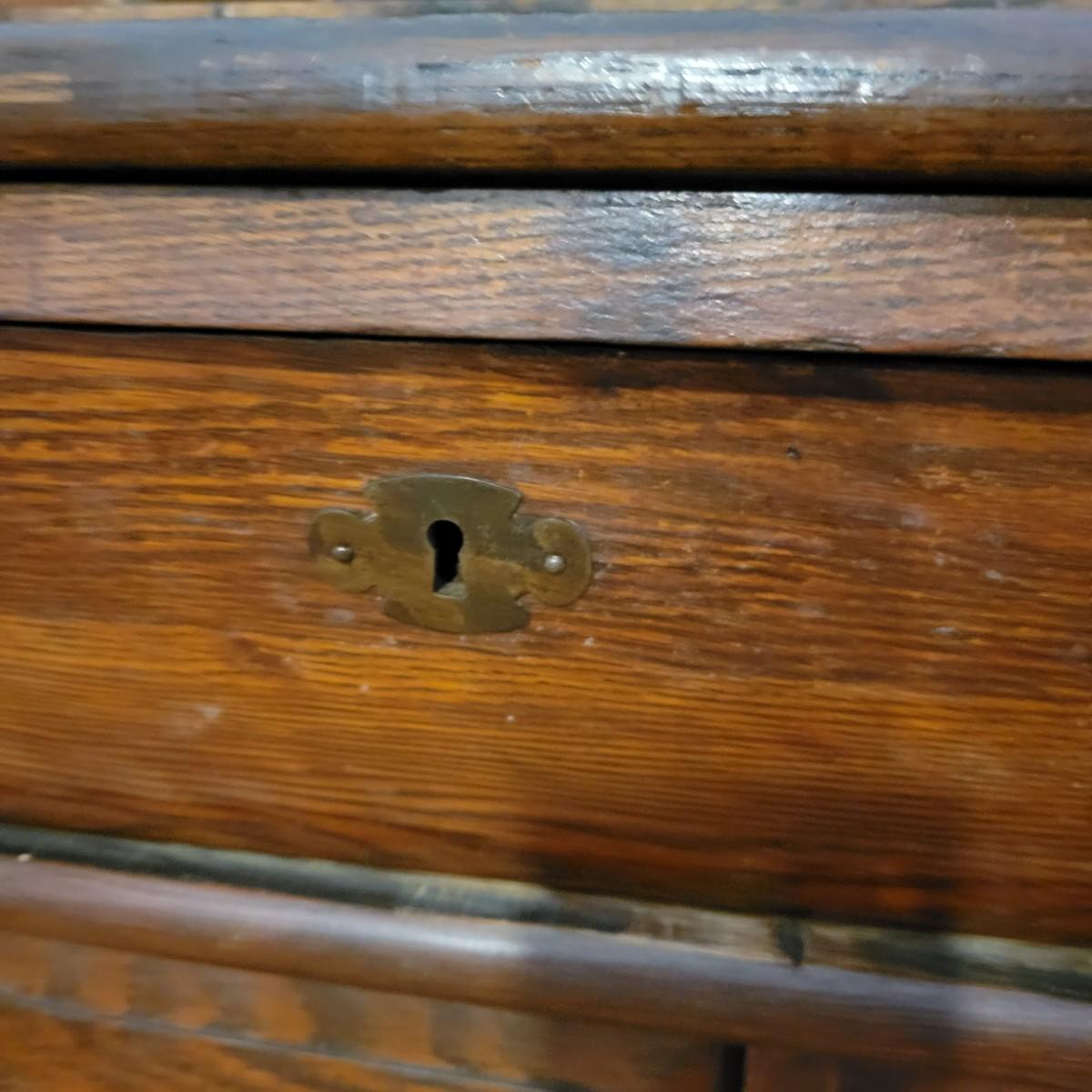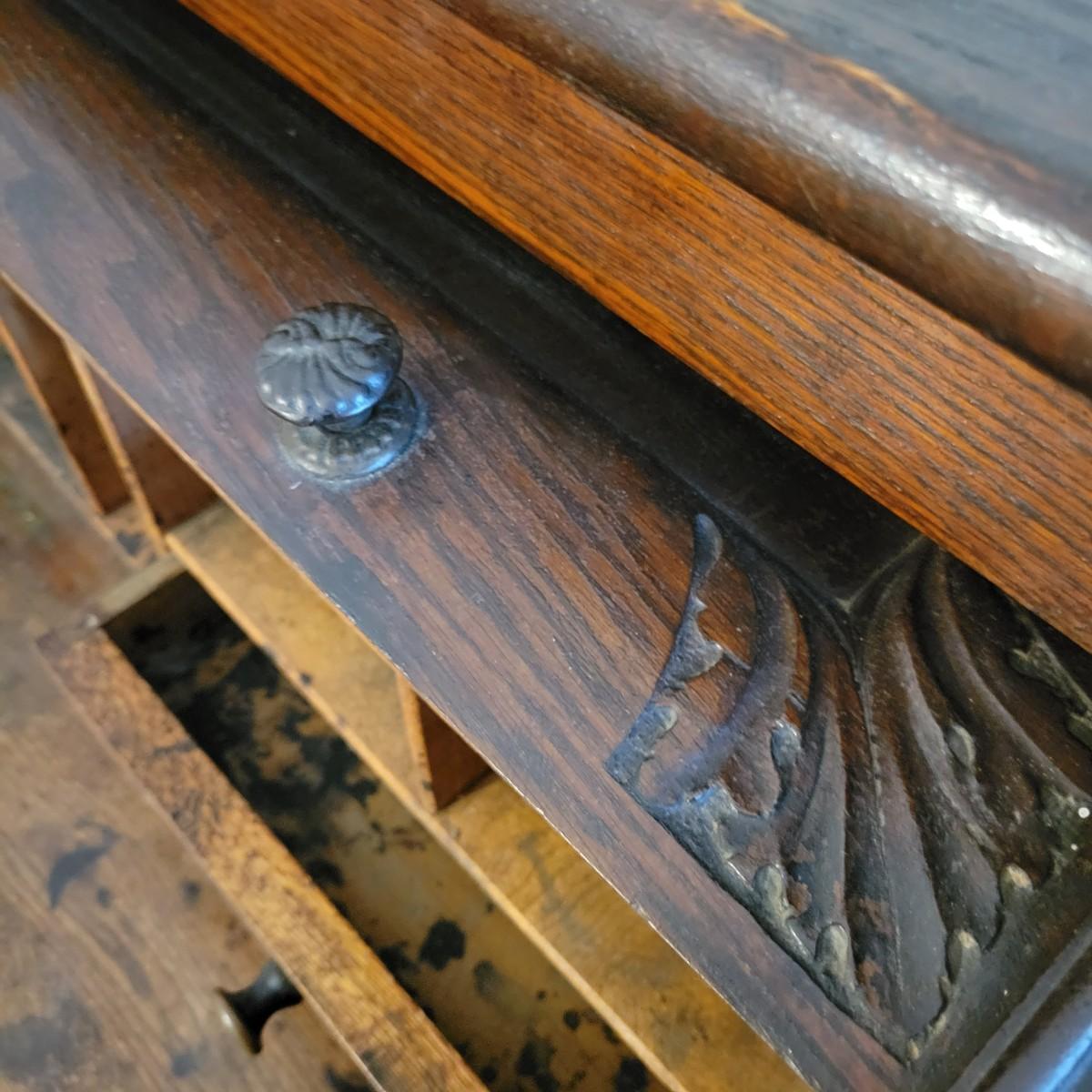 An exquisite antique wooden roll top secretary manufactured by Skandia Furniture Co. Secretary is in good condition but does show some wear from use. All drawers have mortised corners and all open. There is a some difference in the metal hardware for the large top drawer and smaller drawers and there is a small white spot in the stain on top of the secretary. Roll top operates smoothly and writing surface pulls out. Included is an antique chair with a woven cane seat and cushion. Chair is in excellent condition. Secretary measures approximately 38" x 22" x 47". Chair measures approximately 18" x 16" x 40" and the seat height is approximately 17". Local pickup only.