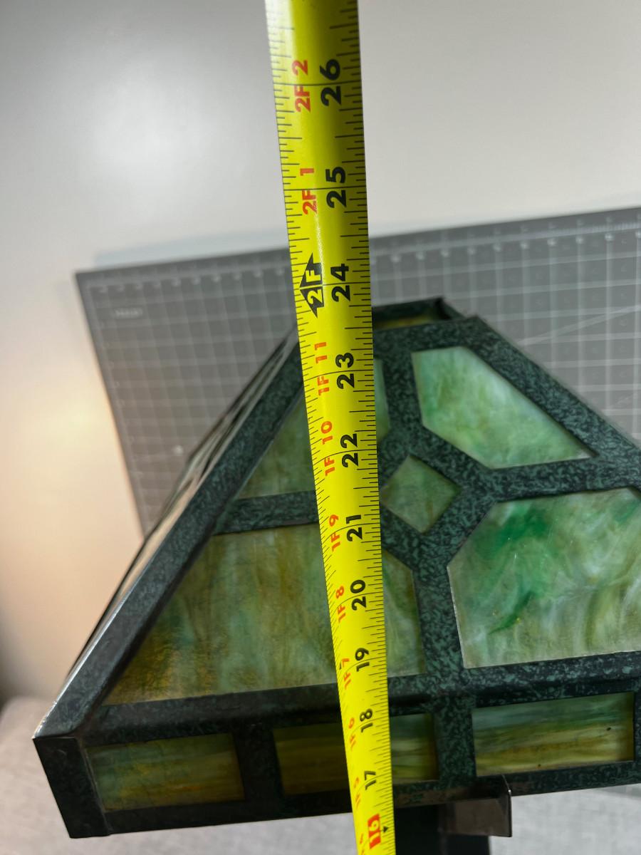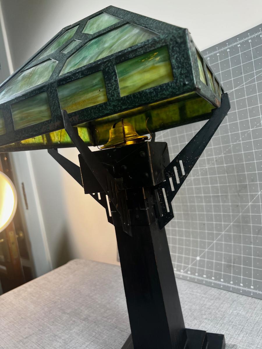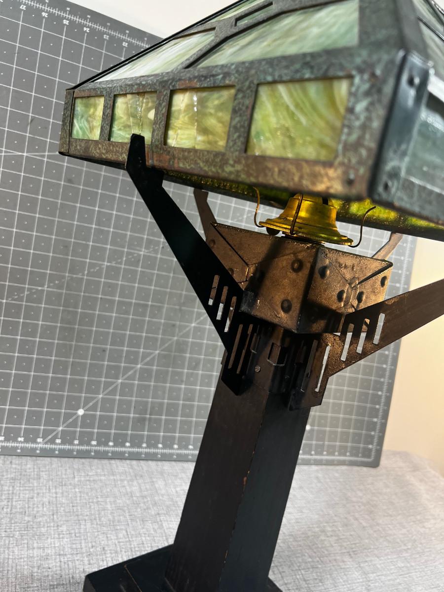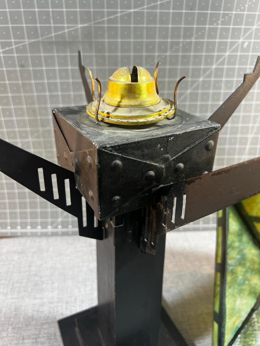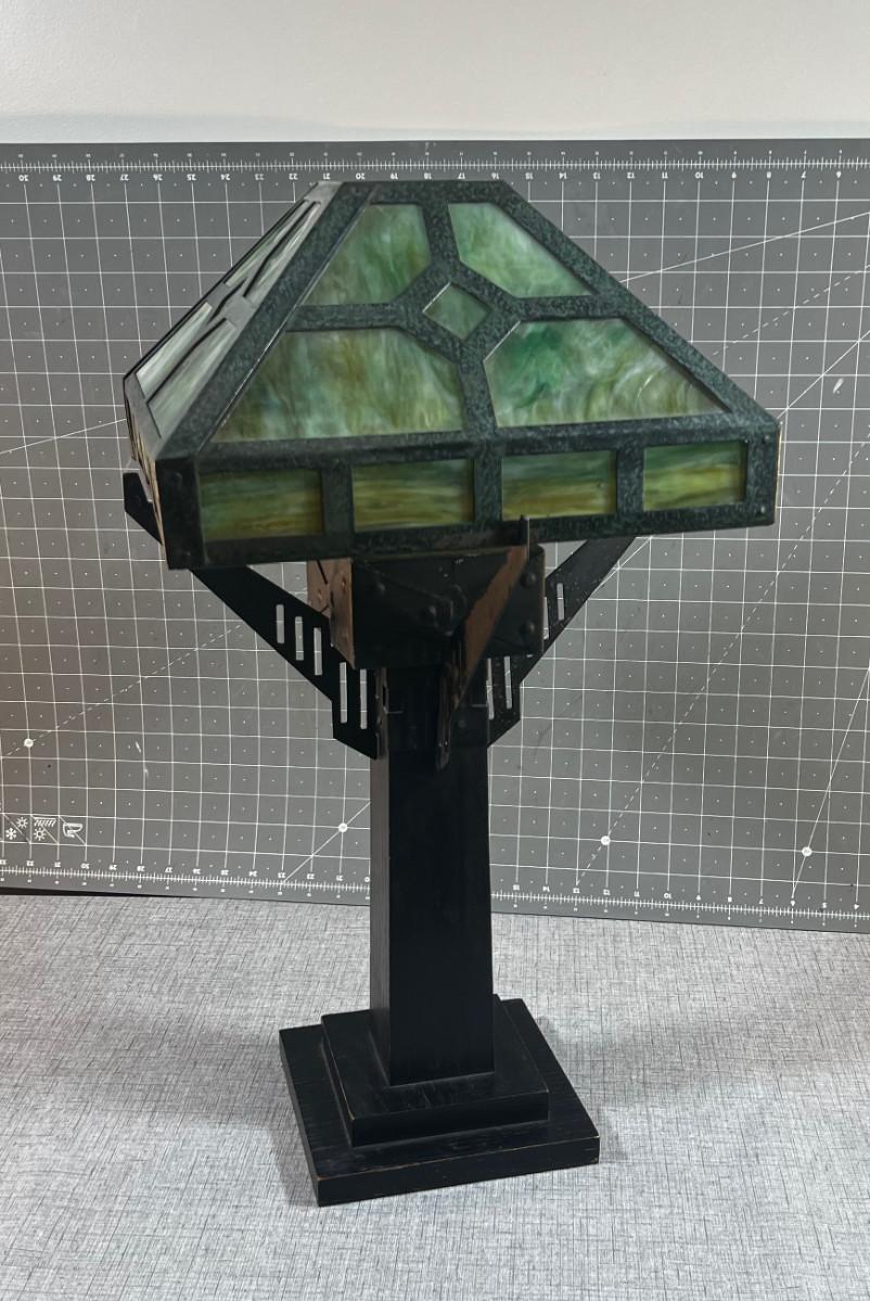 Antique Slag Glass Prairie Style Mission Kerosene Lamp, Oak Base looks to be complete and in working condition, rare item c.1910