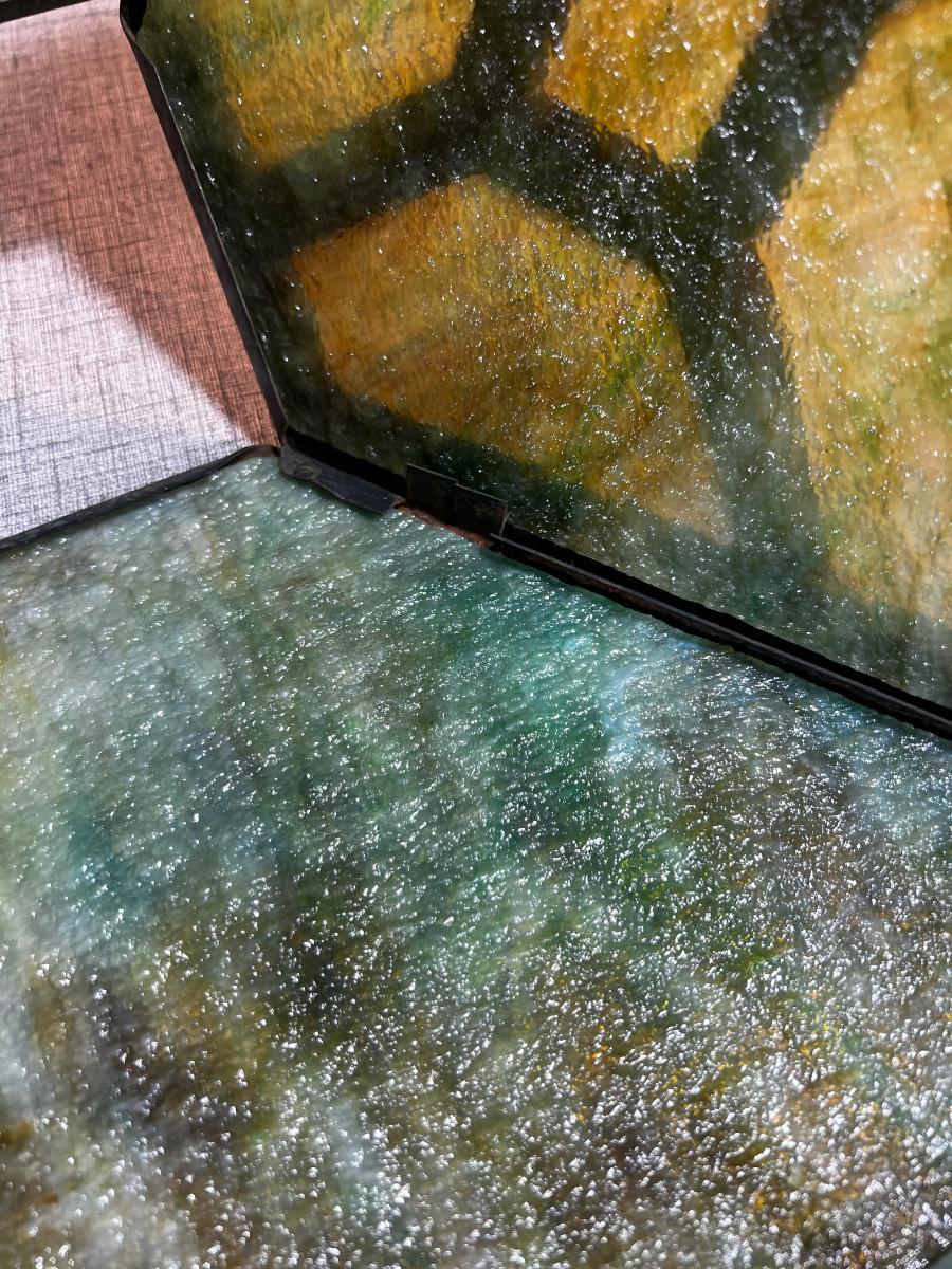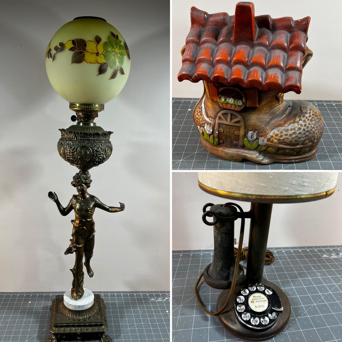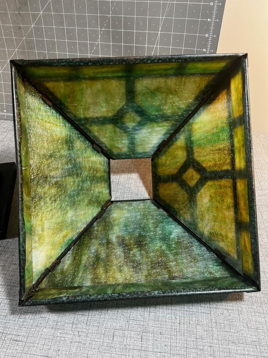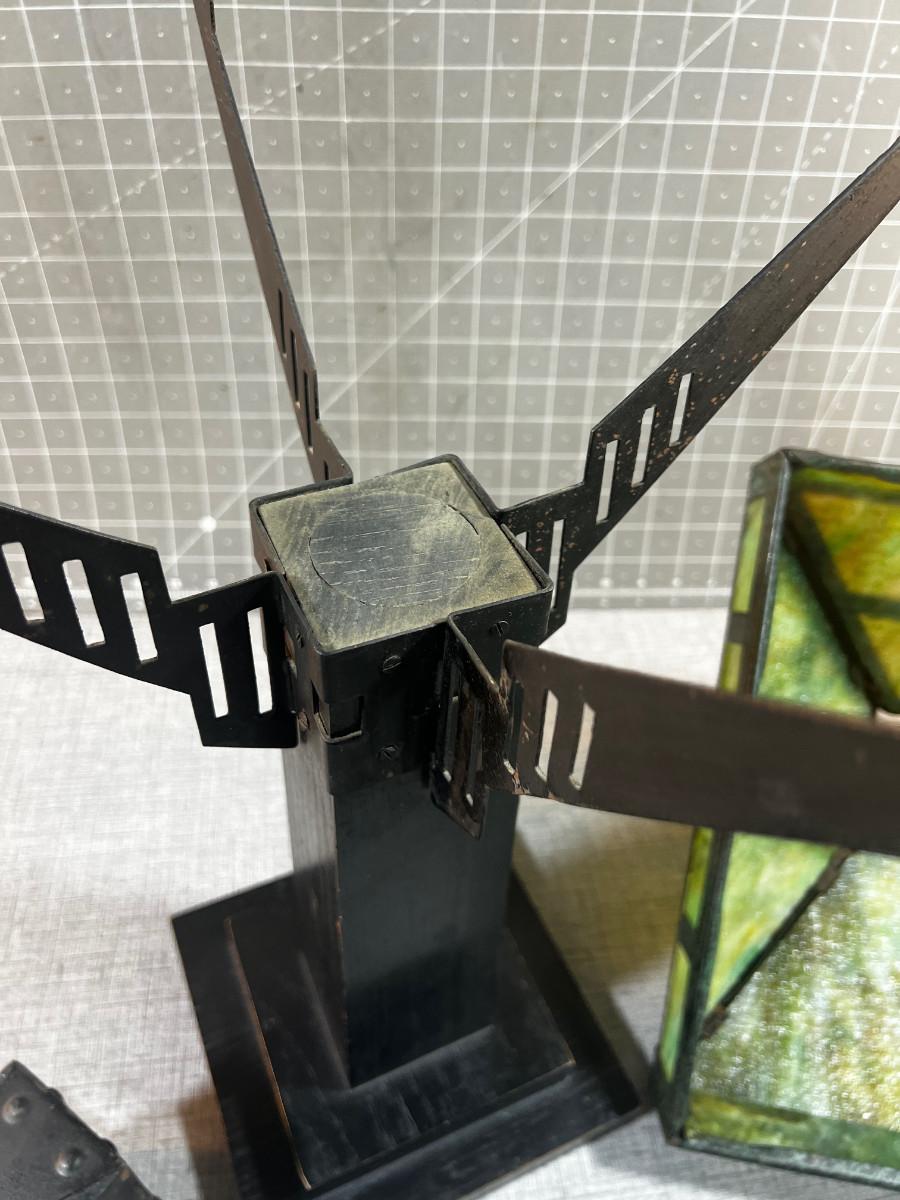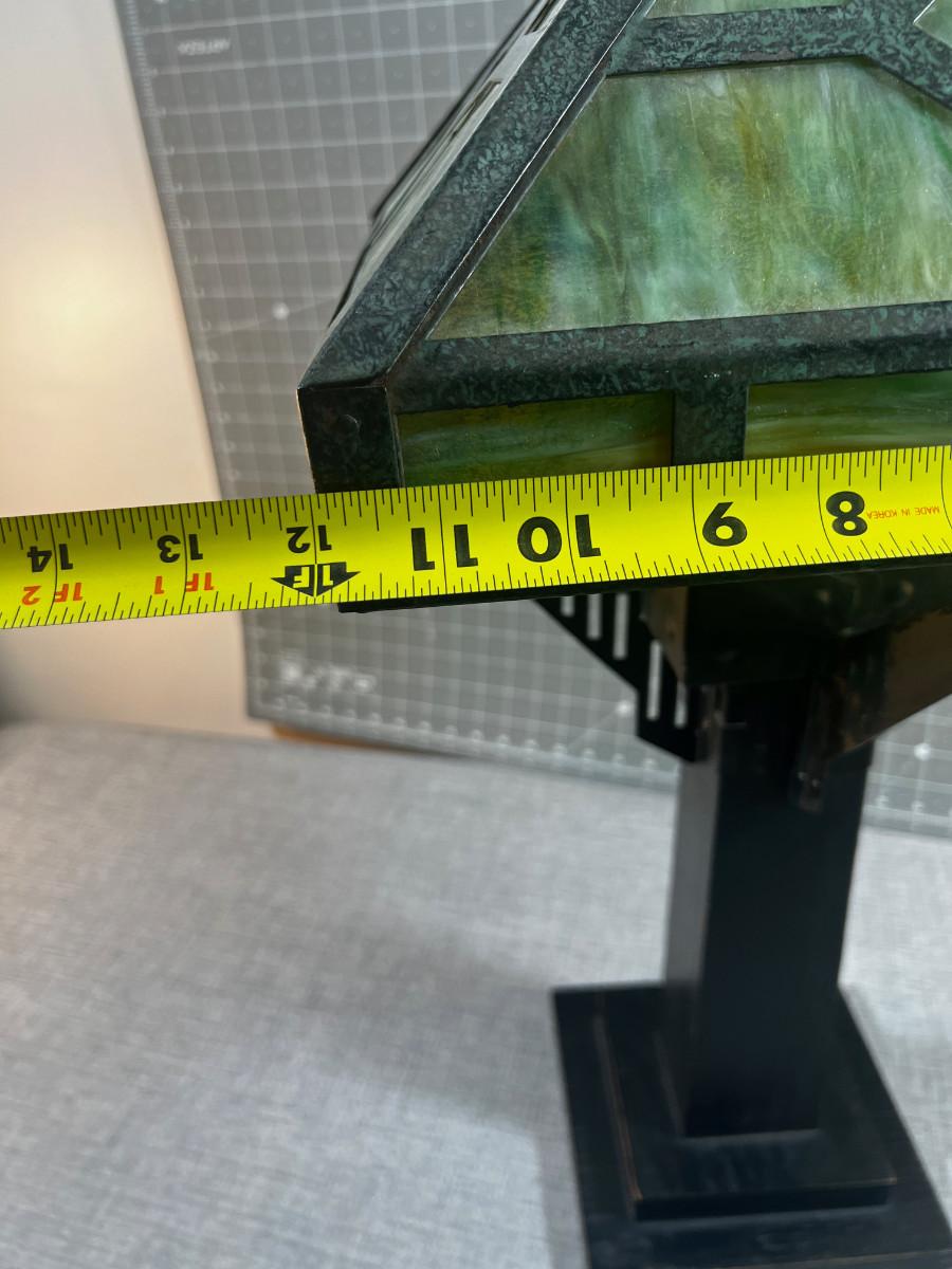 Antique Slag Glass Prairie Style Mission Kerosene Lamp, Oak Base looks to be complete and in working condition, rare item c.1910