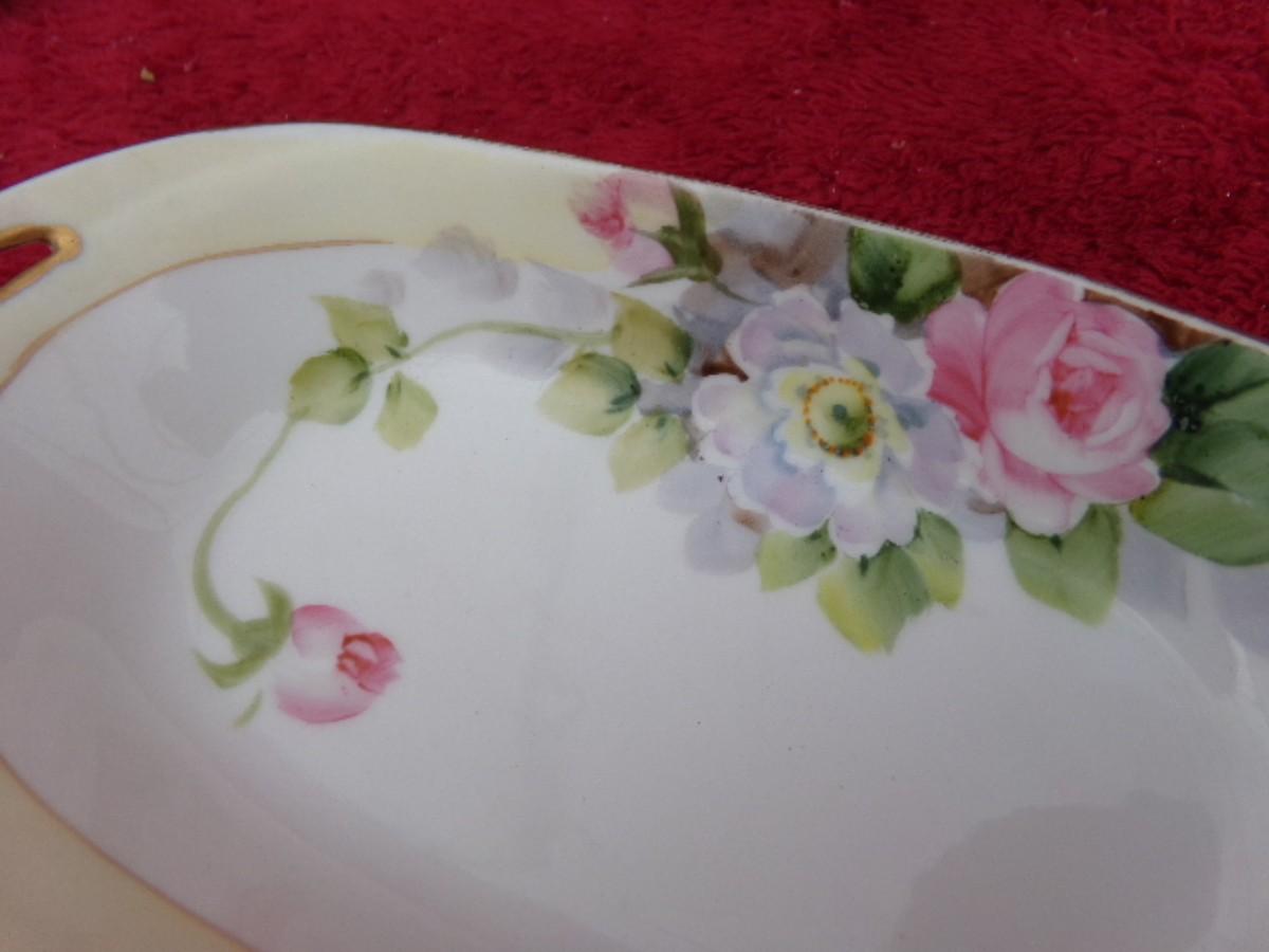Antique small “relish style” dish from “Nippon” (Japan). Made between 1891 & 1921. These can also be used as a contemporary butter dish/server. Beautifully hand paint porcelain w/gold edge trim. EX to near Mint. About 7-1/4" long.