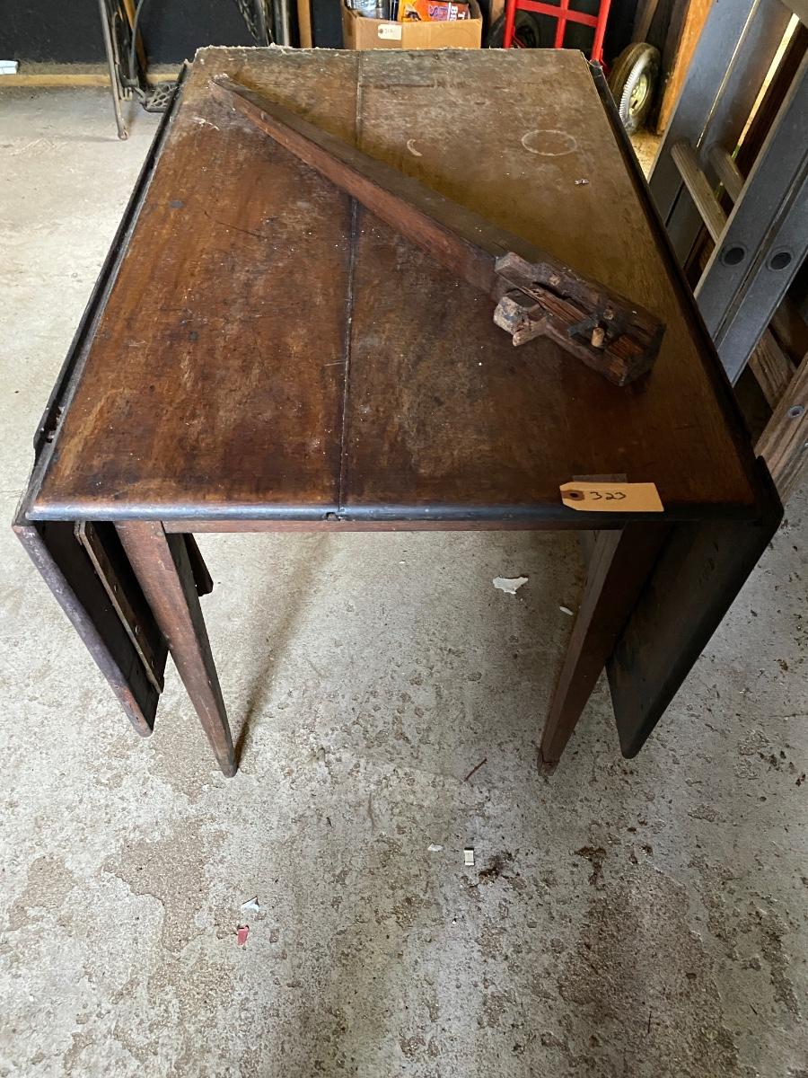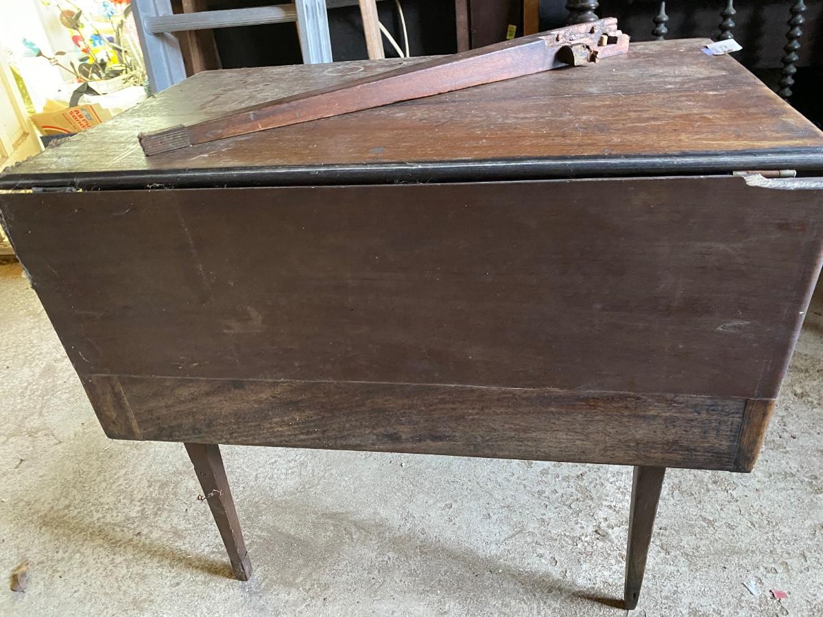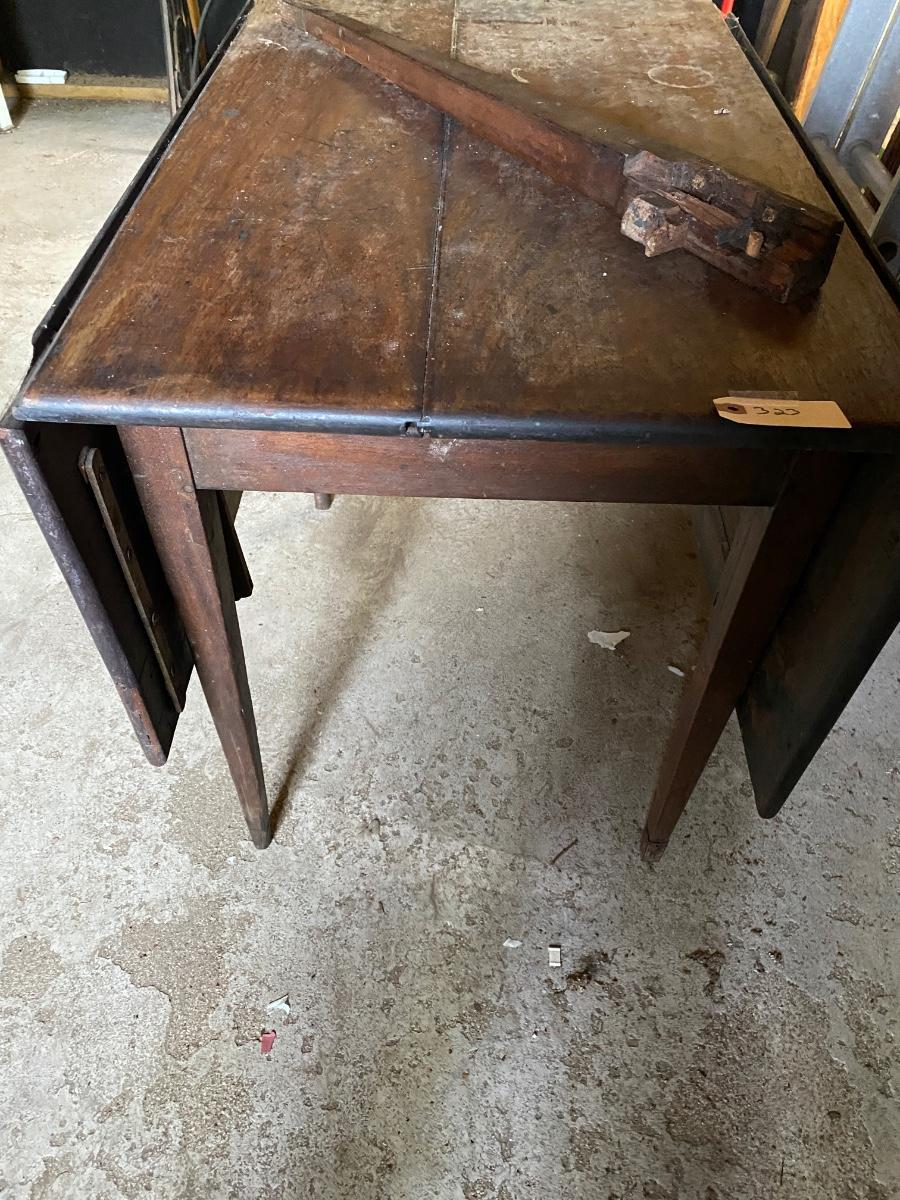 Antique small space drop leaf table, Original finish, one leg needs repair as pictured