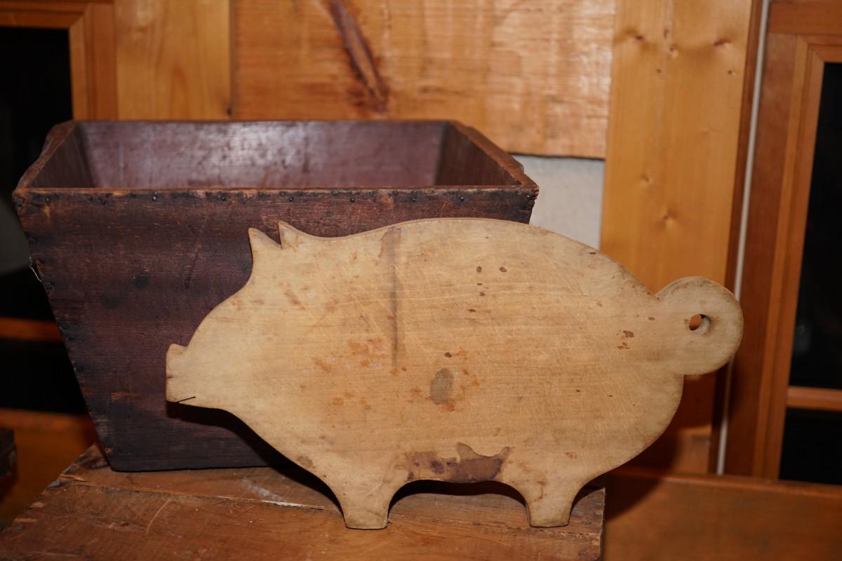 ANTIQUE SMALLER GRAIN BOX & PIG CUTTING BOARD CUT OUT.