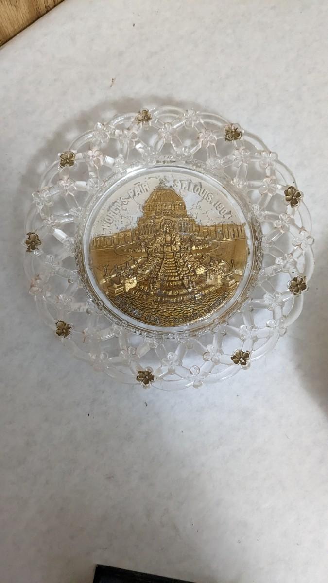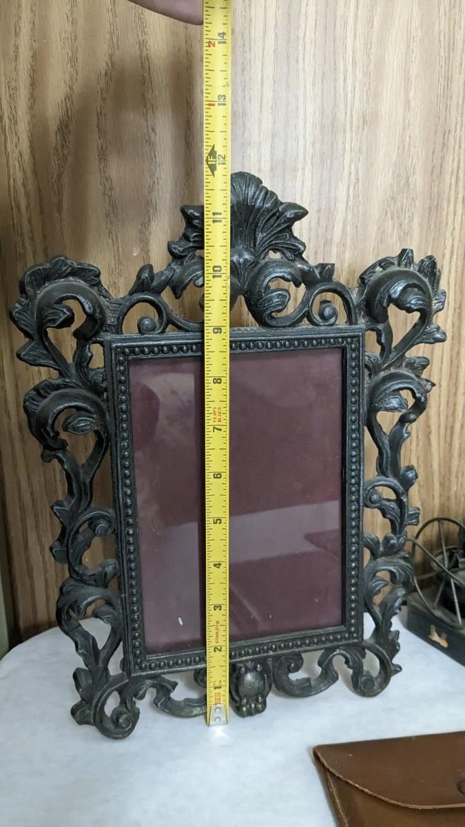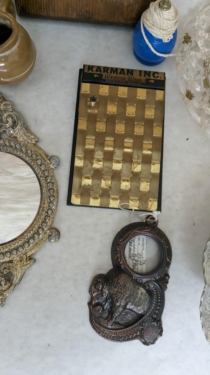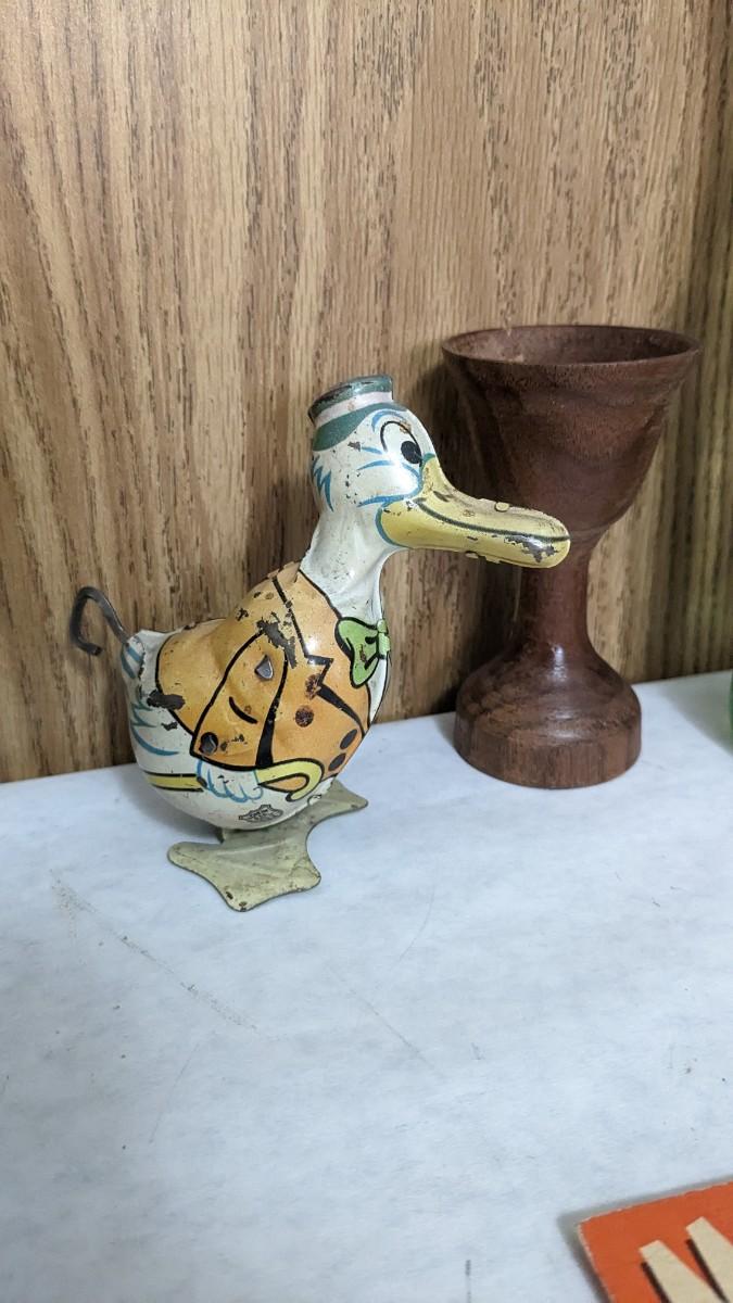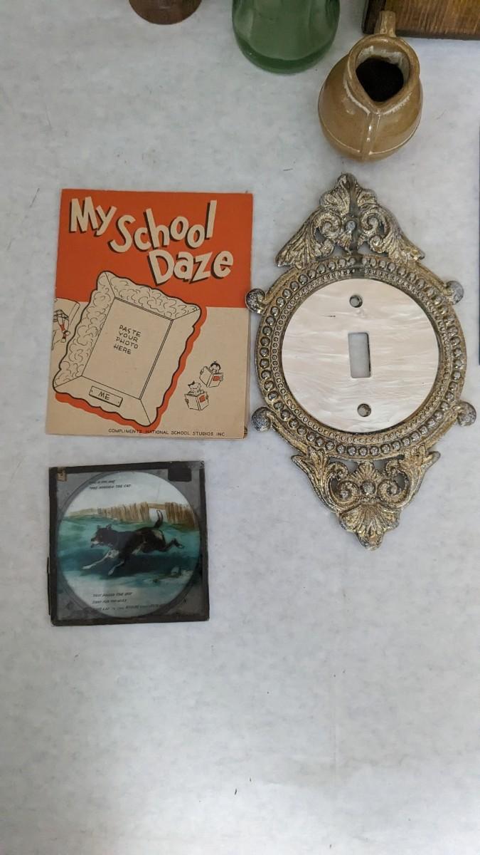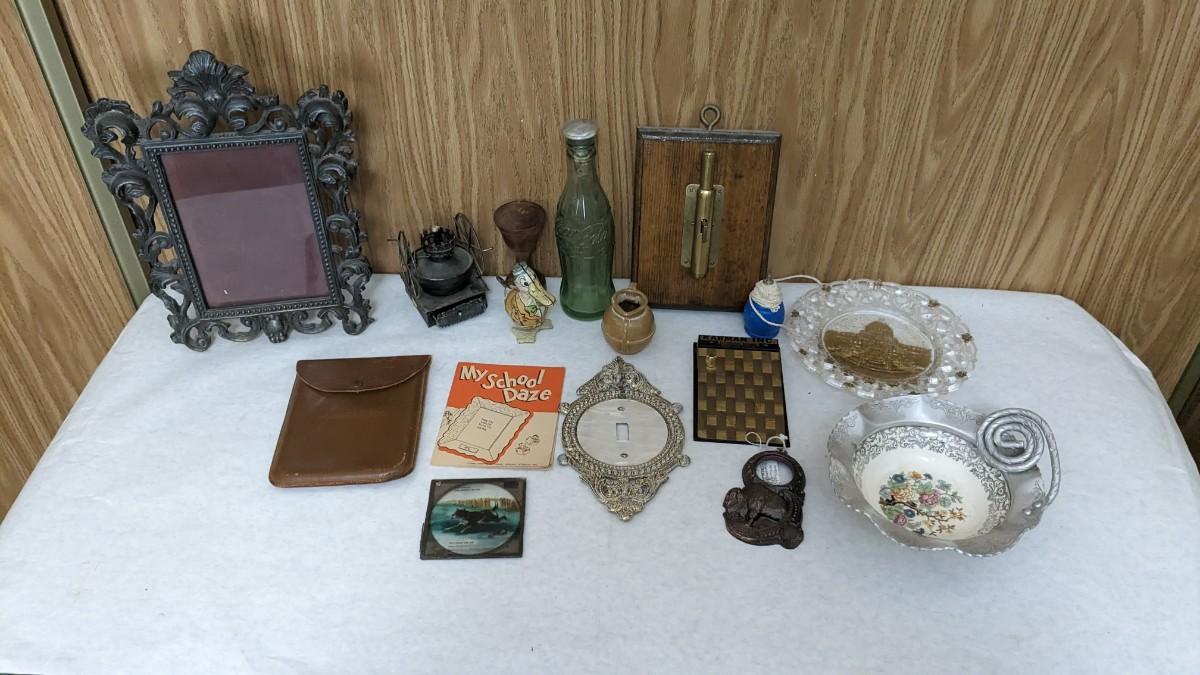 a very fun little lot of antiques. Includes cast iron picture frame, stereoscope type b-3, a small Frankoma pitcher, tin toy duck with key that winds but has trouble walking, a beautiful Farber & Shlevin porcelain bowl with silver edging, 1904 World's Fair St. Louis decorative dish, pearl inlay light switch cover, a very unique mounted brass bolt, and more! Some pieces that need their mates, all in all a fun lot! bdrm1