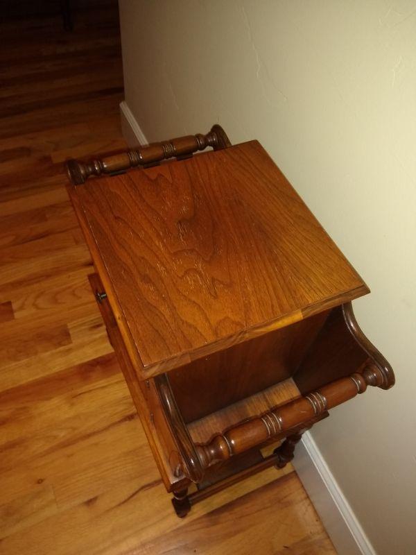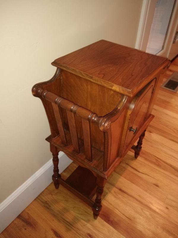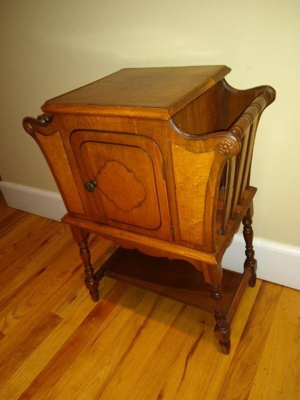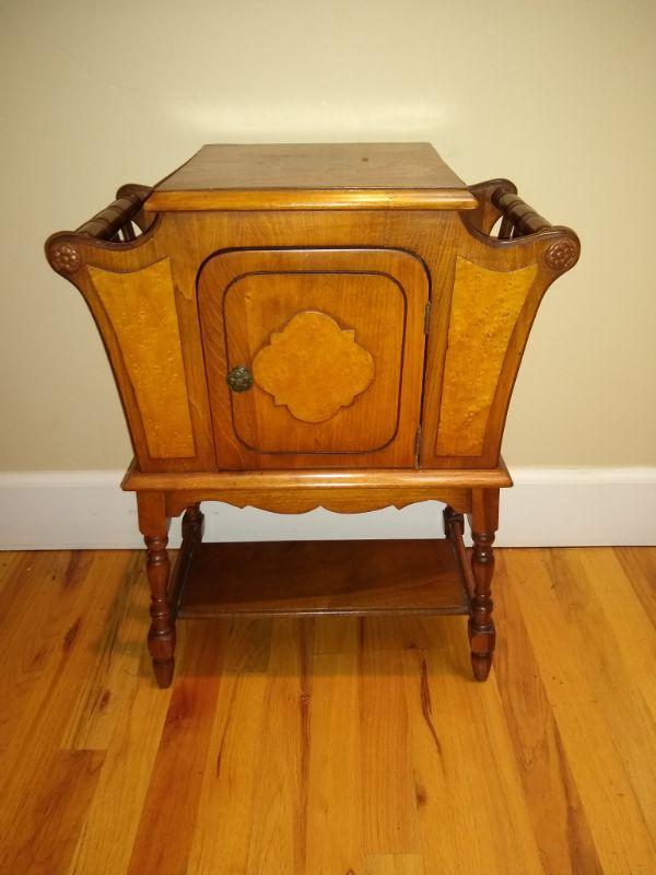 This little cabinet in excellent condition. Has newspaper or magazine holders on each side. Copper lined.