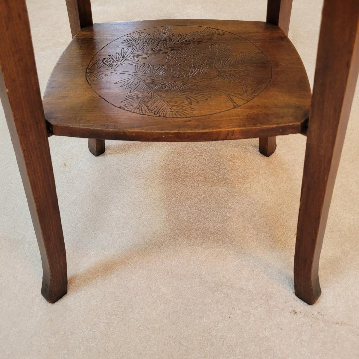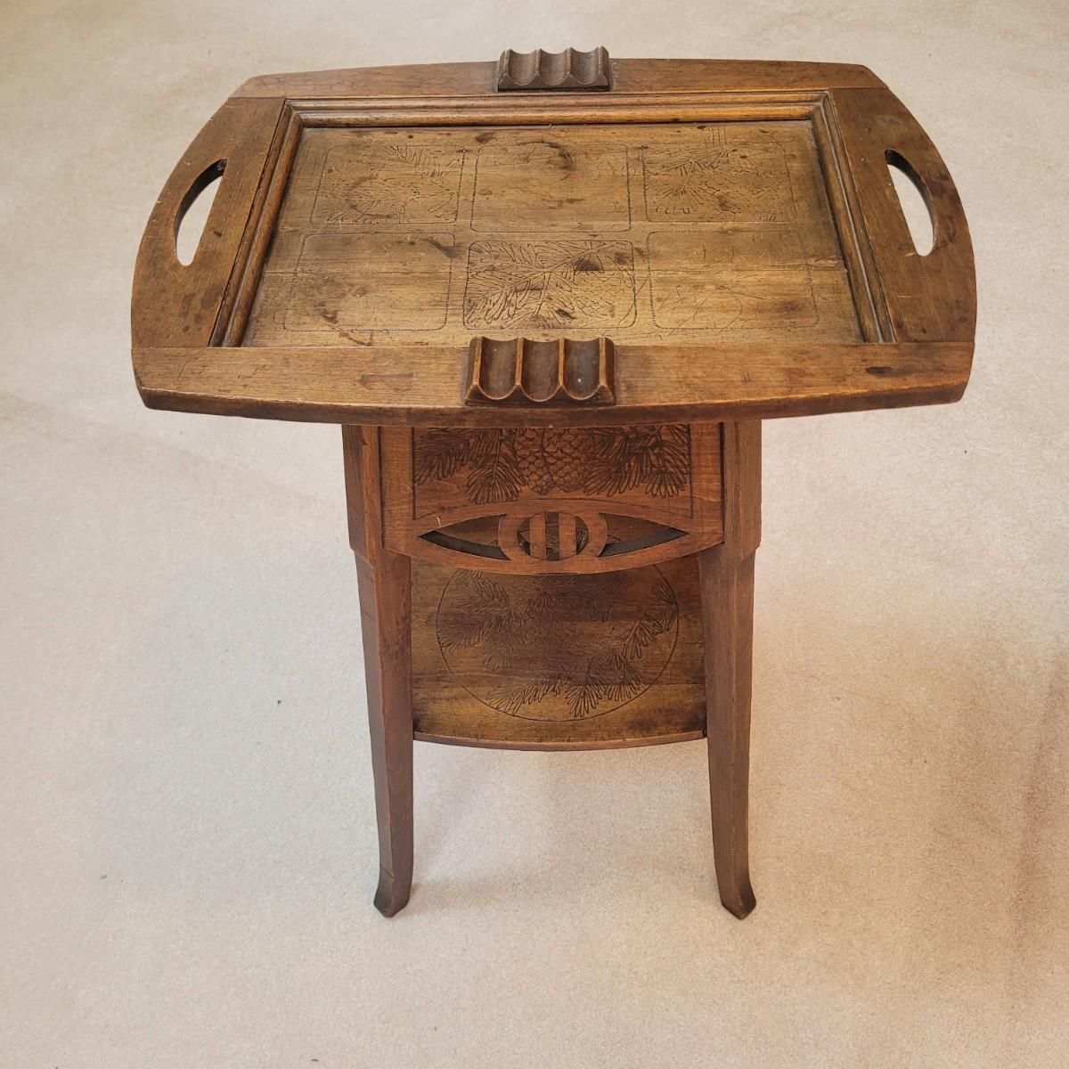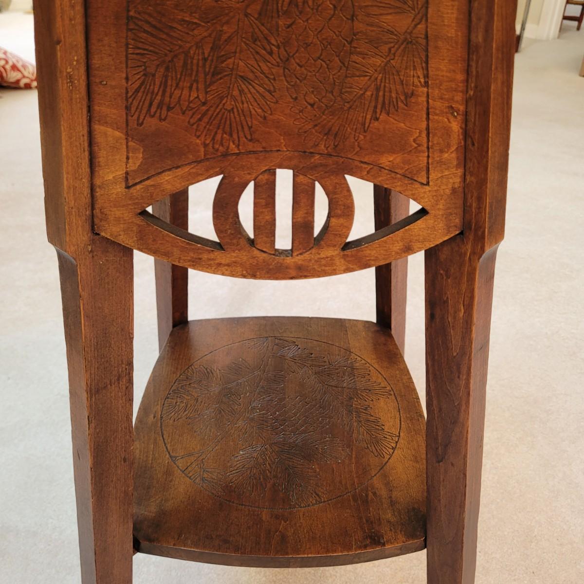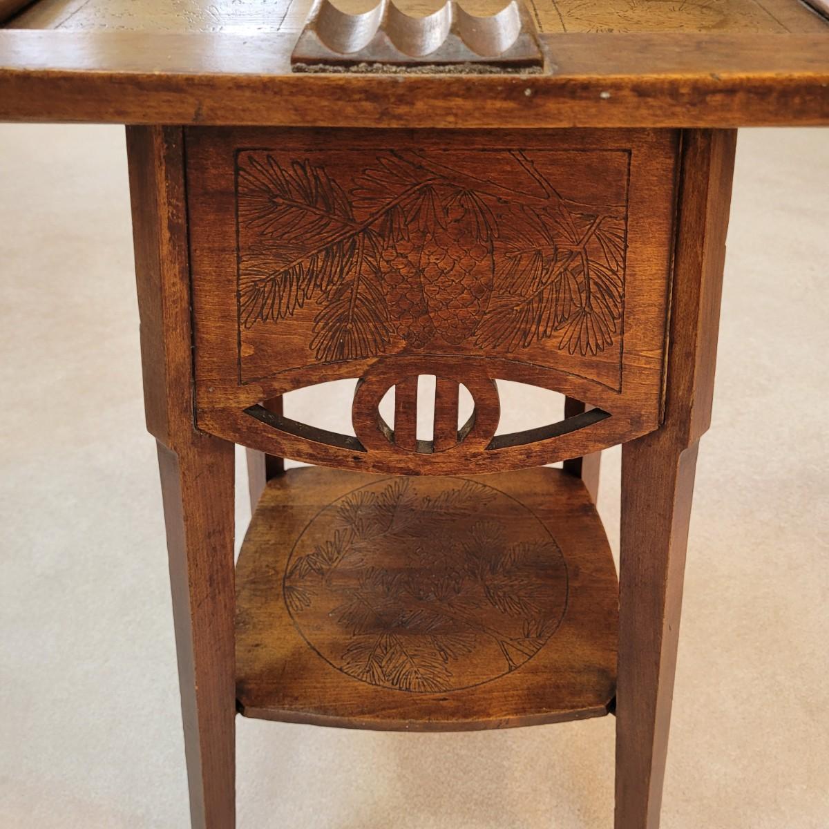 Antique style wooden smoking table. Seller states that it is from the mid 1800's and made in Ulm, Germany, though there is not documentation to verify this. The table is made from wood and features beautiful pine themed carvings and etchings. On the top, there are two wooden grooves for resting cigars or cigarettes. The surface has wear and burn marks. Item measures 20" x 14" x 30"H.