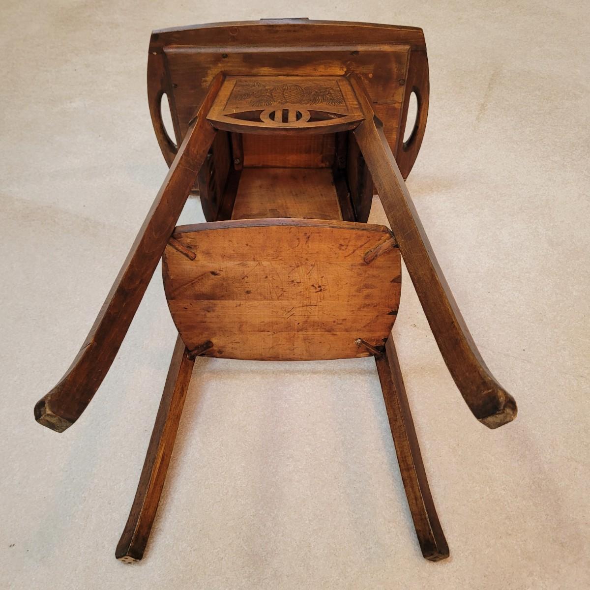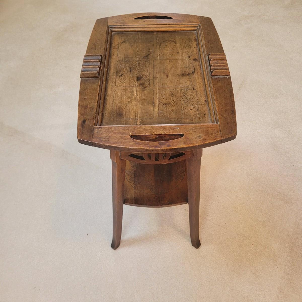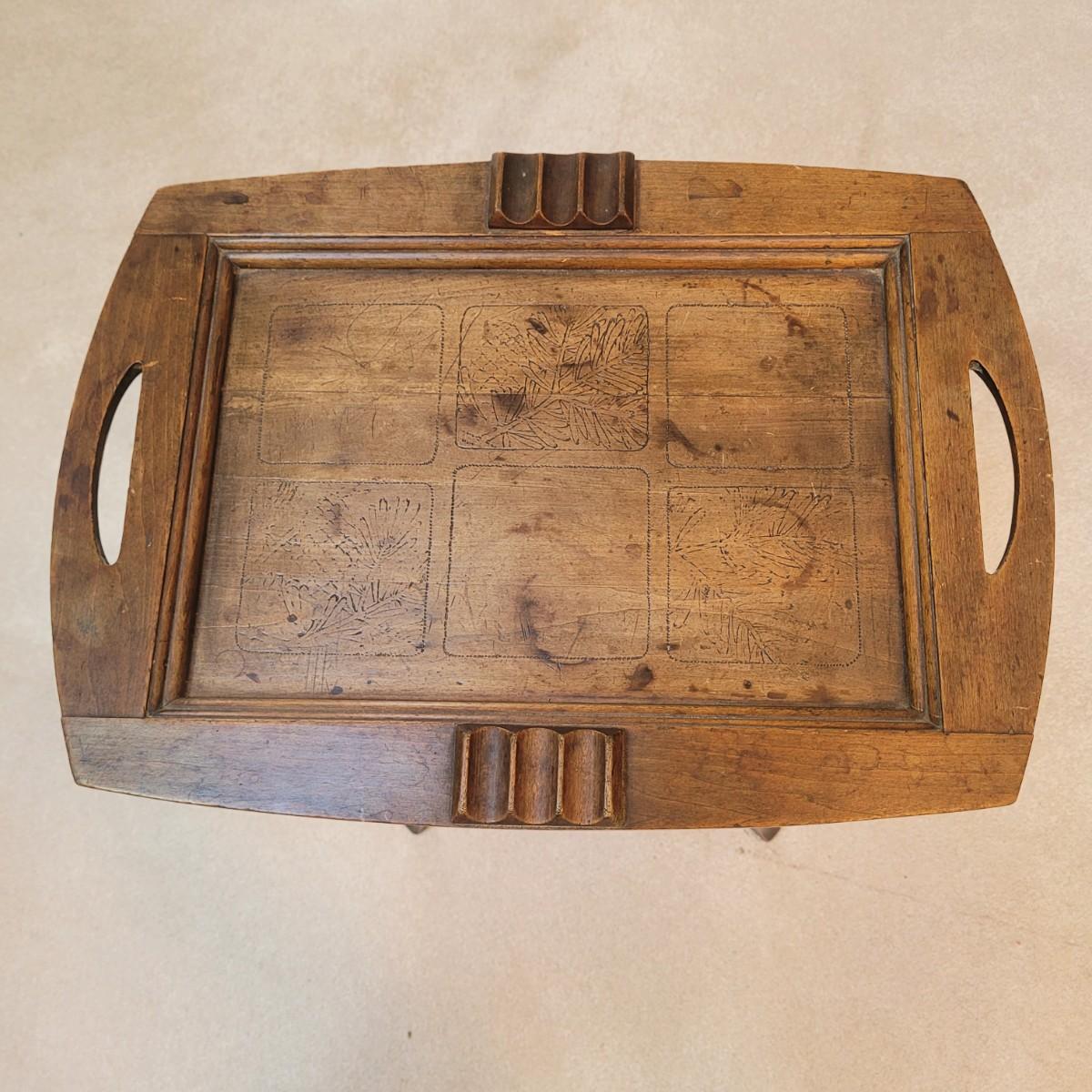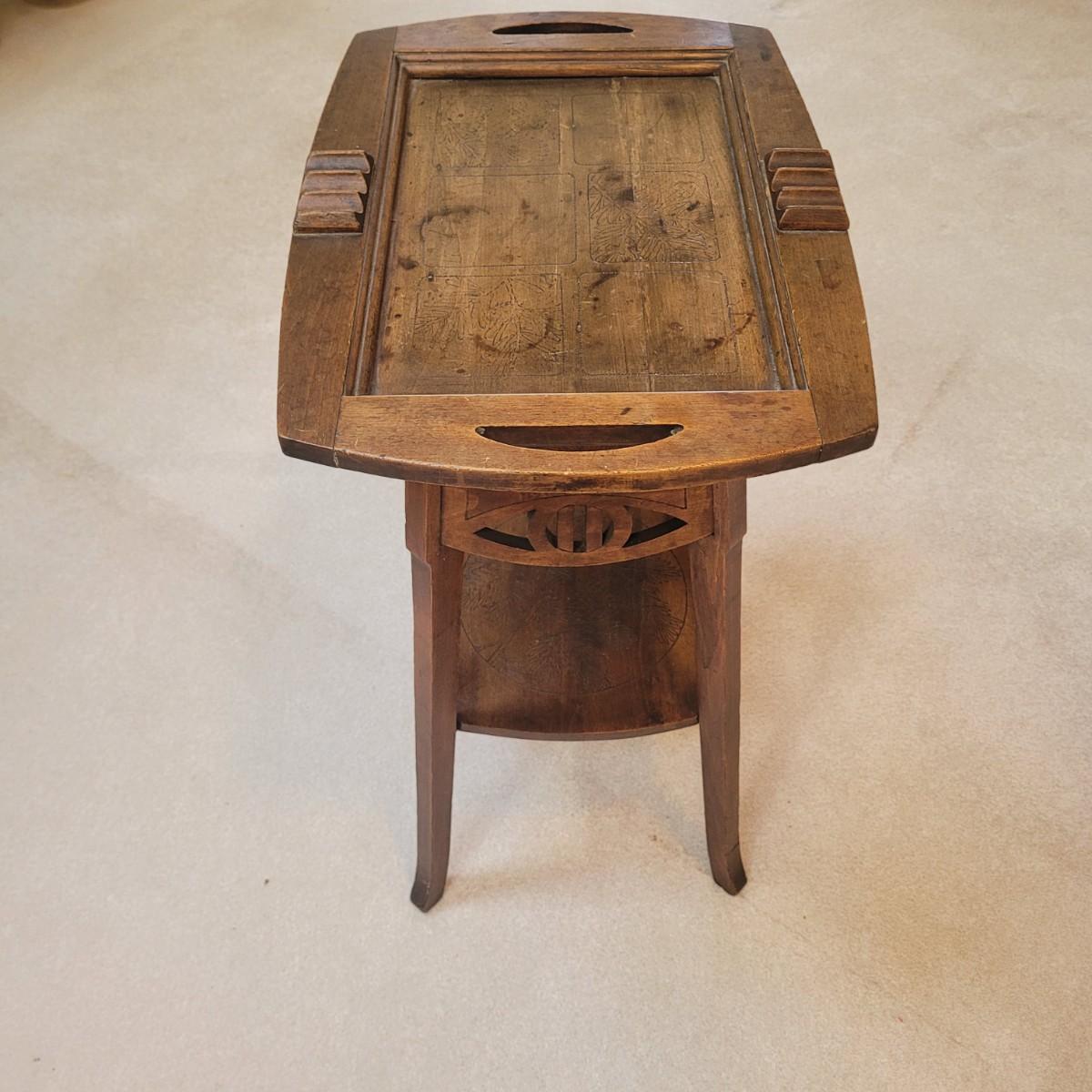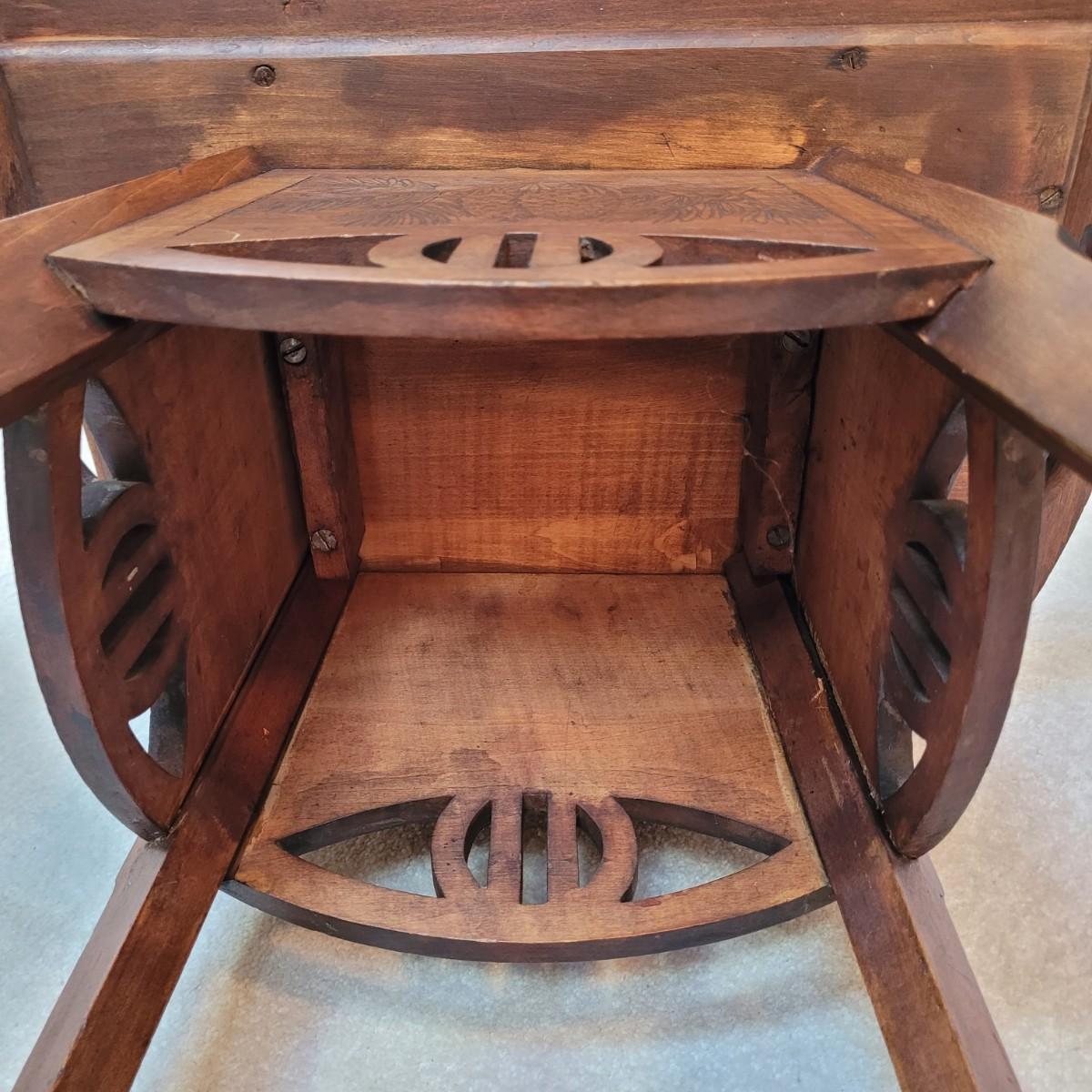Antique style wooden smoking table. Seller states that it is from the mid 1800's and made in Ulm, Germany, though there is not documentation to verify this. The table is made from wood and features beautiful pine themed carvings and etchings. On the top, there are two wooden grooves for resting cigars or cigarettes. The surface has wear and burn marks. Item measures 20" x 14" x 30"H.
