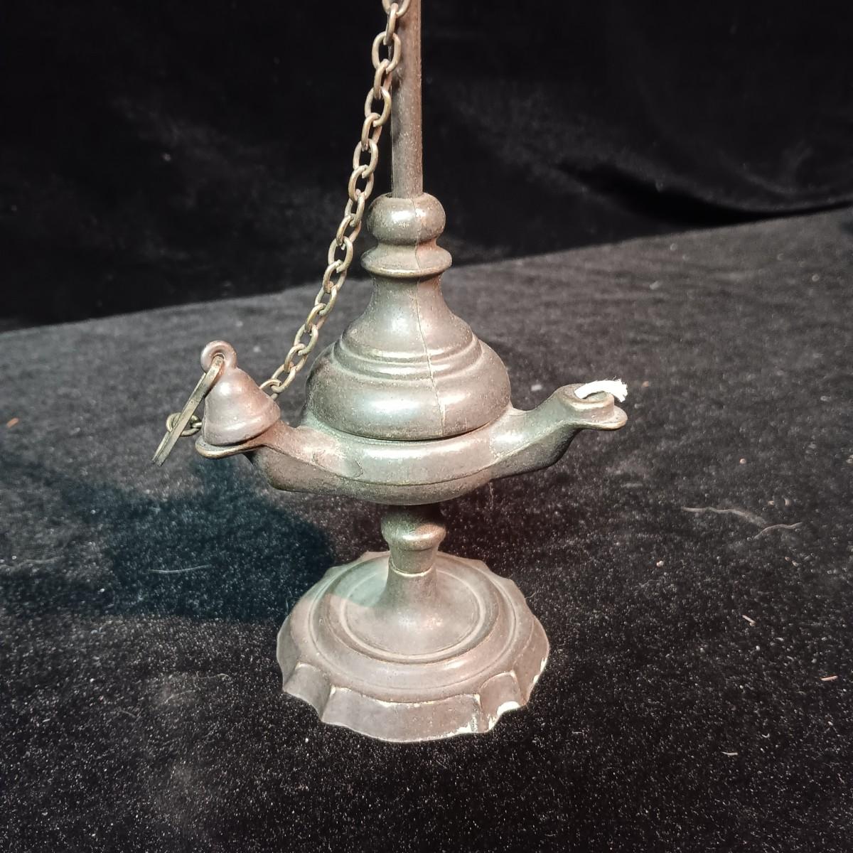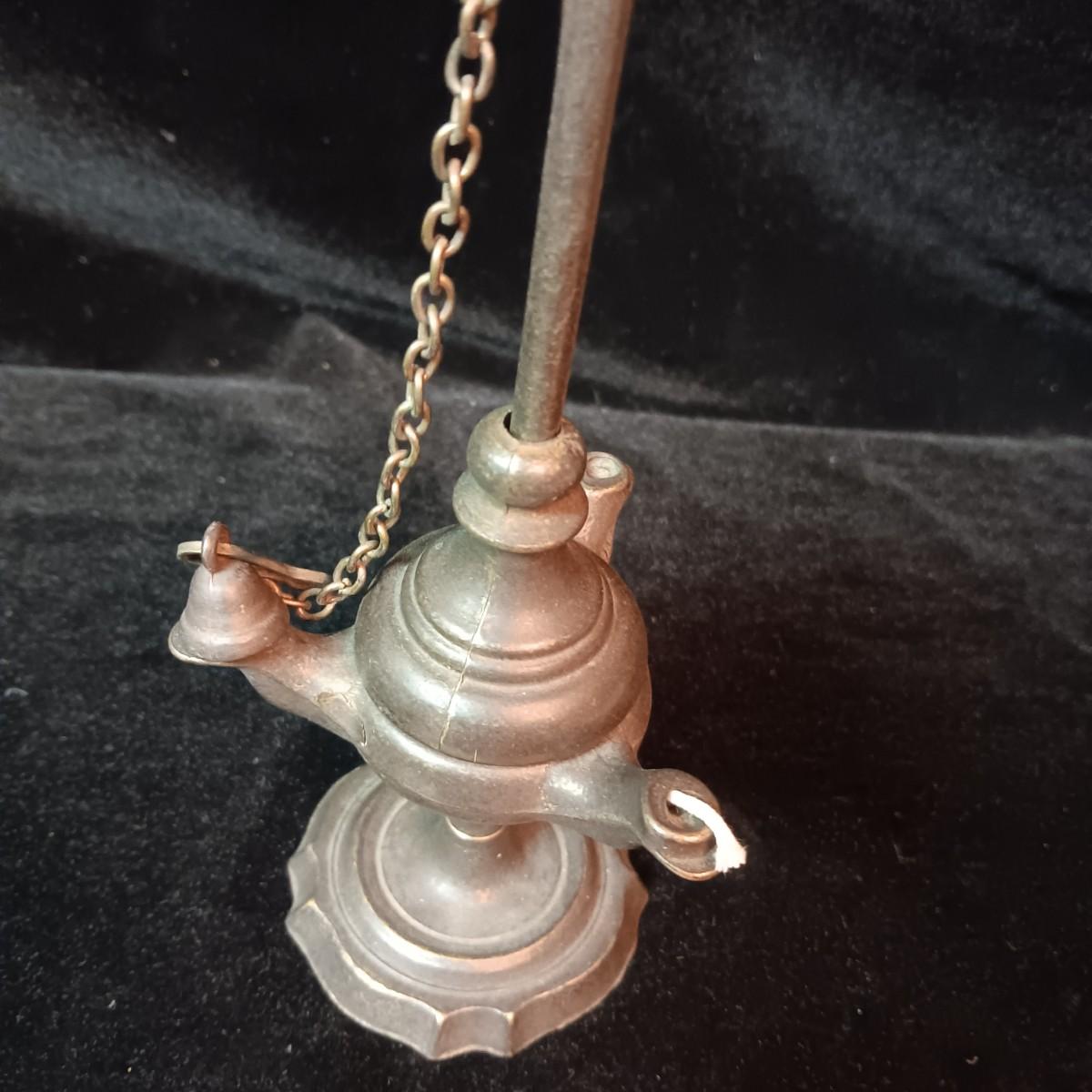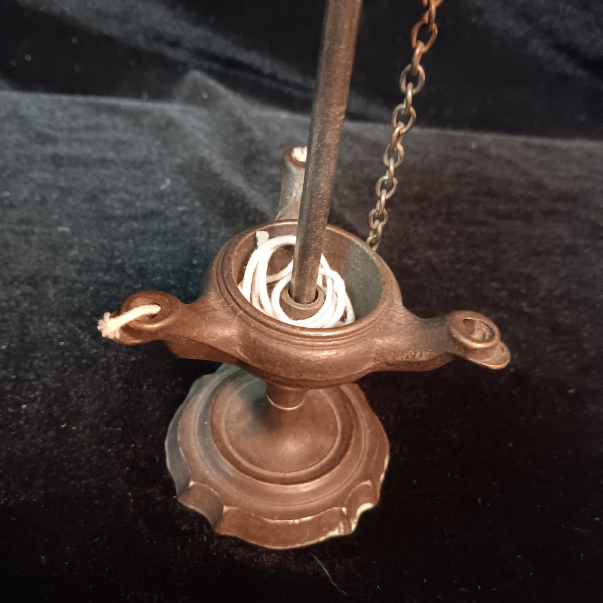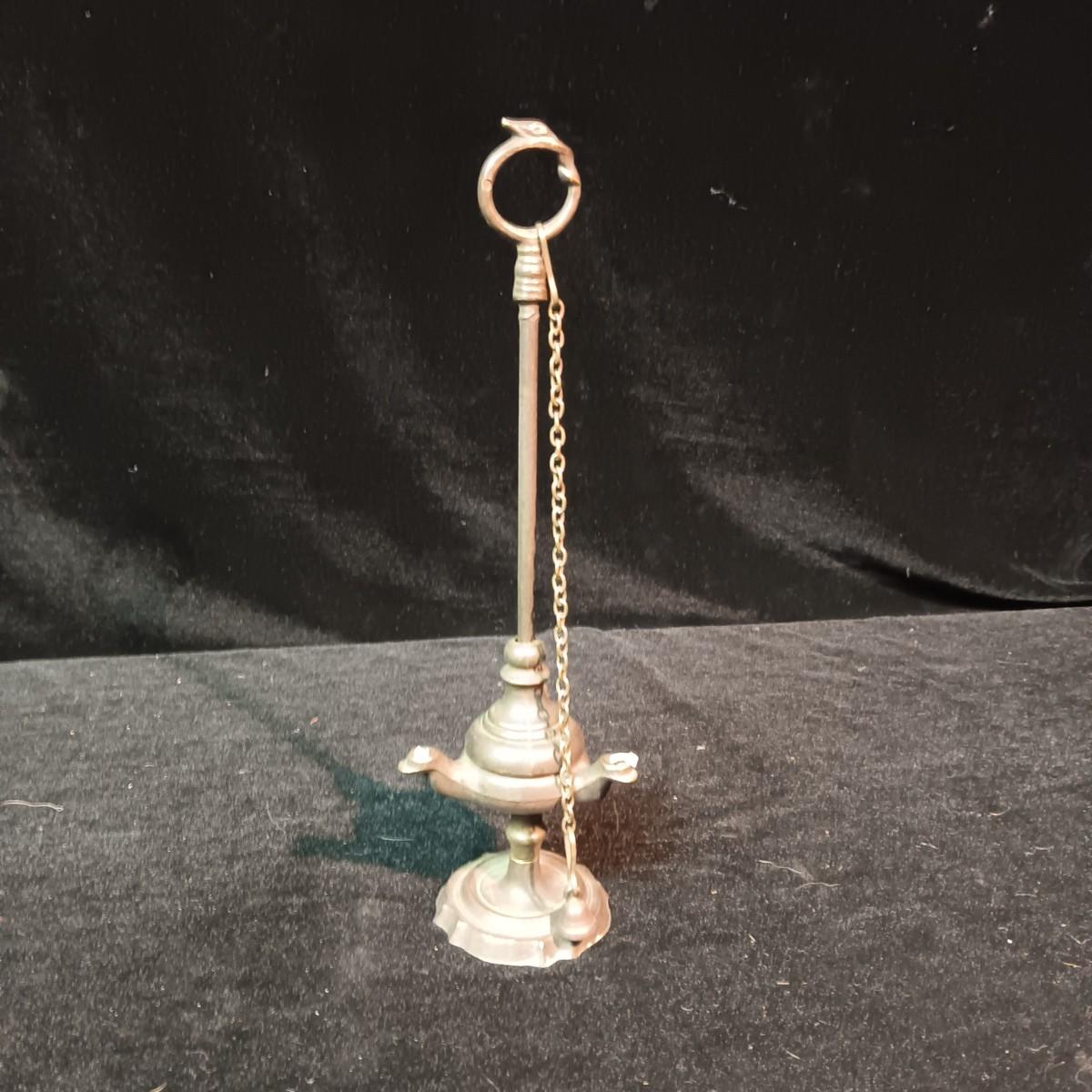 ANTIQUE SNAKE HANDLE, 3 SPOUT FAT WHALE OIL LAMP