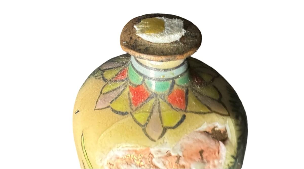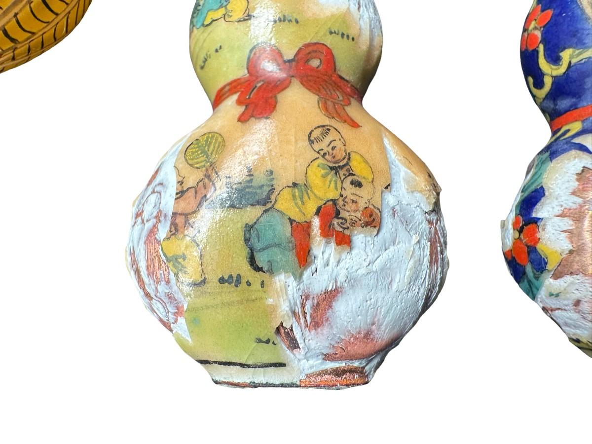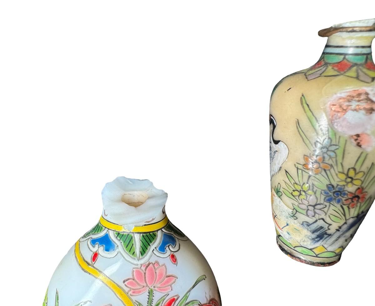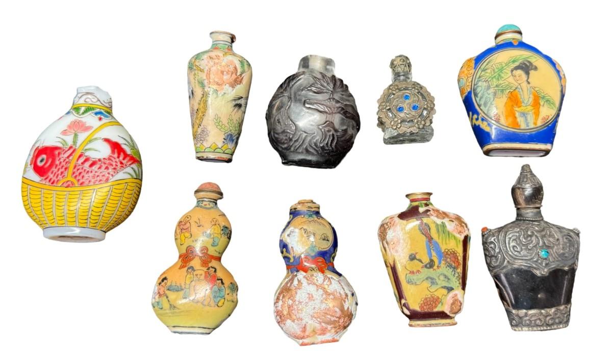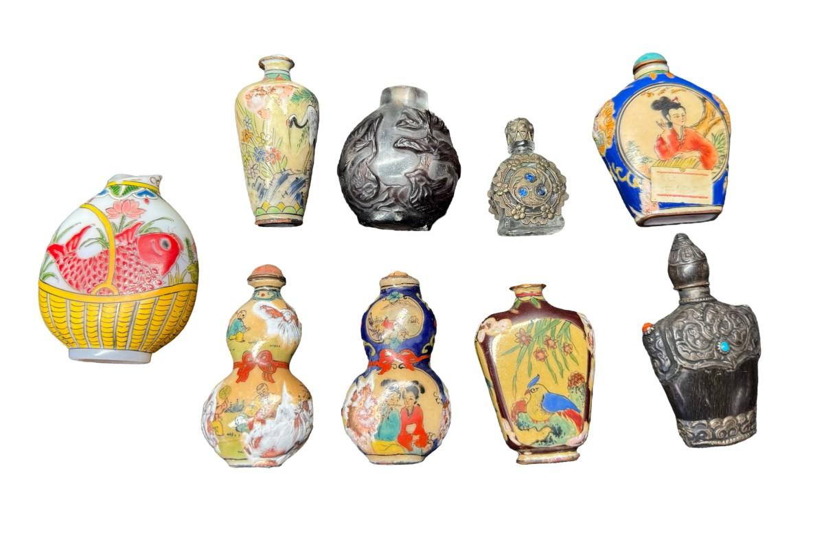 Total of nine pieces. Porcelain, glass, and more. One has silver accents. Most have age related wear, including chips and paint loss. Pre-auction estimate: $100-$200. [MA]