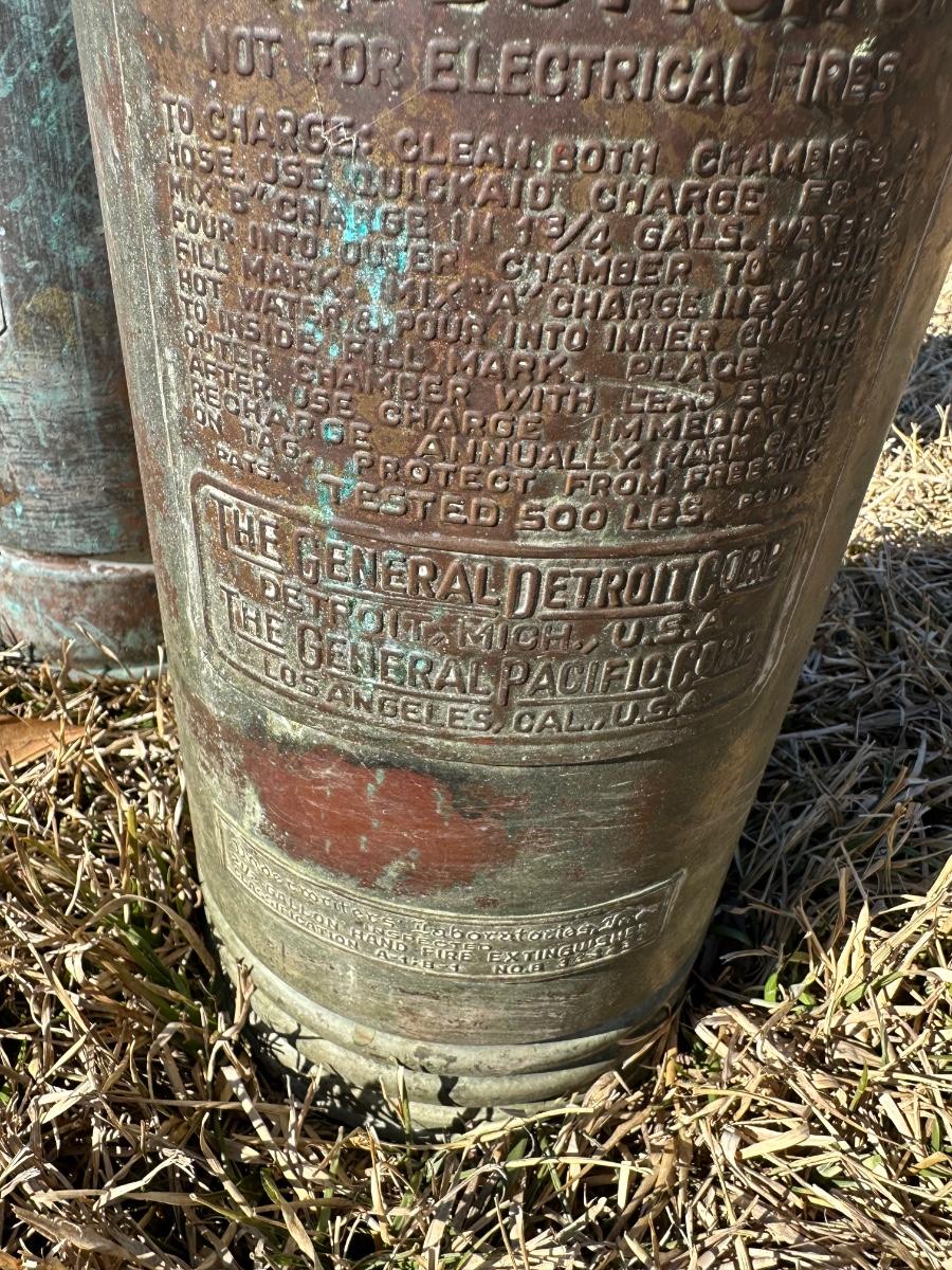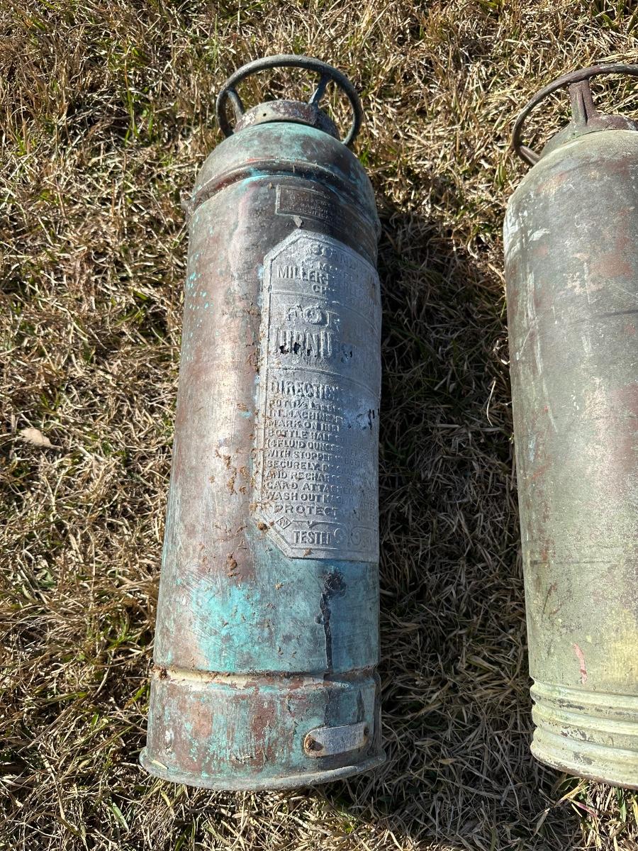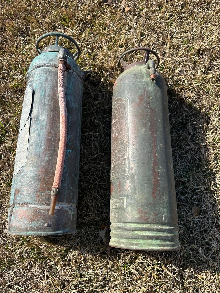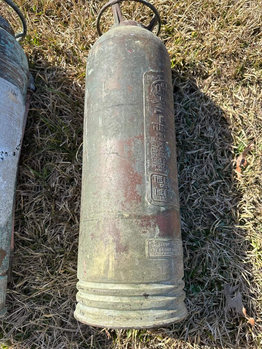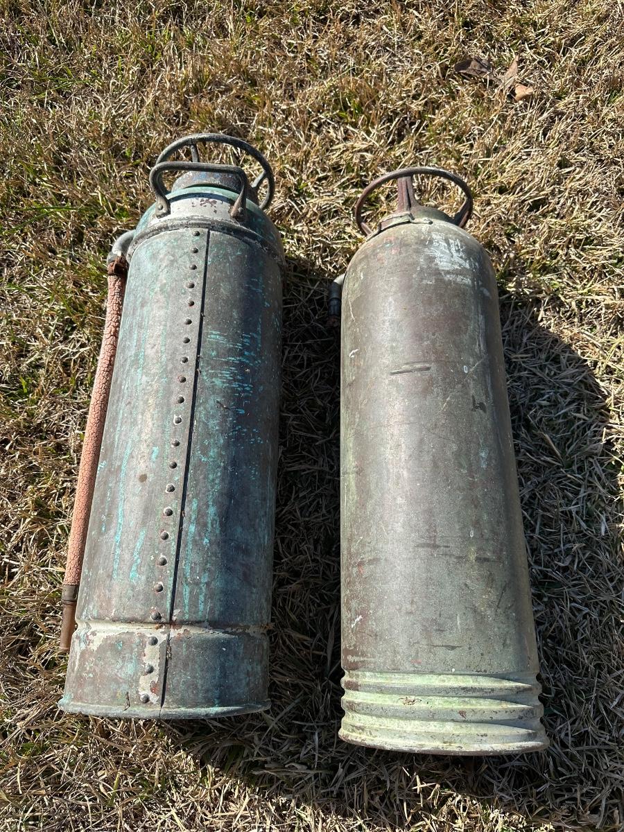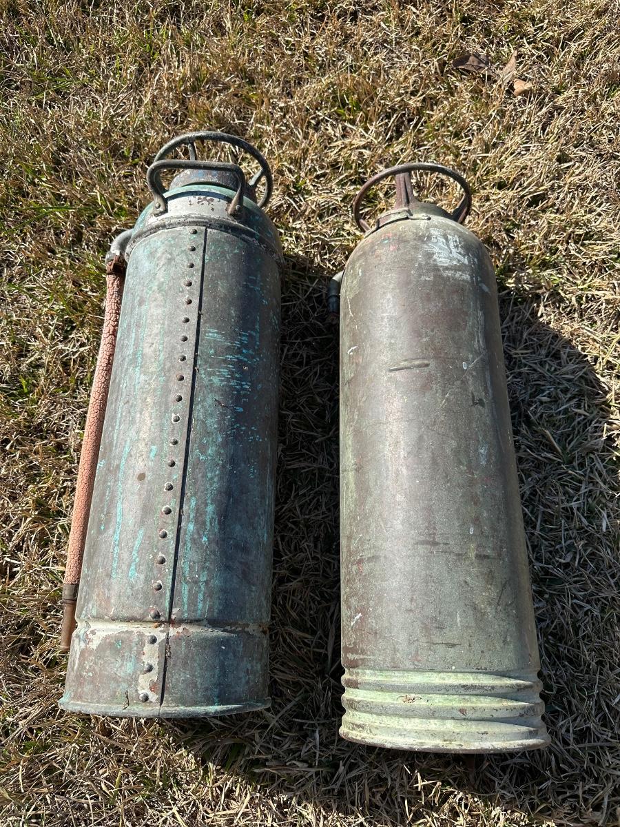 Original early 20th-century chemical fire extinguishers, sold together as a matched industrial pair. Both are authentic pre-WWII units with heavy copper/brass construction, original fittings, and deeply embossed instruction panels.