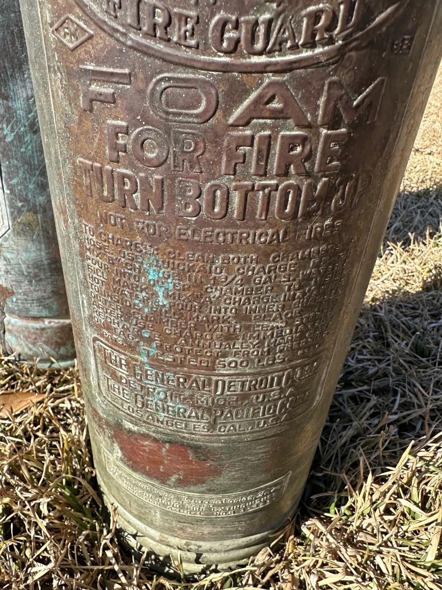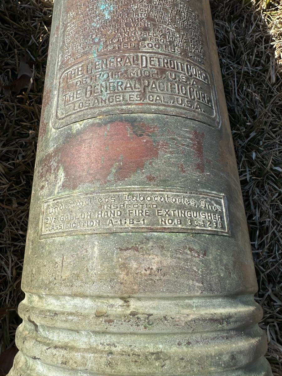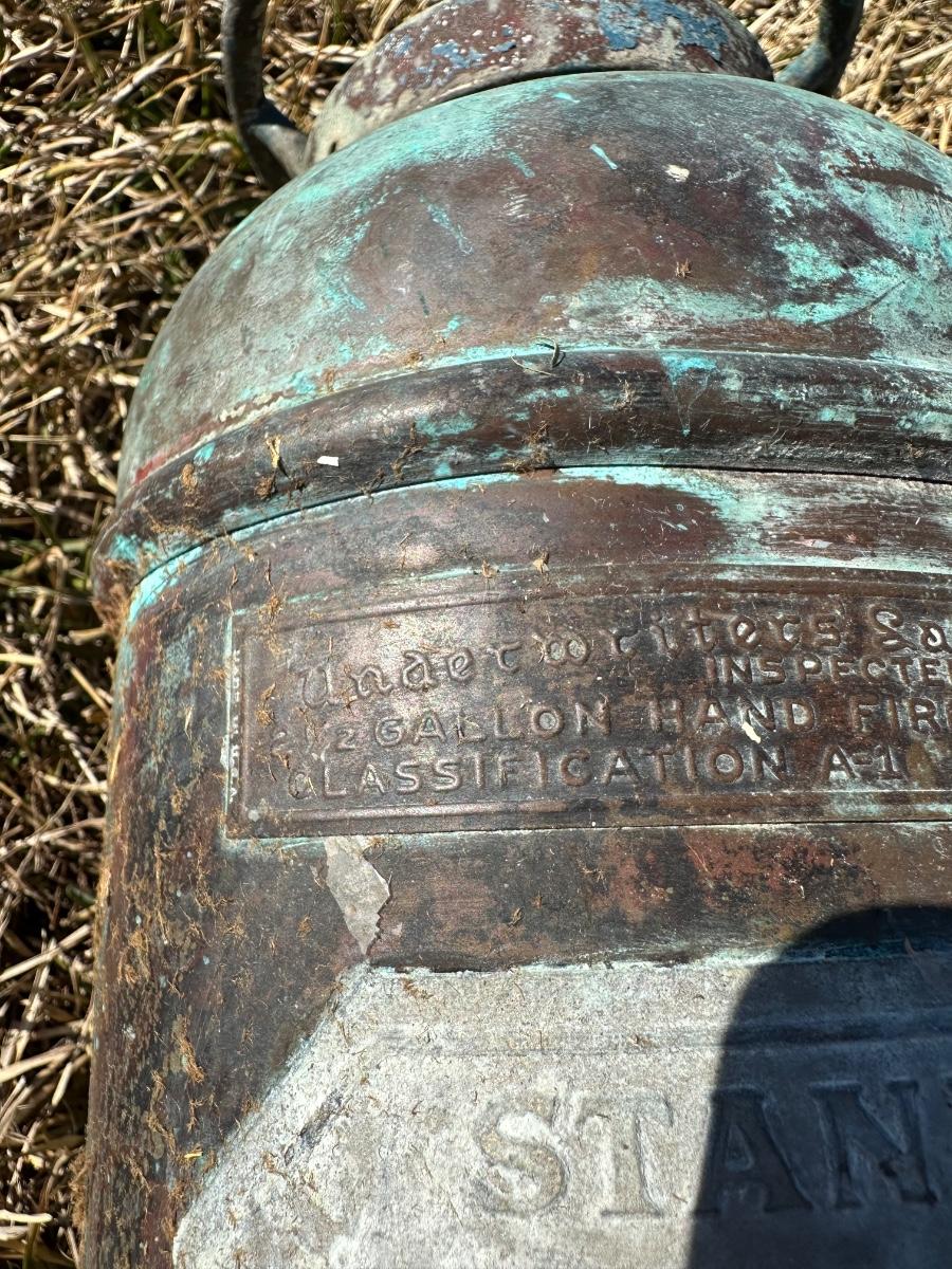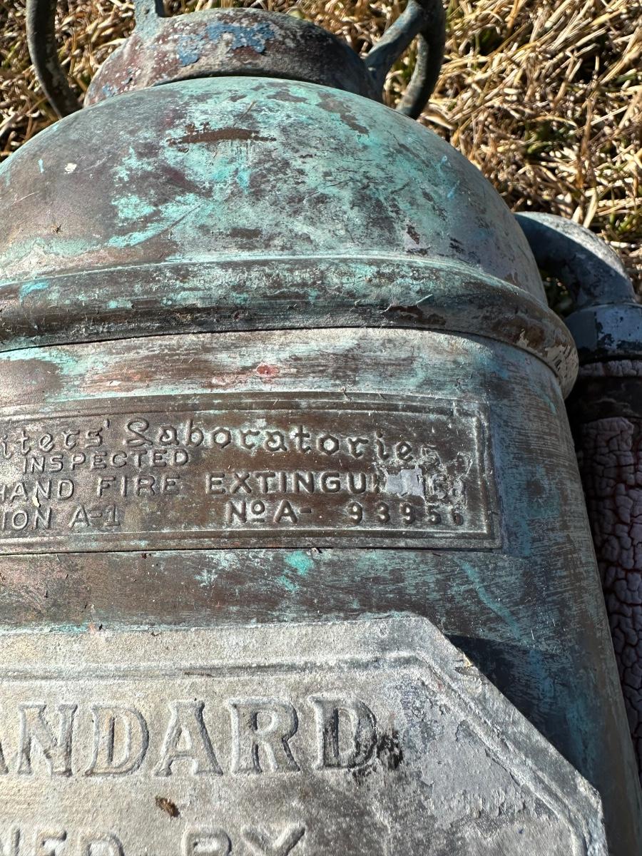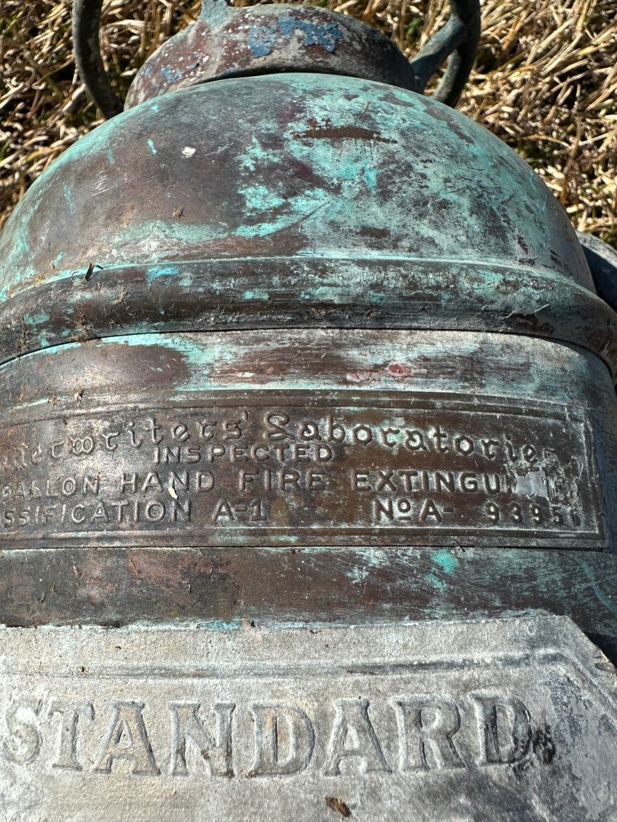 Original early 20th-century chemical fire extinguishers, sold together as a matched industrial pair. Both are authentic pre-WWII units with heavy copper/brass construction, original fittings, and deeply embossed instruction panels.