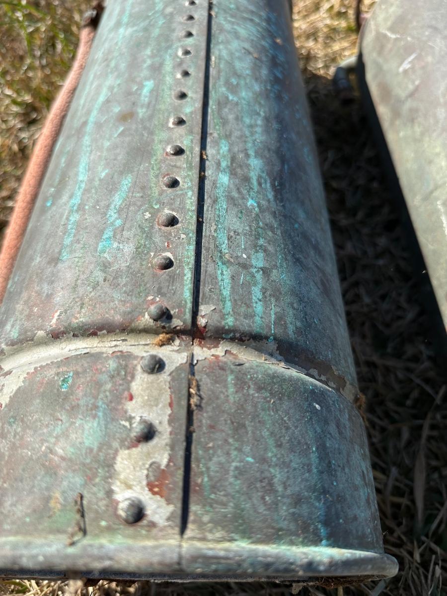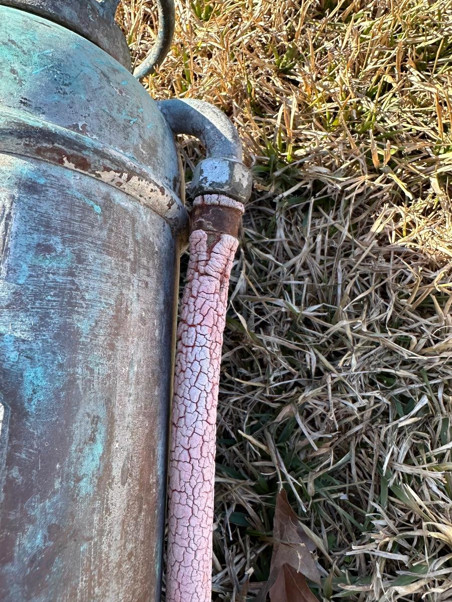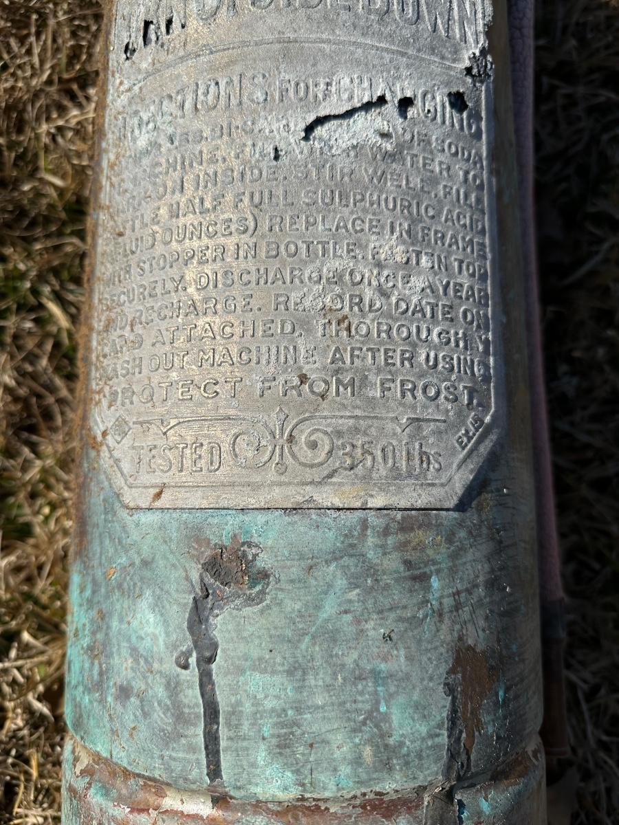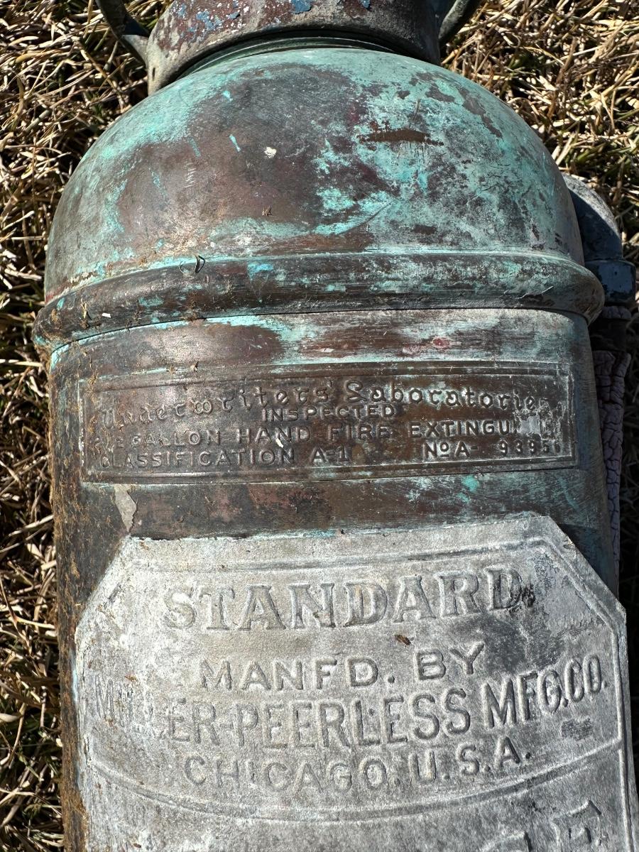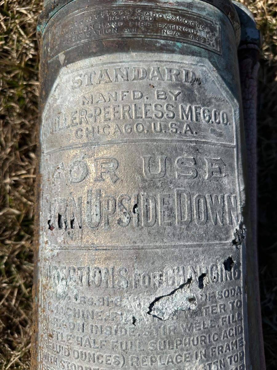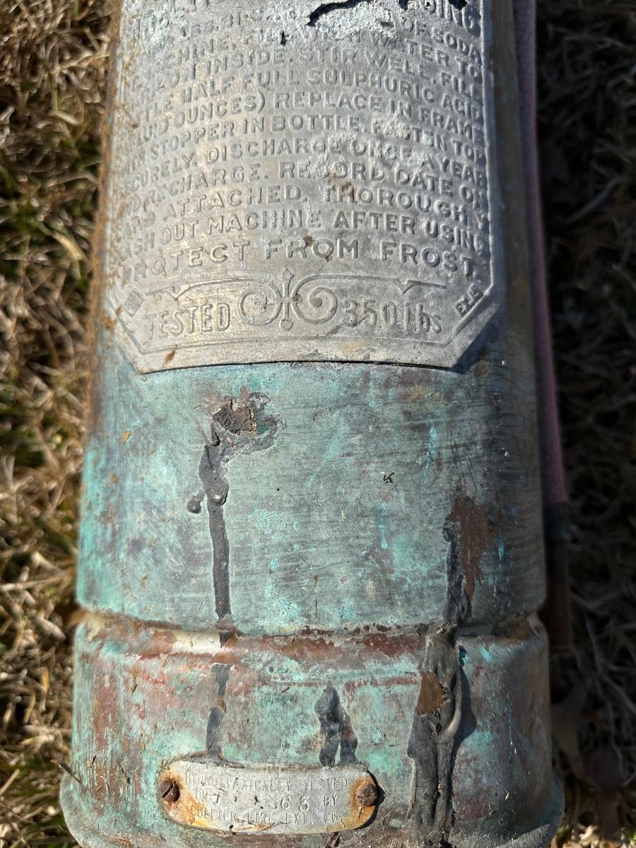 Original early 20th-century chemical fire extinguishers, sold together as a matched industrial pair. Both are authentic pre-WWII units with heavy copper/brass construction, original fittings, and deeply embossed instruction panels.
