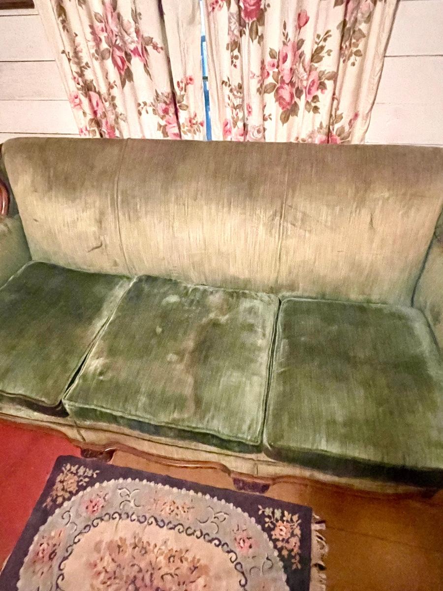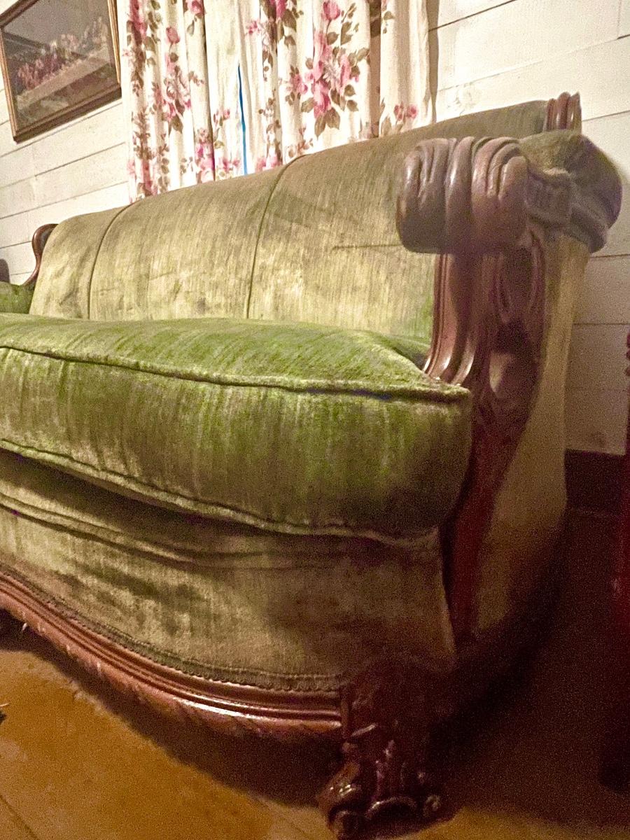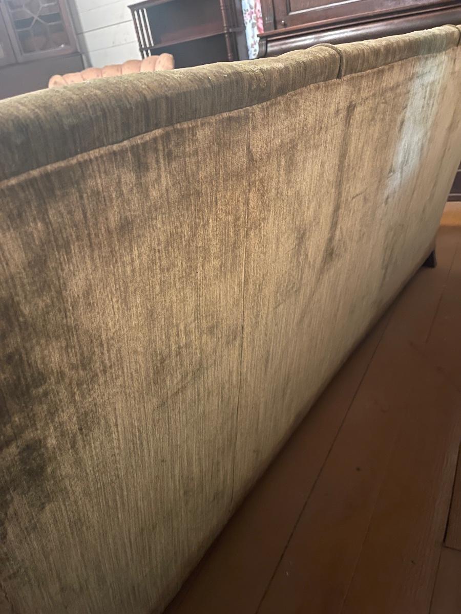 Wow! Crazy cool sofa! Seems to be such a plush velvet. It has some discoloration throughout but no rips in fabric. Some lose threads. Some chips out of wood. Very solid!! Check out all the wood detailing.it’s a beautiful sofa!