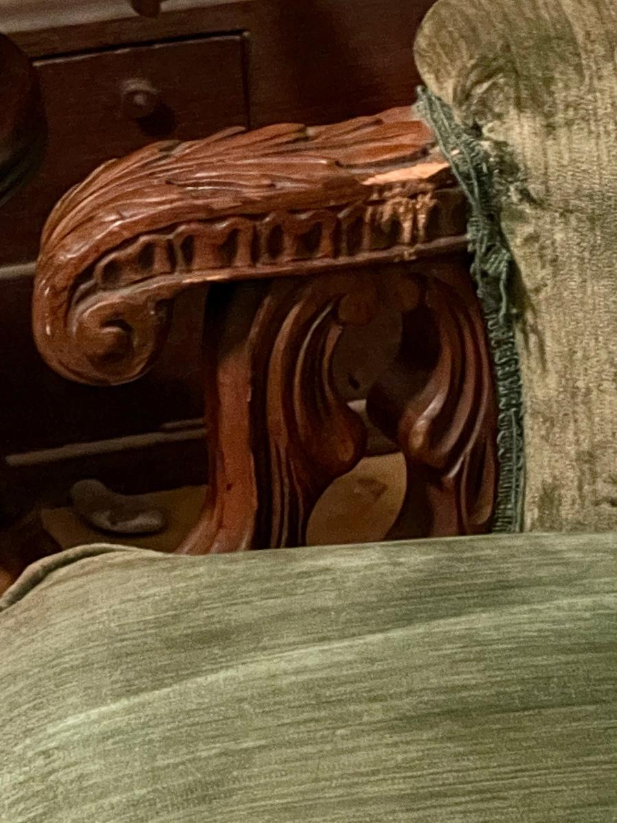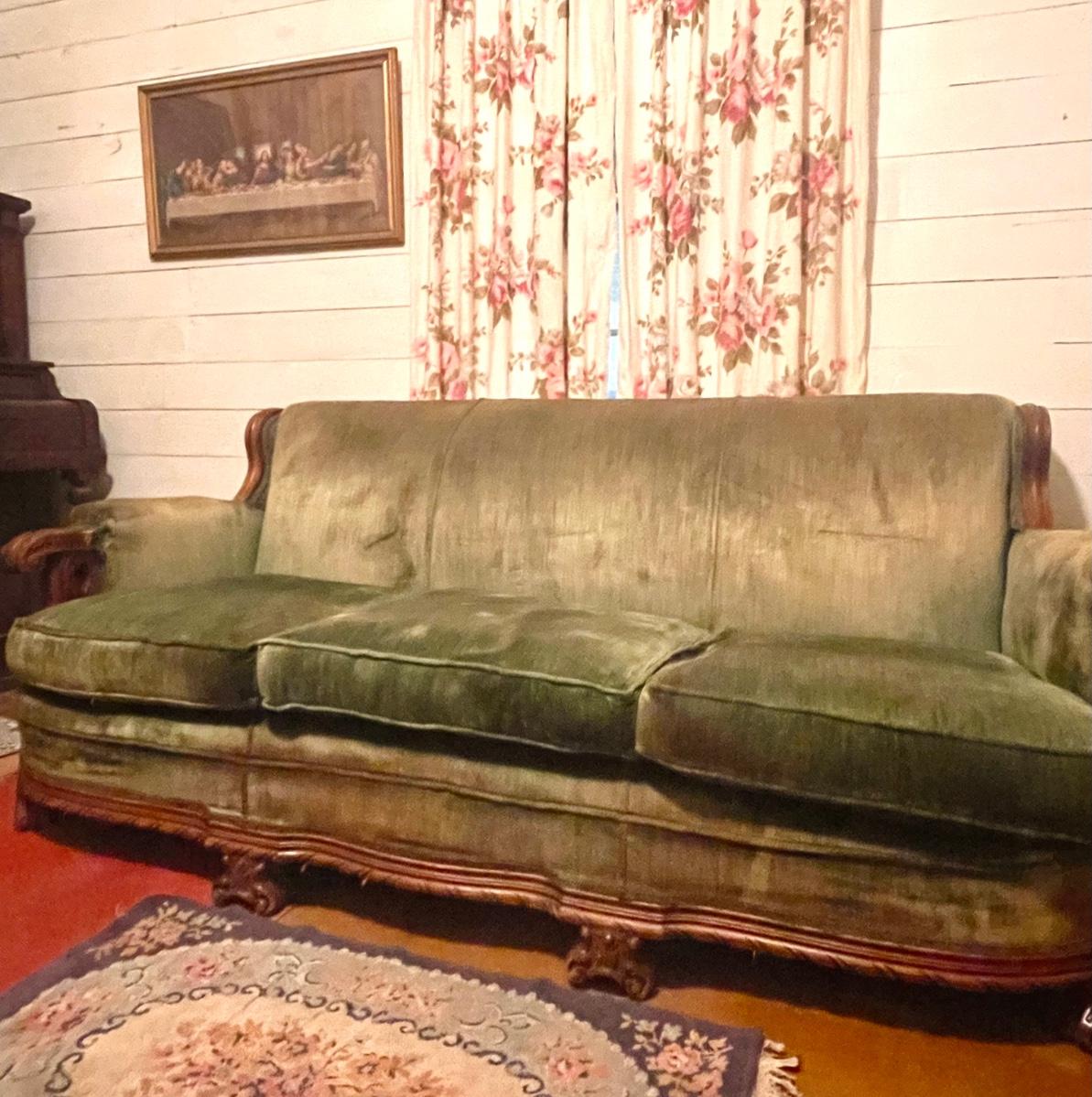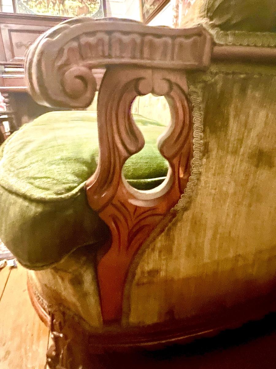 Wow! Crazy cool sofa! Seems to be such a plush velvet. It has some discoloration throughout but no rips in fabric. Some lose threads. Some chips out of wood. Very solid!! Check out all the wood detailing.it’s a beautiful sofa!