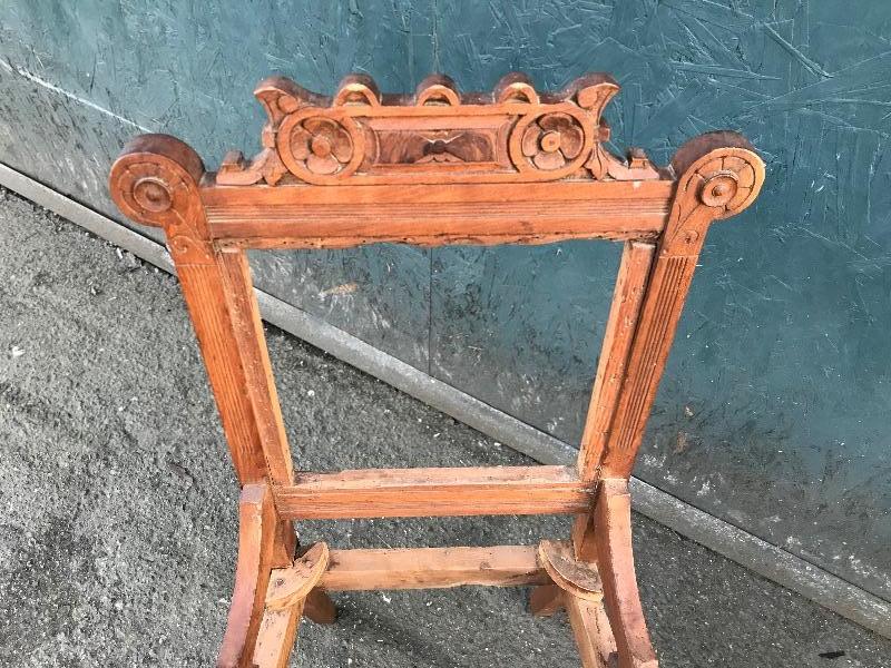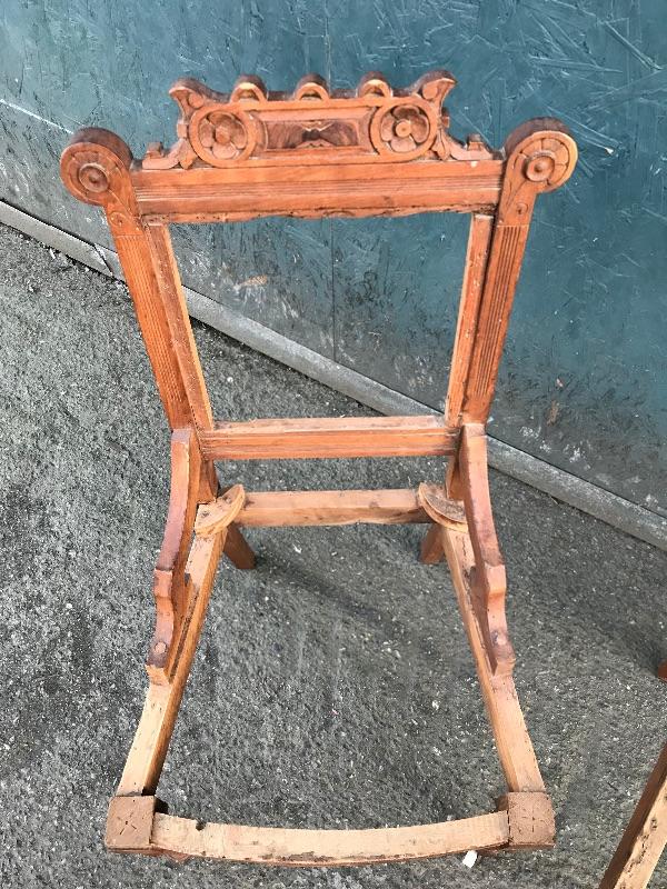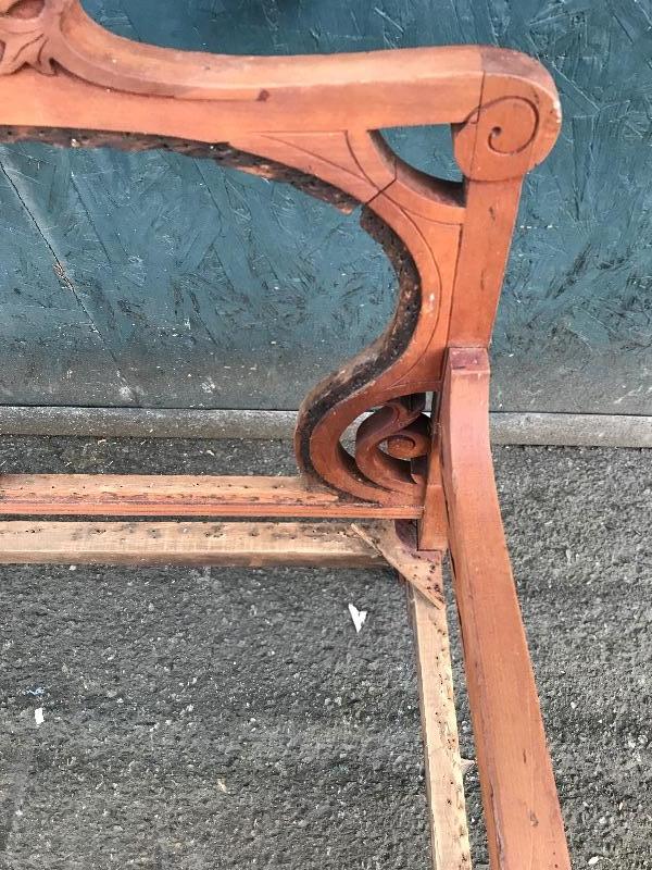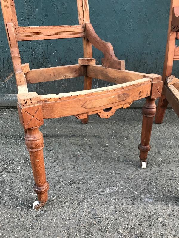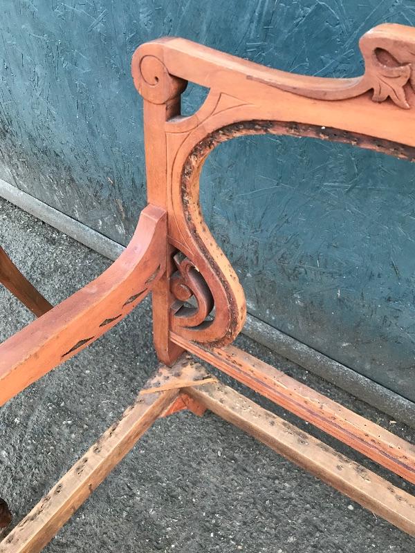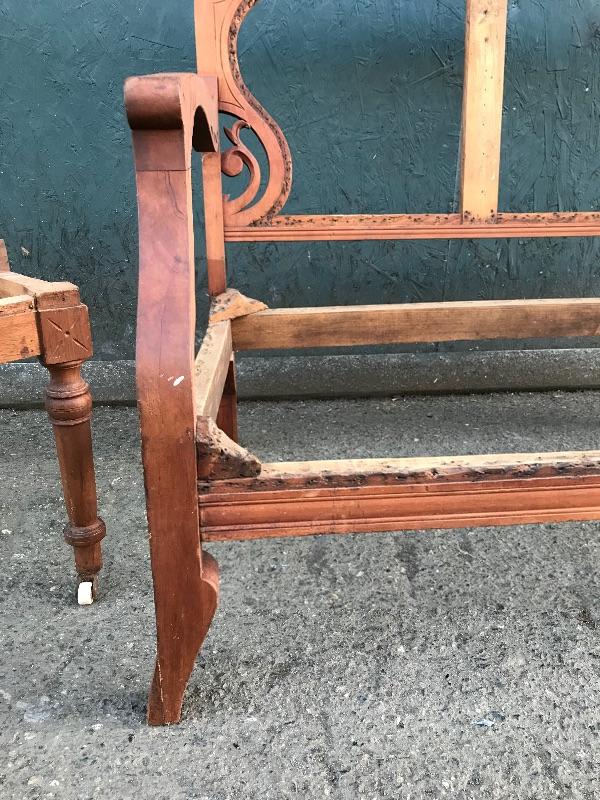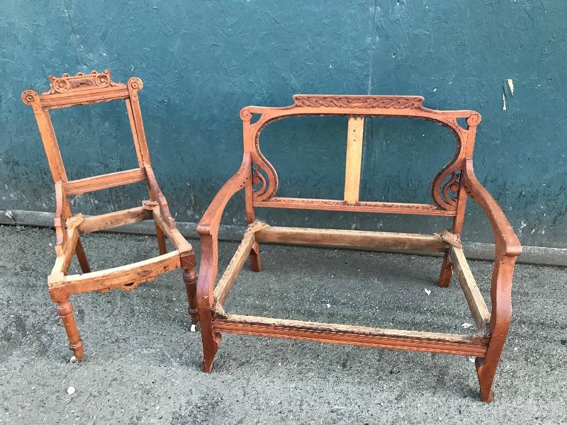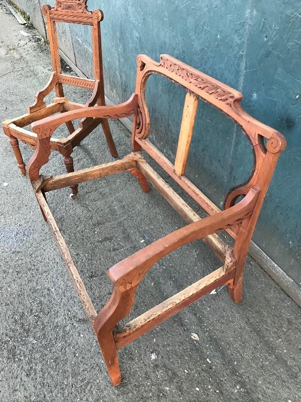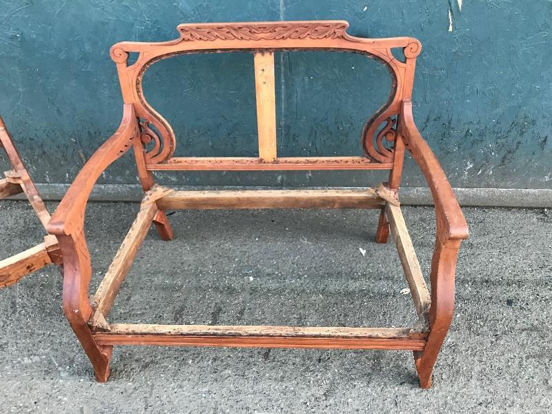 Charming pair! Dimensions of settee are 37"L x 24"W x 31"H back, and 10.5"H seat. Dimensions of chair are 19"L x 35"H.