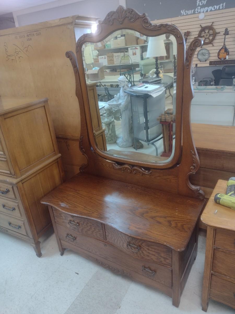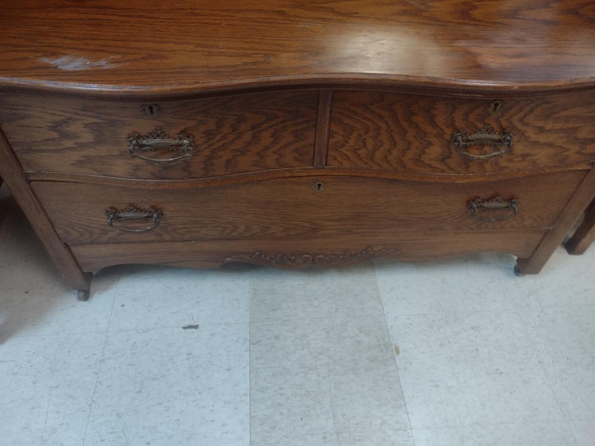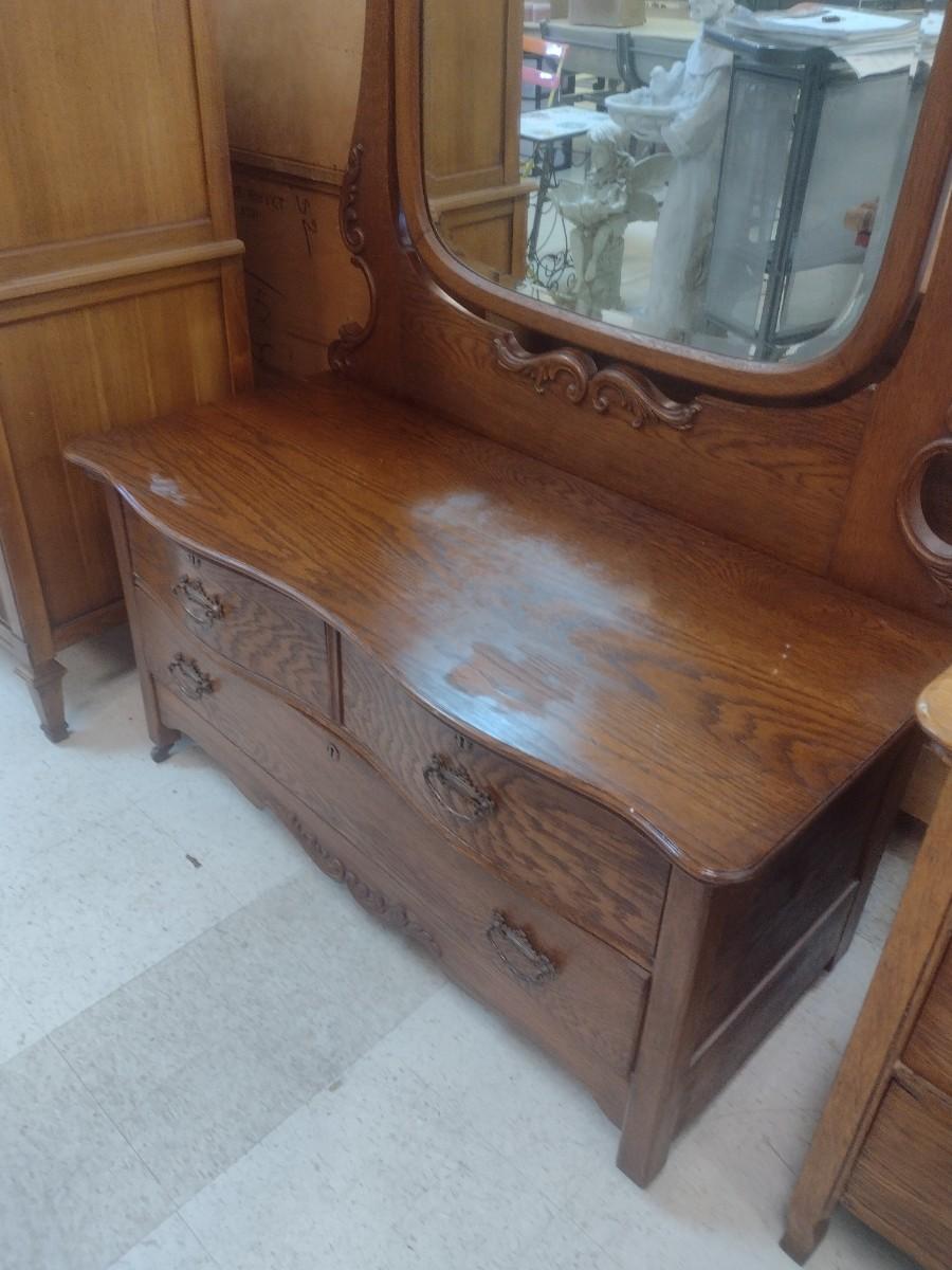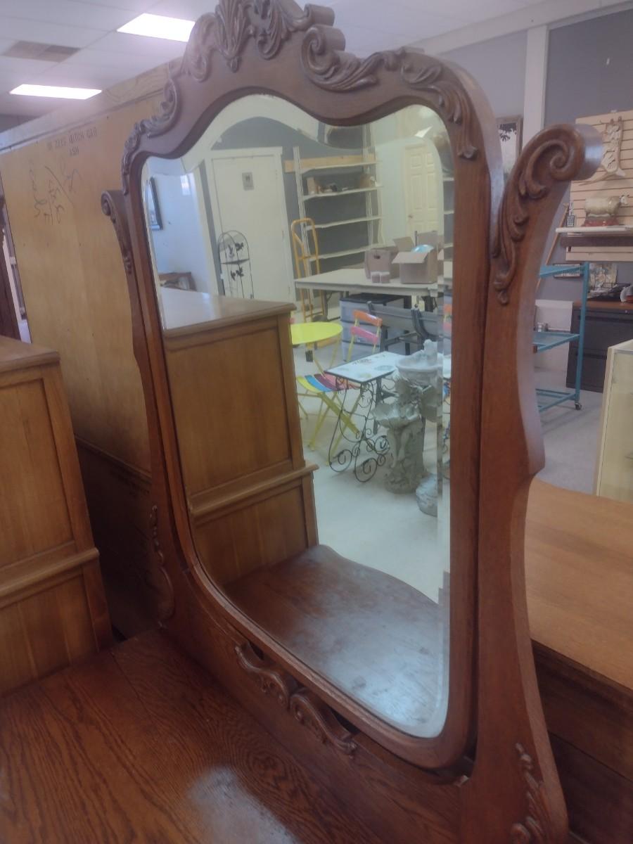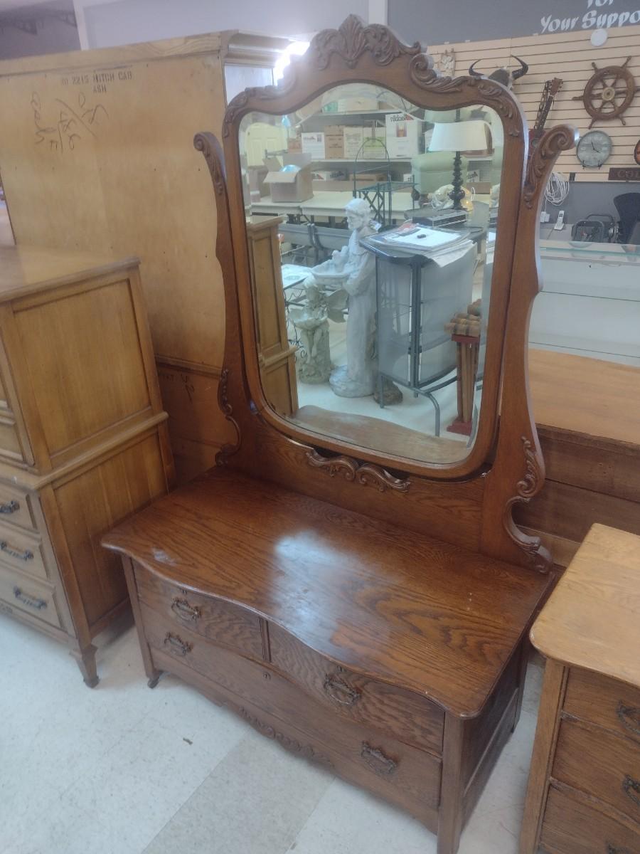 Antique Solid Oak Serpentine Two Over One Dresser with Harnessed Swivel Mirror