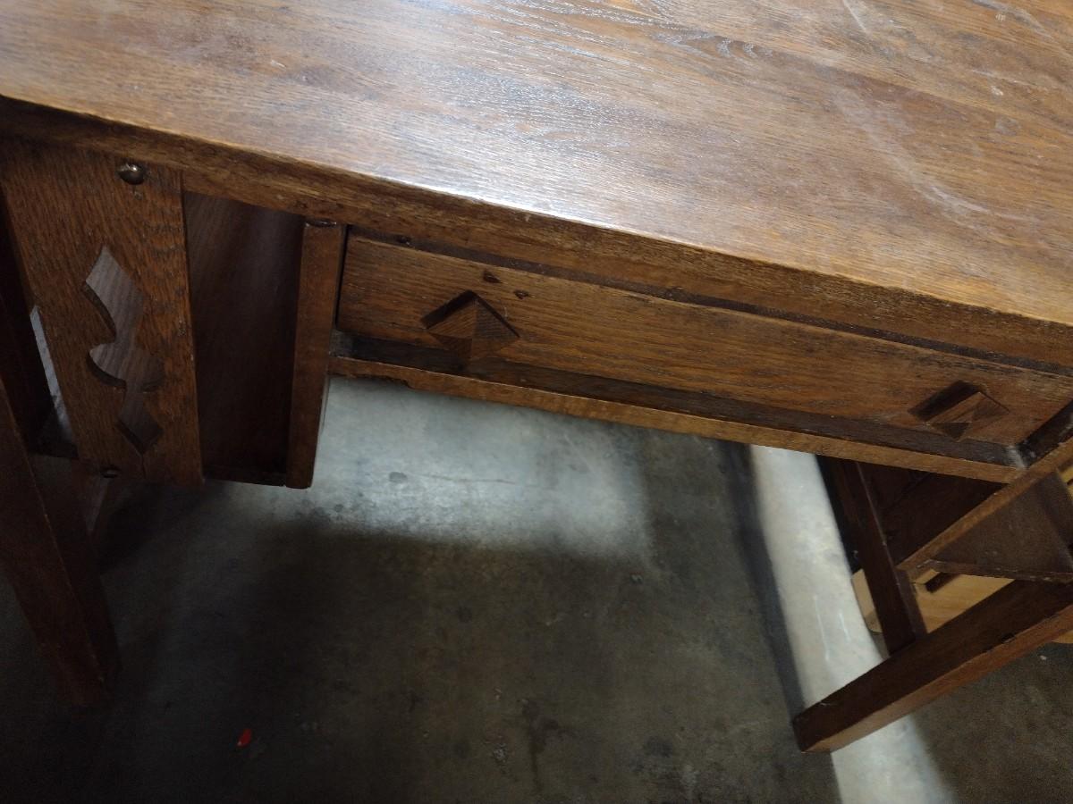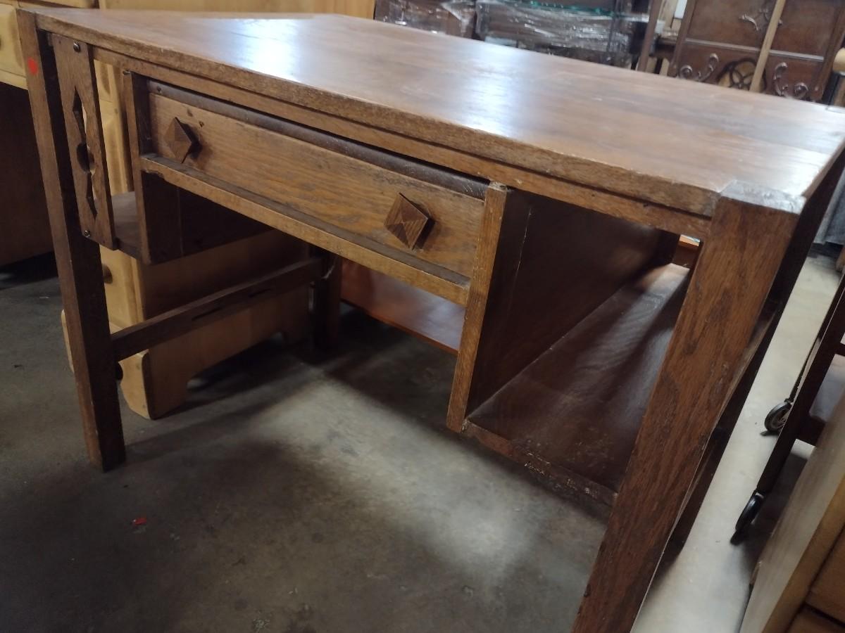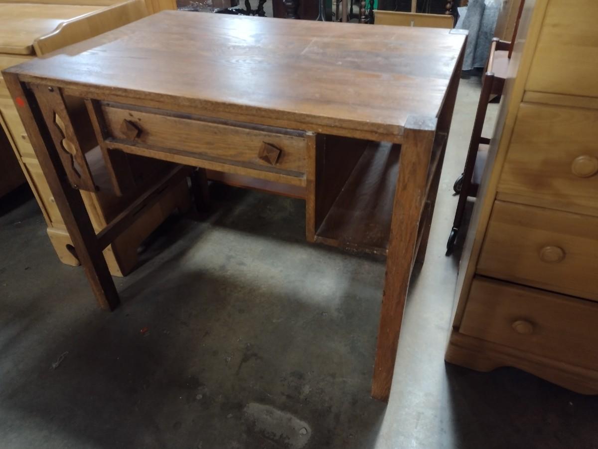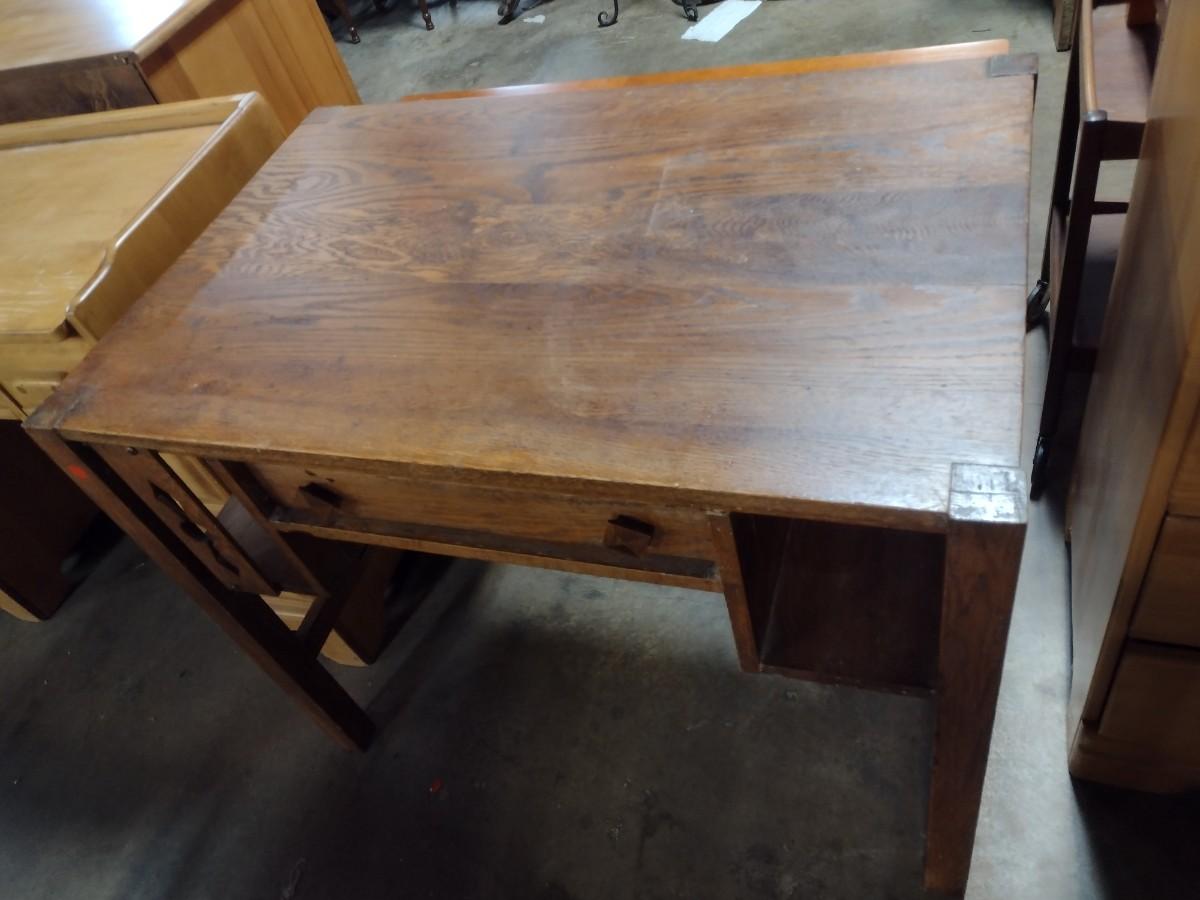 Antique Solid Oak Wood Mission Style Desk with Pull-Out Lidded Storage Drawer and Ink Well Space