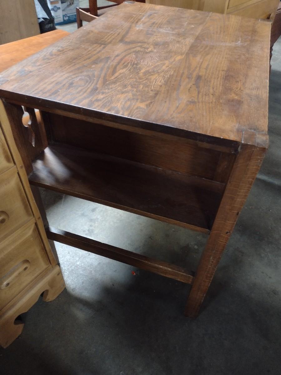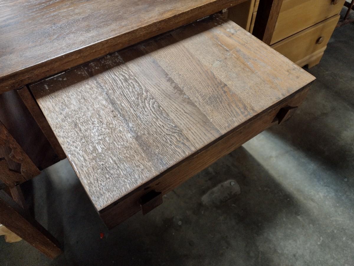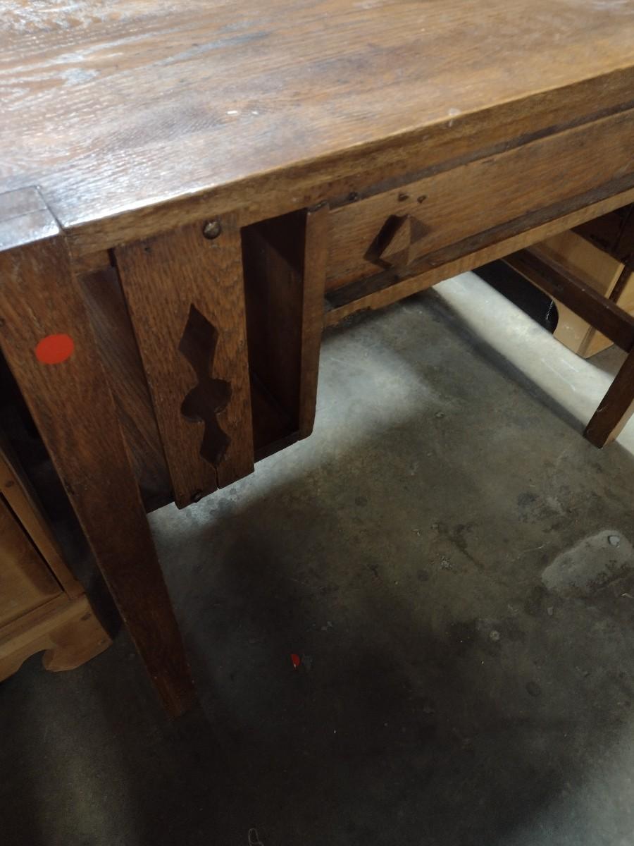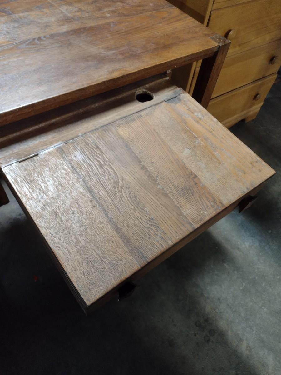 Antique Solid Oak Wood Mission Style Desk with Pull-Out Lidded Storage Drawer and Ink Well Space