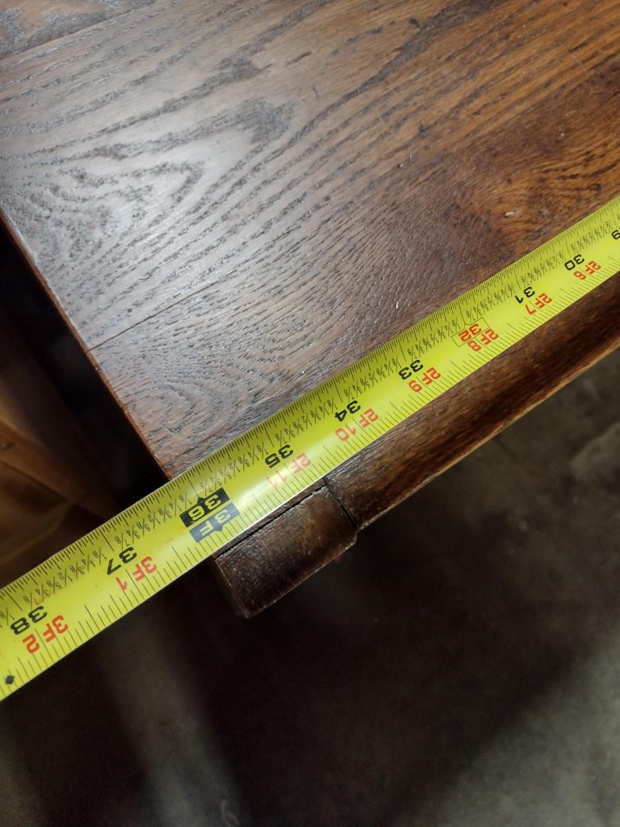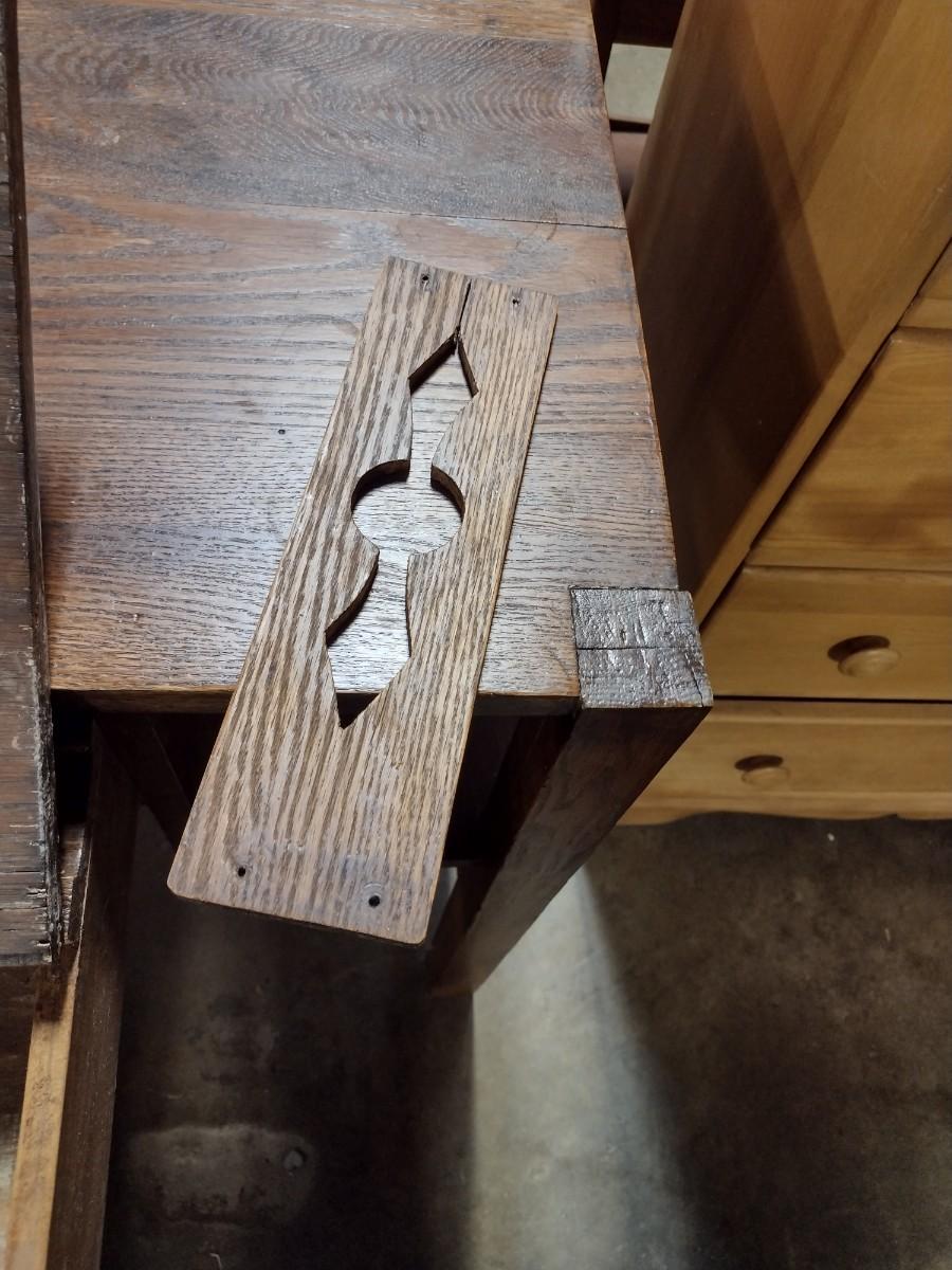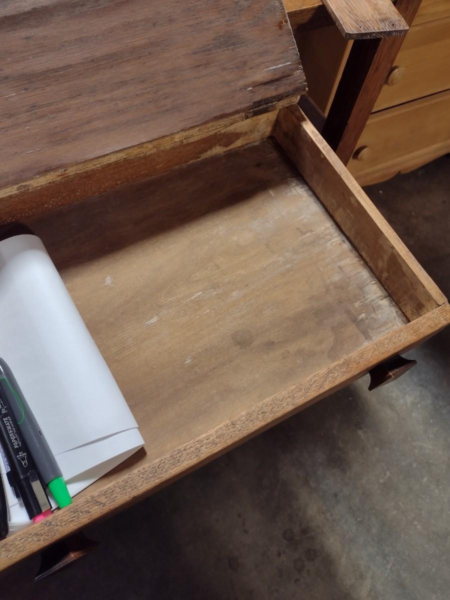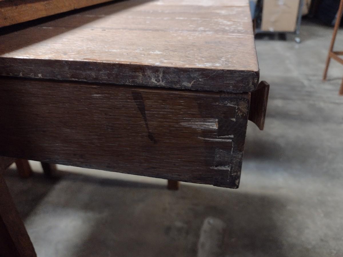Antique Solid Oak Wood Mission Style Desk with Pull-Out Lidded Storage Drawer and Ink Well Space