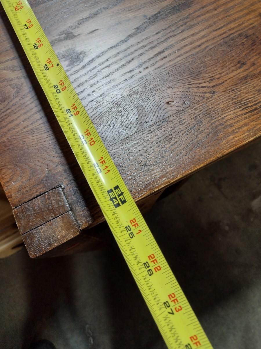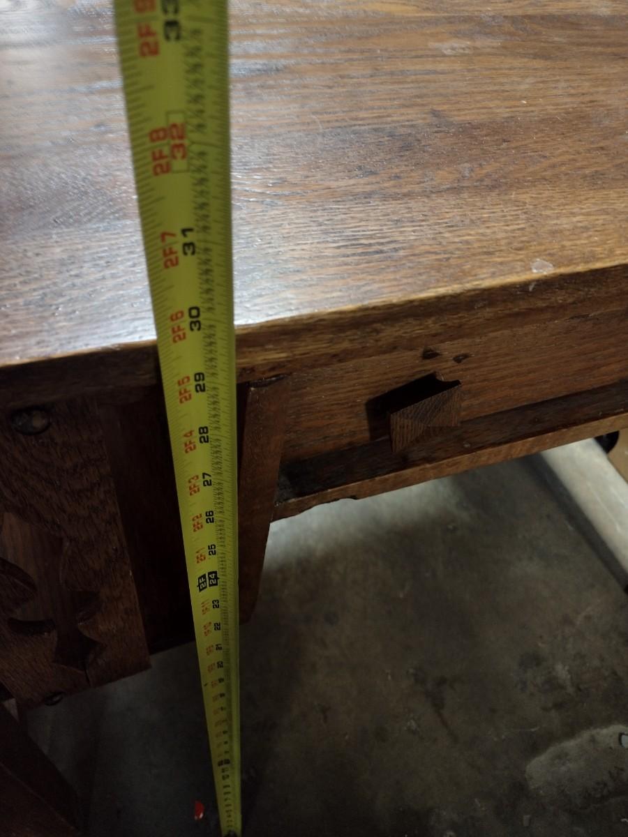 Antique Solid Oak Wood Mission Style Desk with Pull-Out Lidded Storage Drawer and Ink Well Space. Bottom stretcher board is missing. See all pictures for condition issues.
