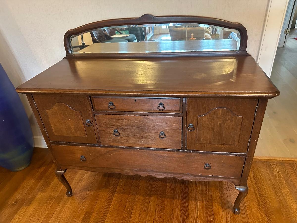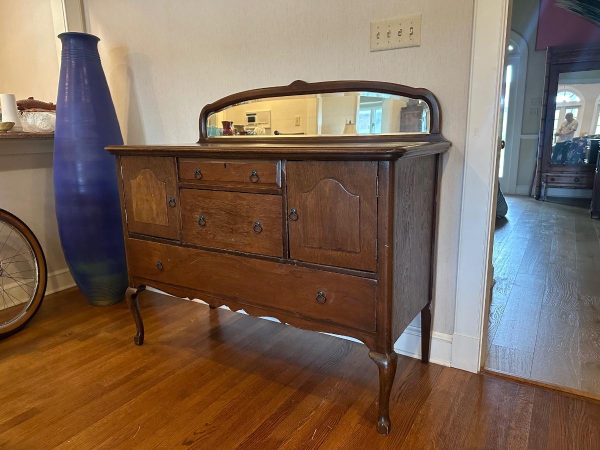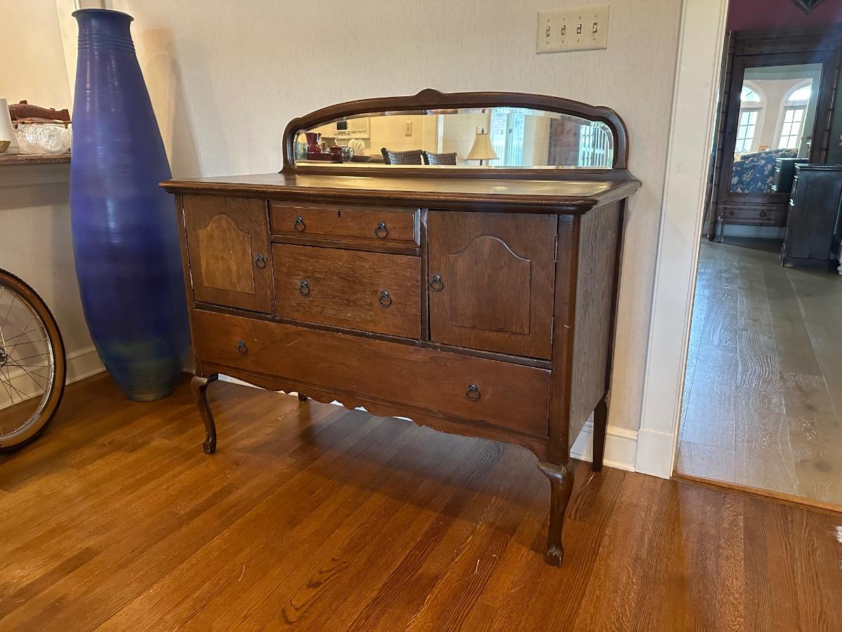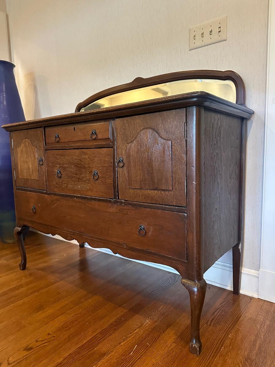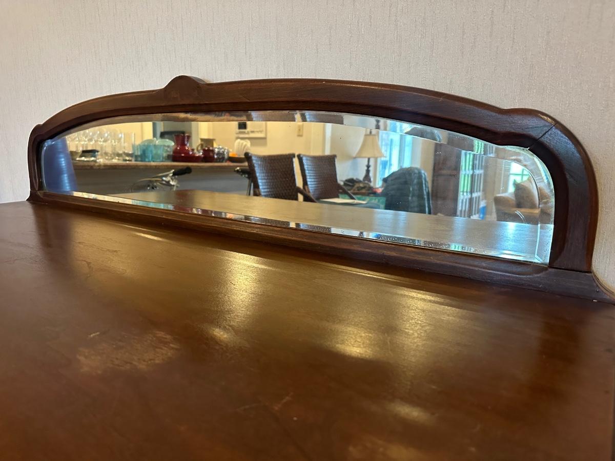 This beautiful antique sideboard has 3 drawers and 2 cabinets. It has the original mirror. There is some minor wear on the piece due to its age, see pictures.